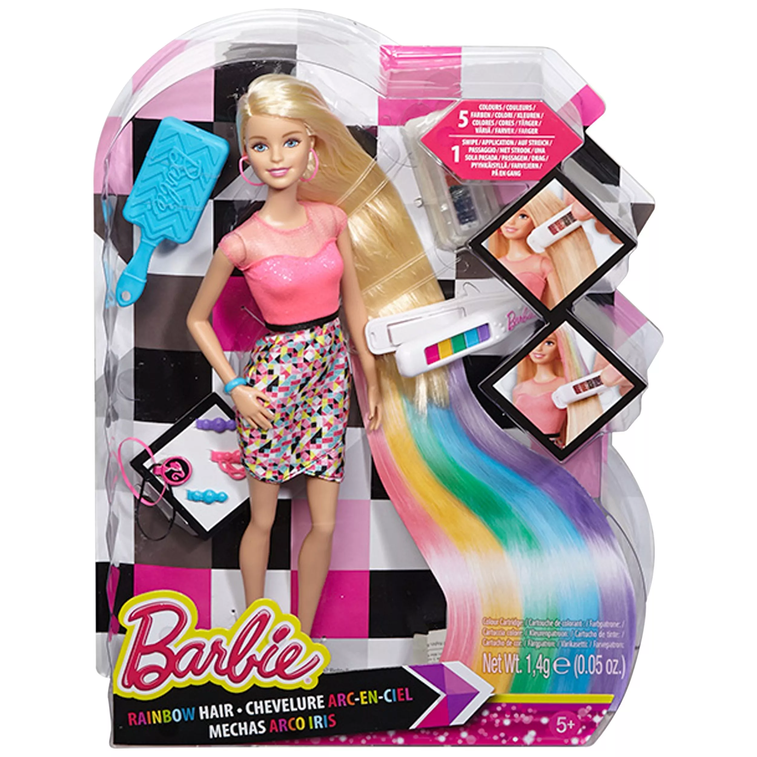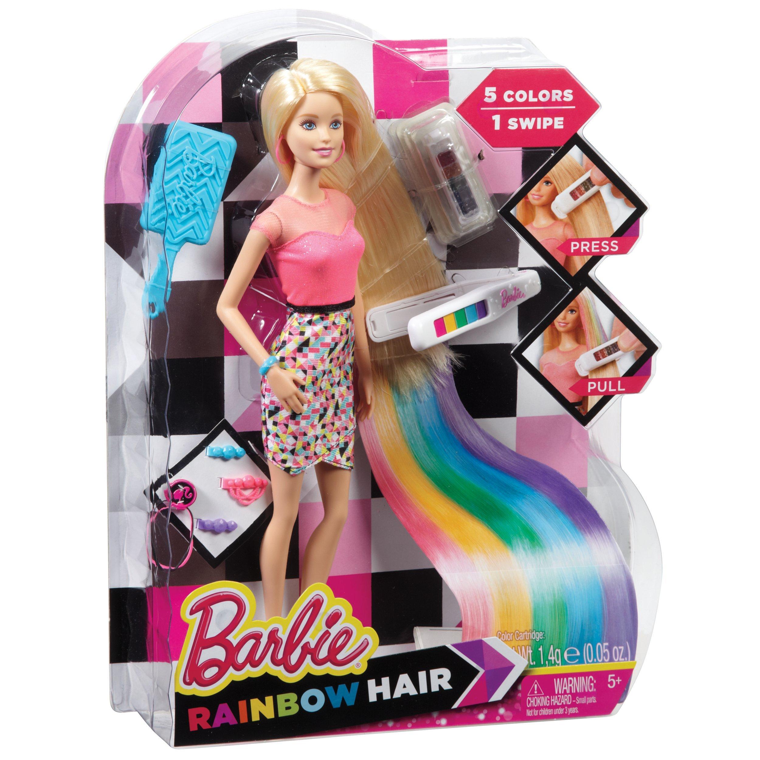 Includes: Barbie doll wearing fashion and accessories; 1 hair tool; 1 rainbow colour cartridge, 3x hair clips, 2x rubber bands, 1 brush.