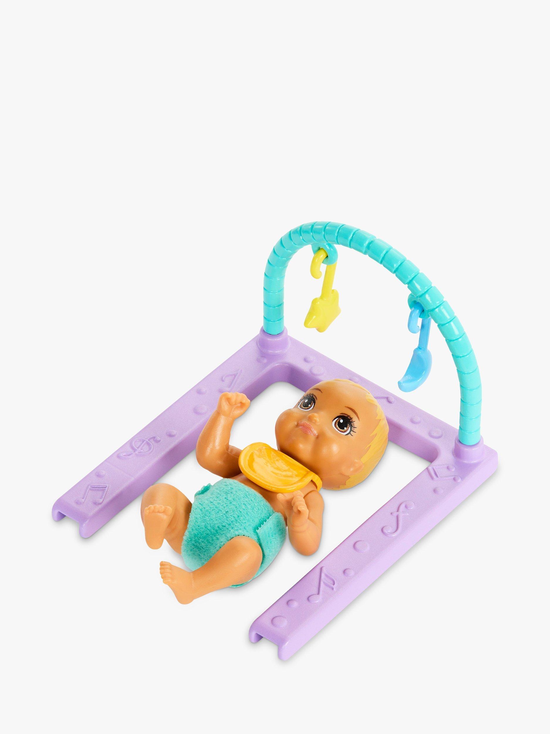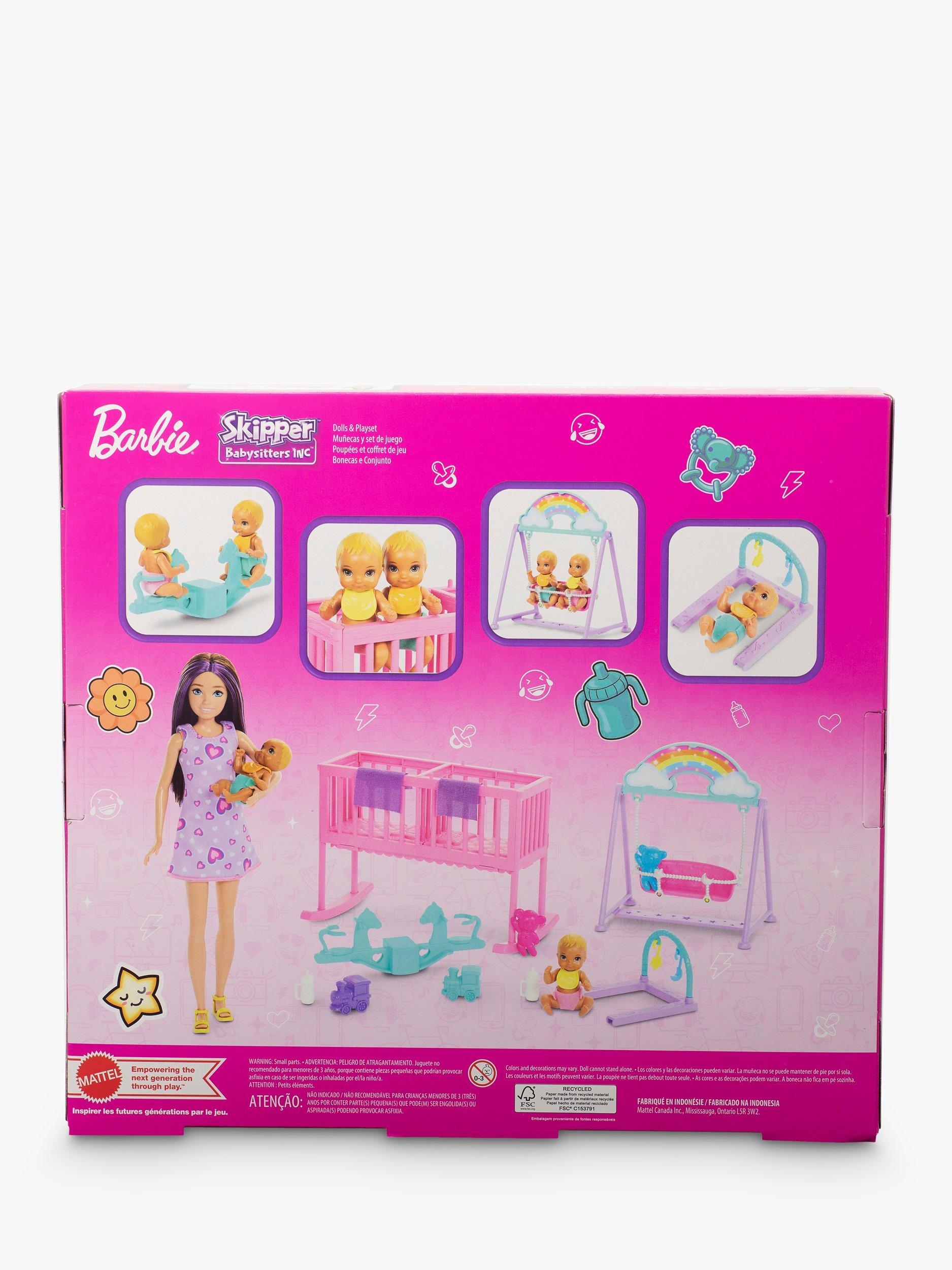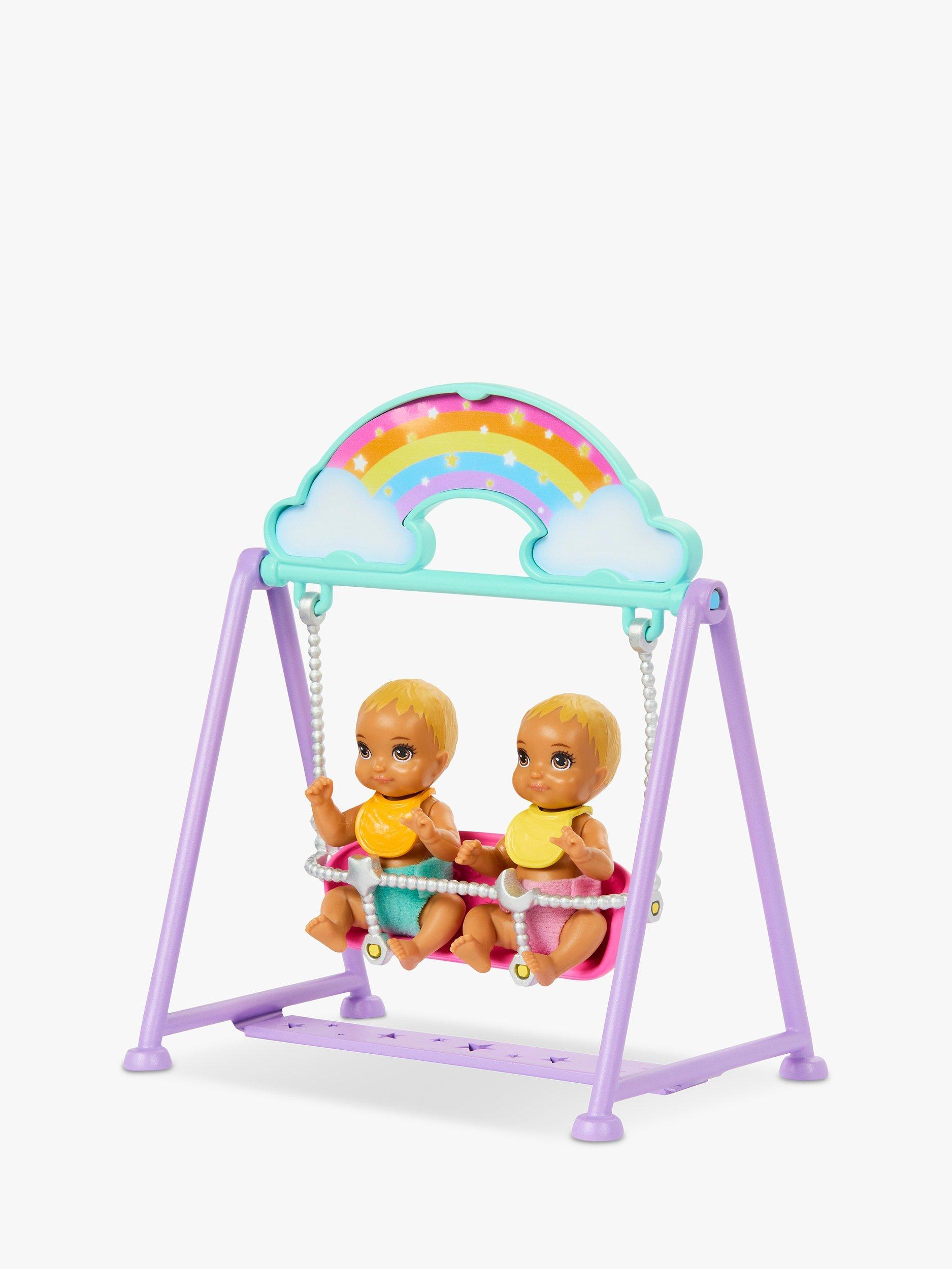 It's double the fun and cuteness with this Barbie twinning nursery playset! Skipper, the teenage sister of Barbie, has two of everything to babysit the twin dolls, both wearing removable diapers. There's a crib for two that really rocks, a rainbow swing with a seat for the twins, a bouncing baby see-saw and a play arch that can fit on the crib or be used on the ground.