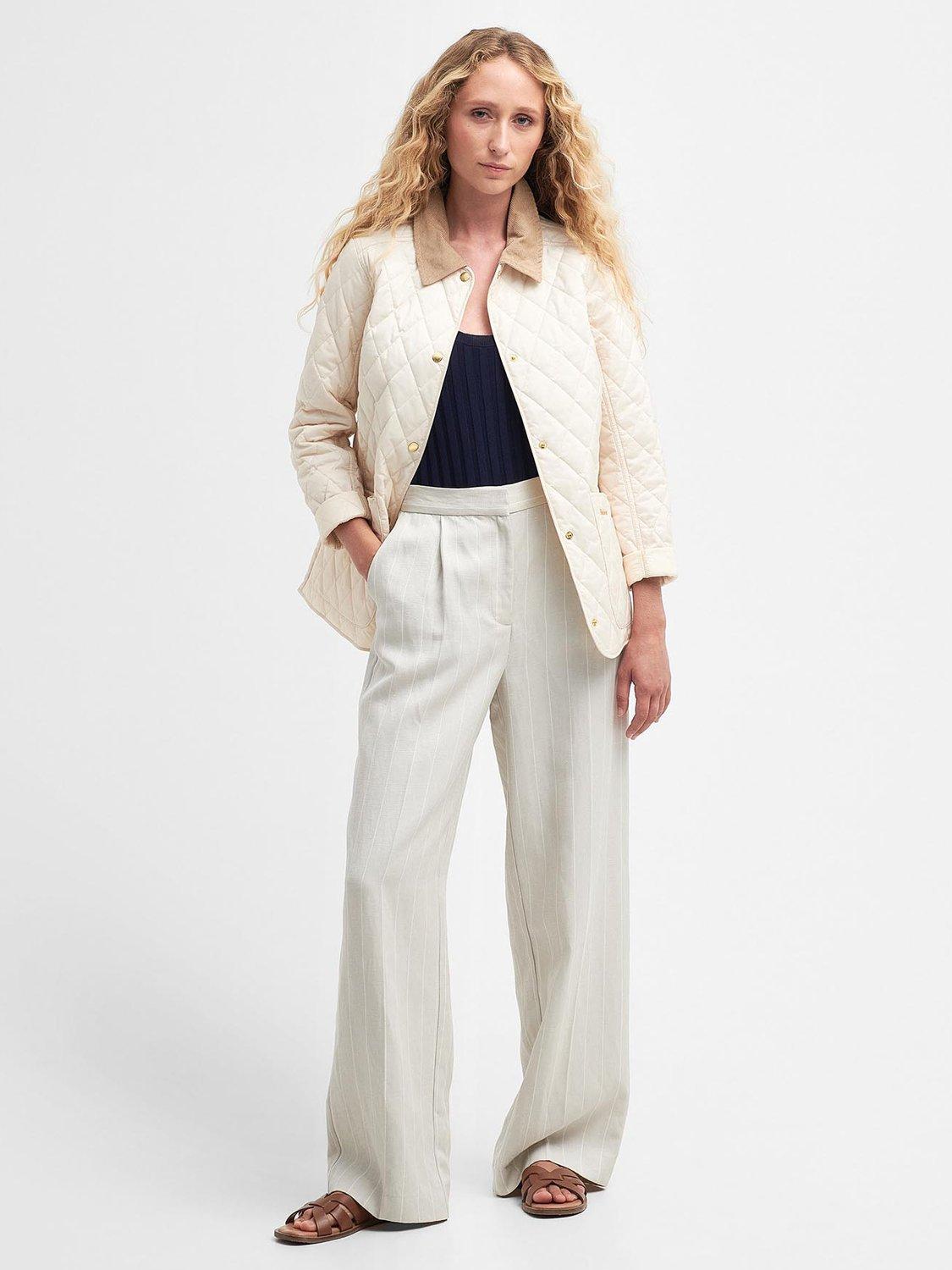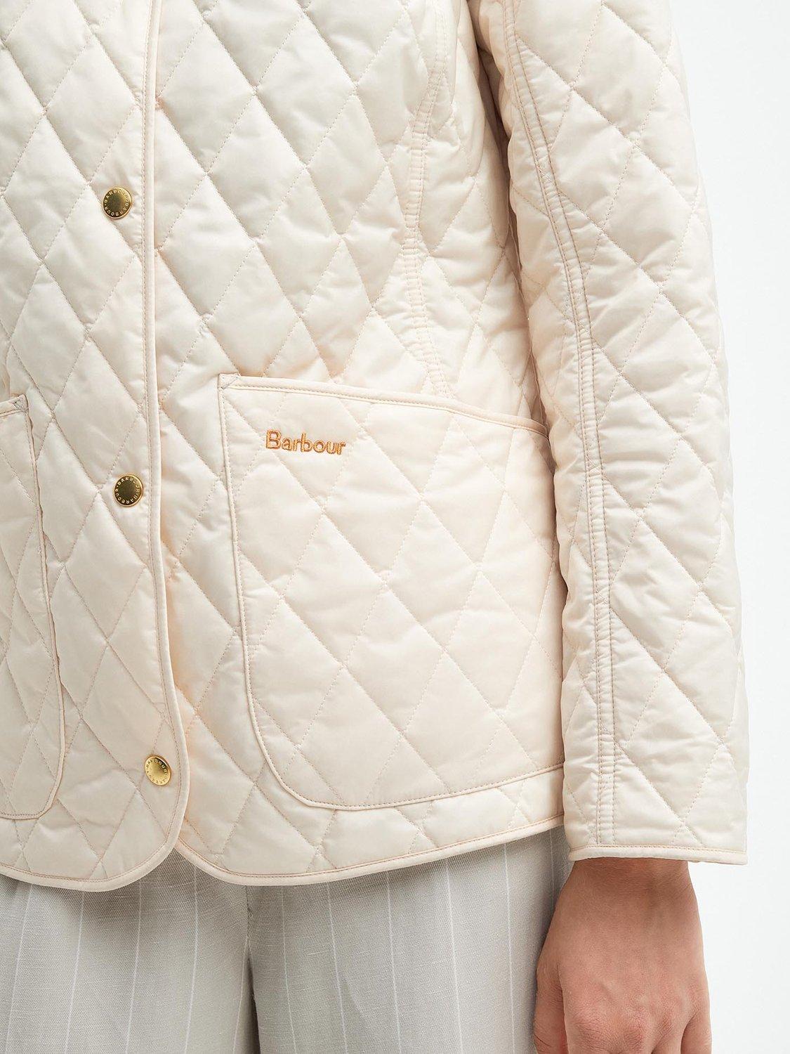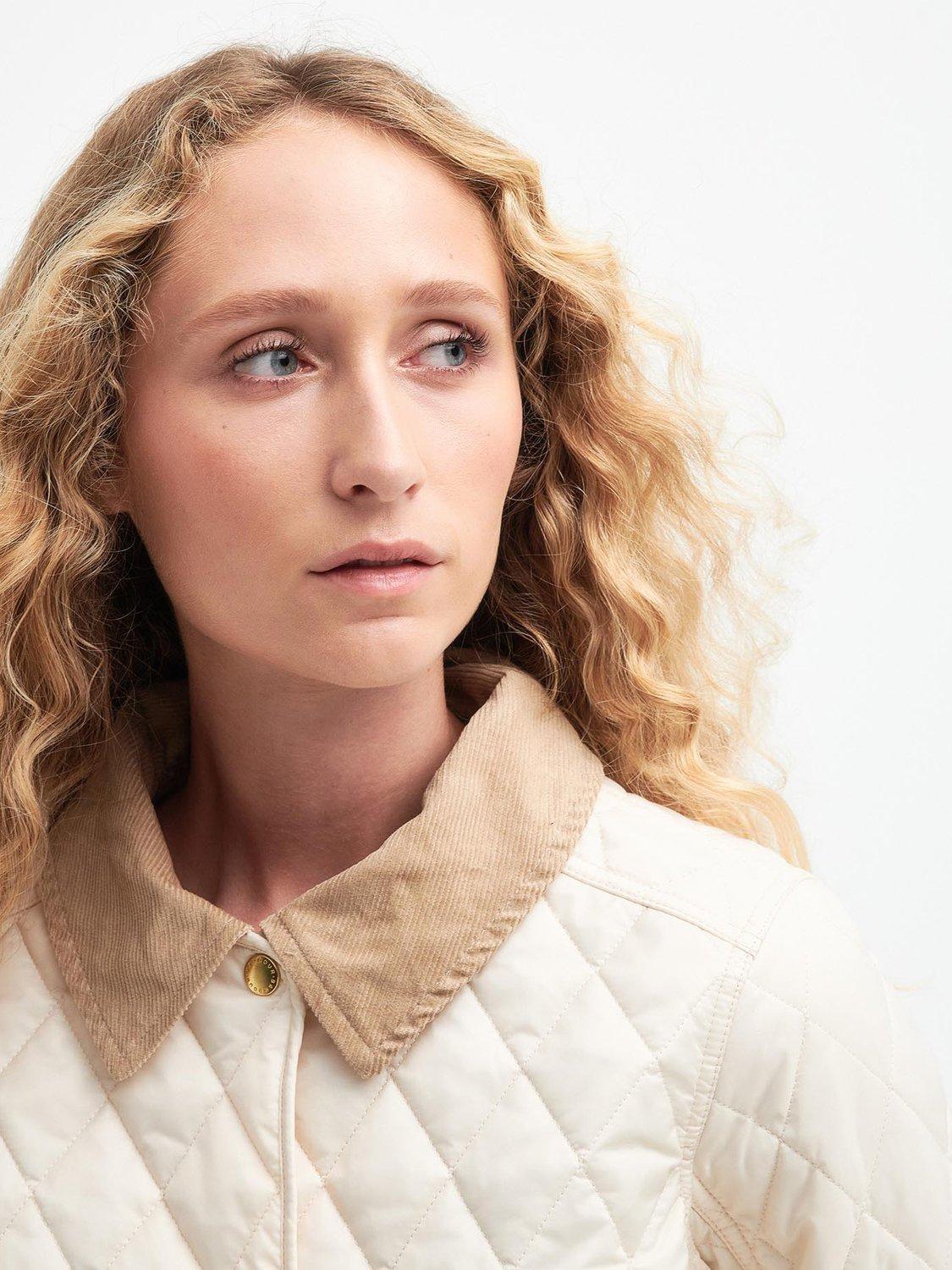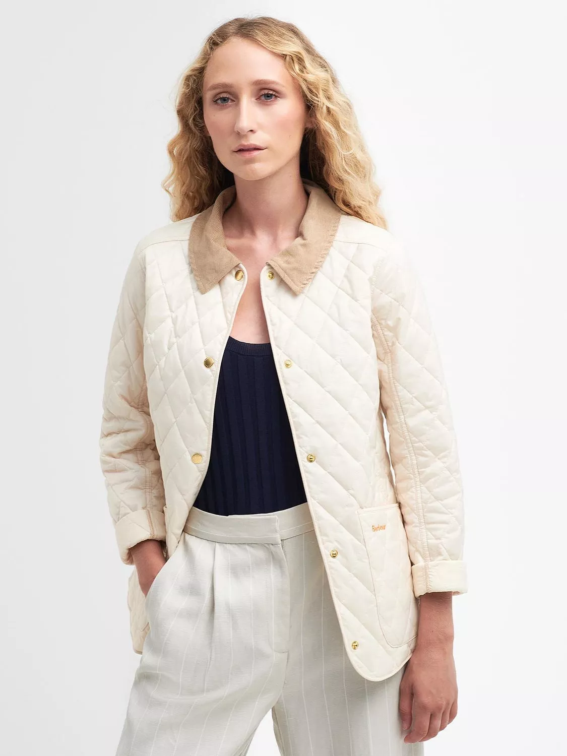 This stylish quilted jacket is designed with flatteringly shaped body seams for a beautifully feminine silhouette. The sit-down cord collar and diamond-quilted outer create the signature Barbour look.