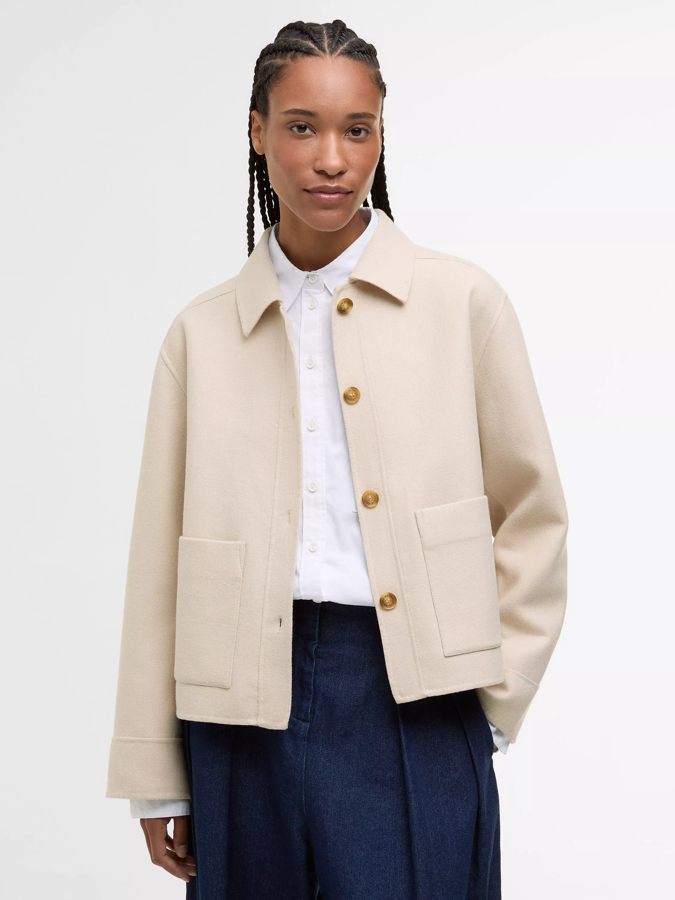 Crafted from a double-faced wool blend, the Barbour Ashdon Overshirt offers warmth and comfort. Featuring two patch pockets and branded mock horn buttons, this overshirt is ideal for layering or wearing on its own, delivering a classic look with a modern edge.