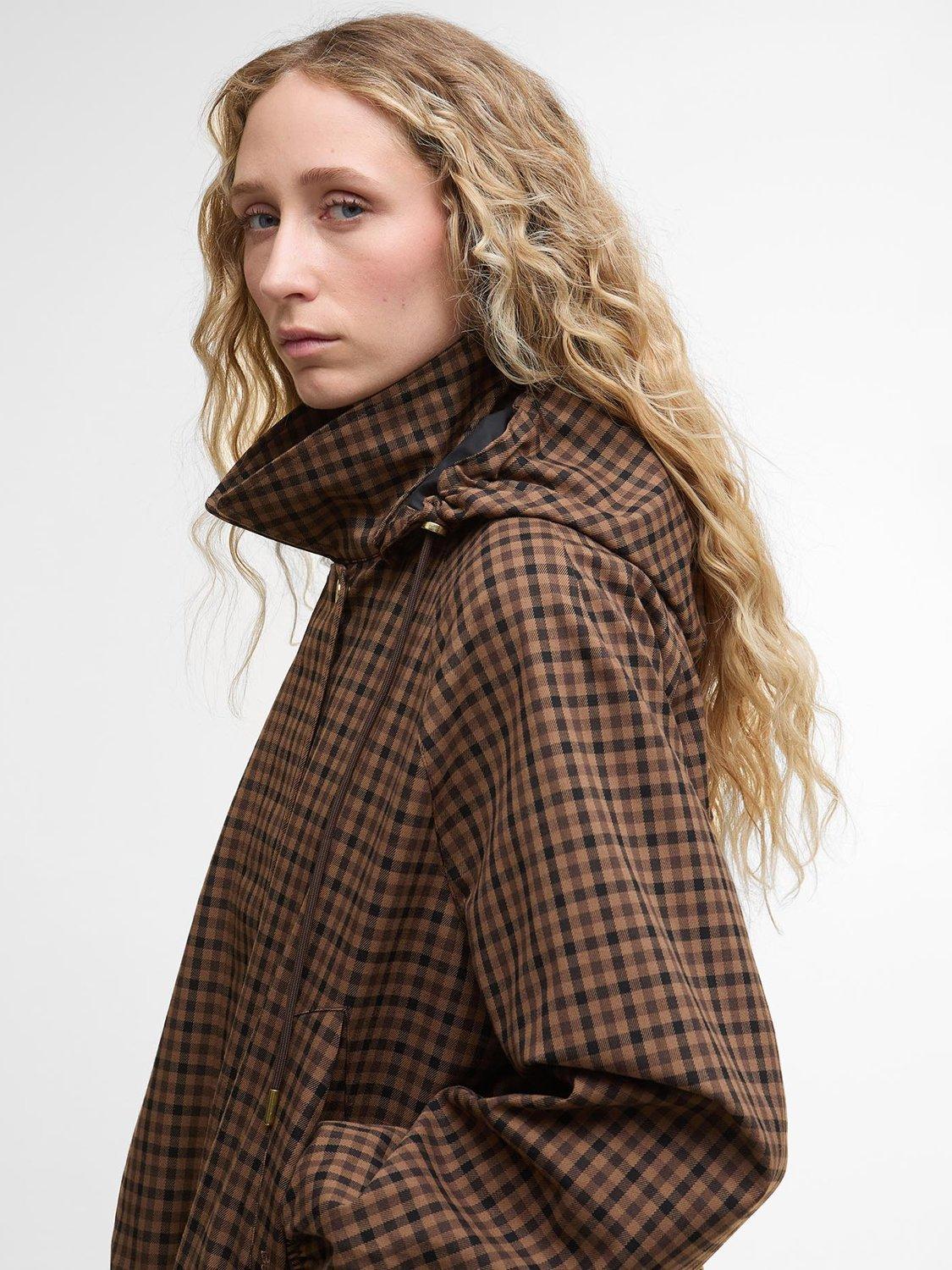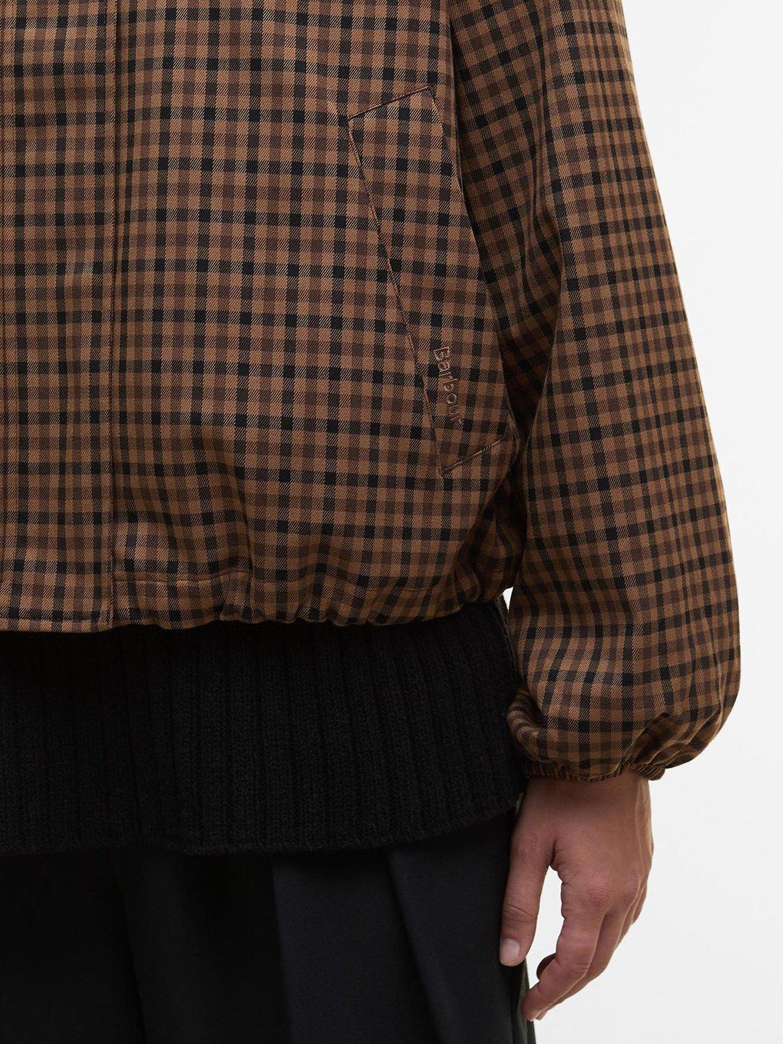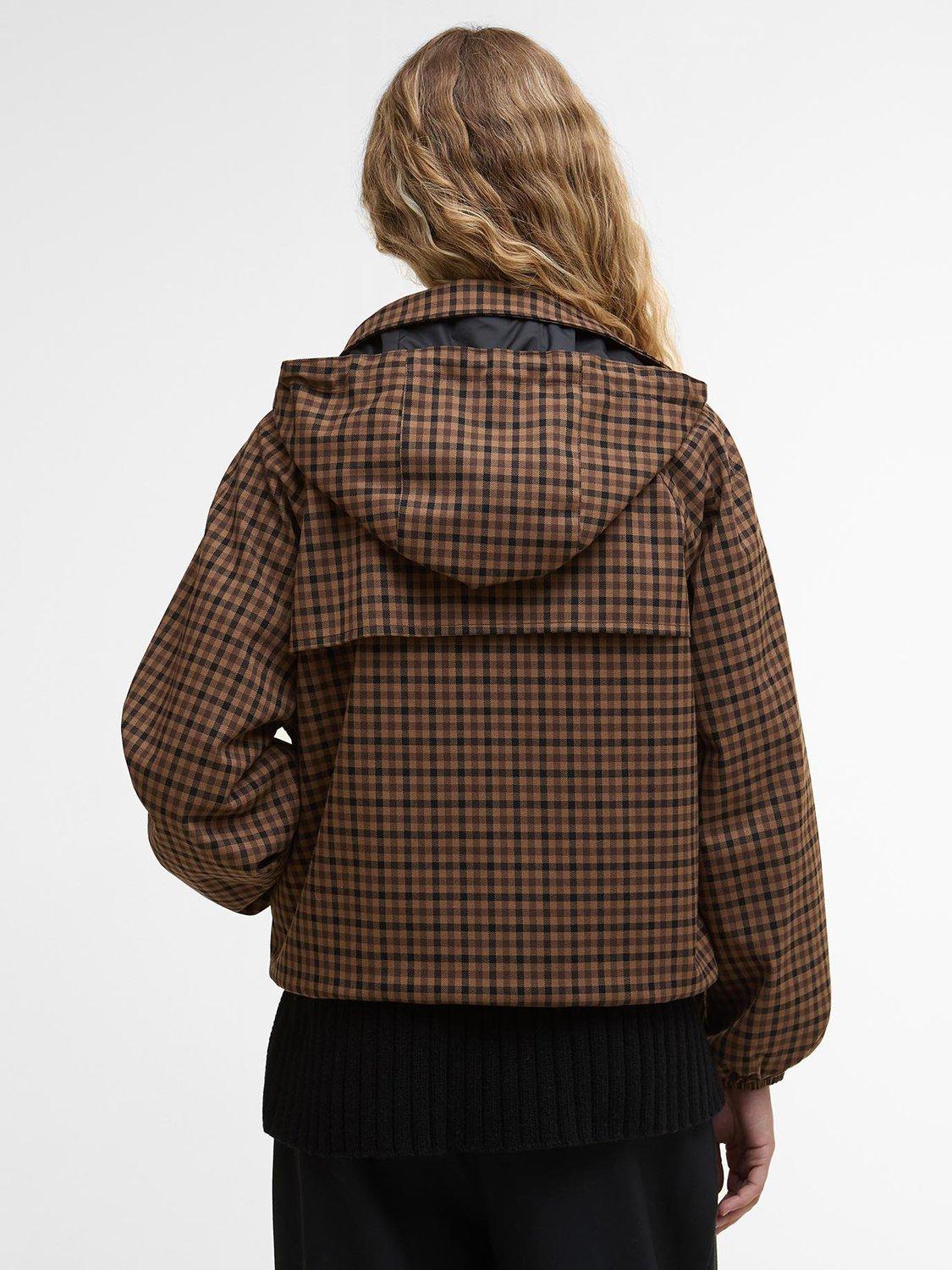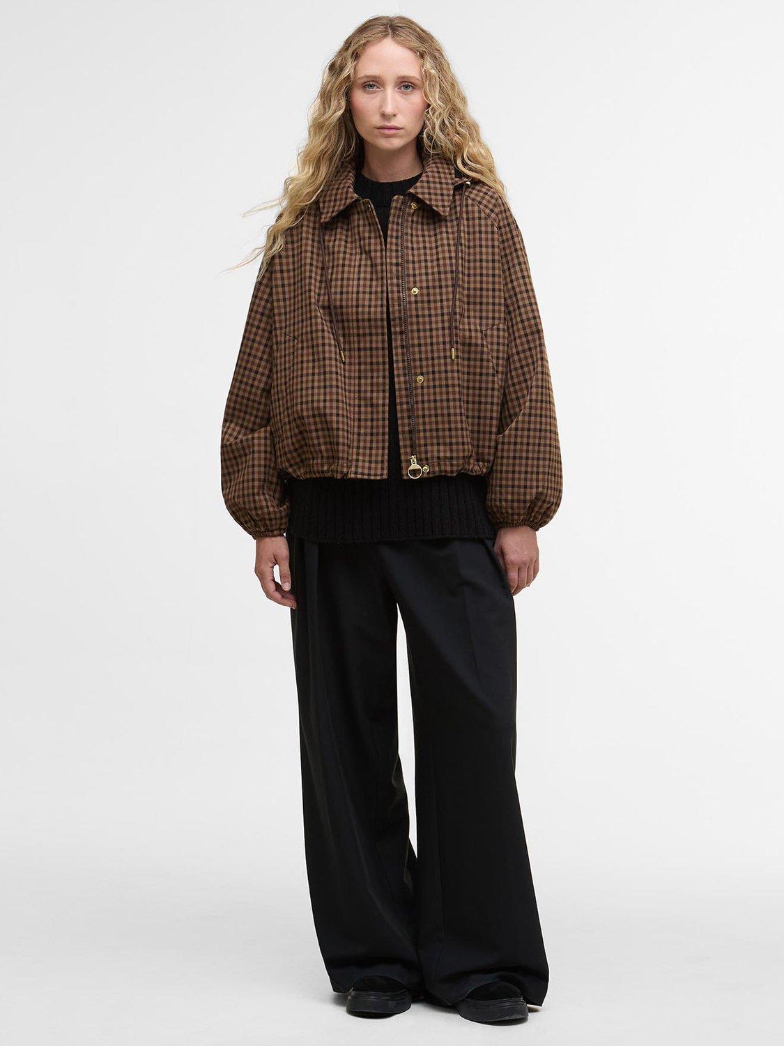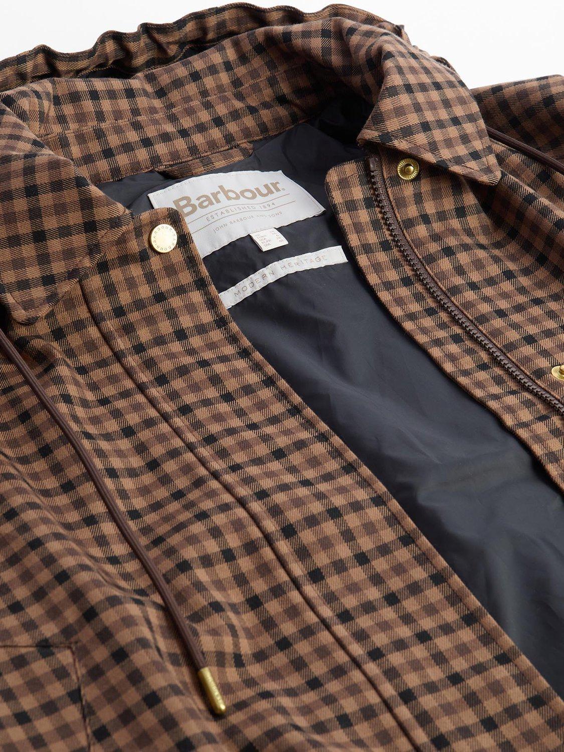 Transport your favourite casual jacket into the cooler months with the Barbour Audrey Showerproof Jacket. This jacket takes inspiration from a bomber jacket silhouette thanks to its blouson sleeves and elasticated cuffs. Detailed with a sit-down collar, detachable hood and drawcord hem, this liner jacket is complete with an all-over check to give it a statement finishing touch.