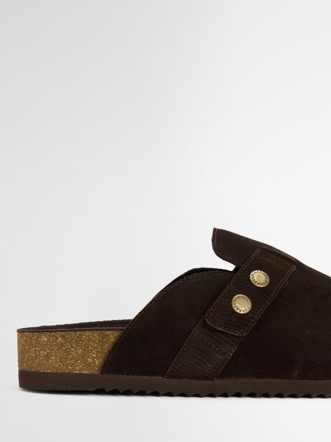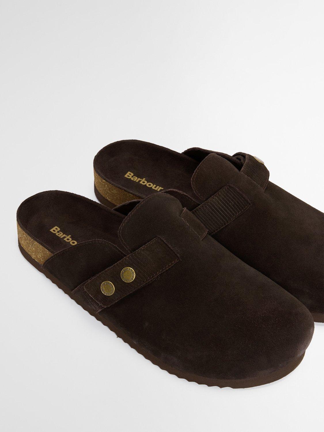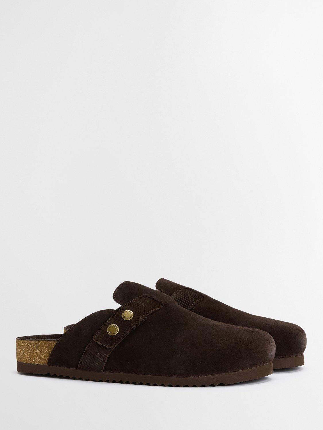 The Barbour Bowman suede mules offer a stylish twist on classic comfort. Featuring a closed-toe design with signature Barbour snap fastenings, these mules sit on a rugged razor-tooth outsole for grip and durability. With a real cork footbed, they provide natural support and cushioning, ideal for effortless, all-day wear.