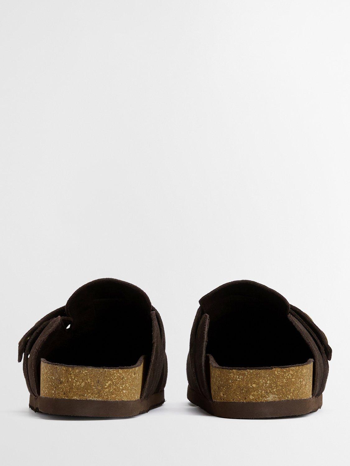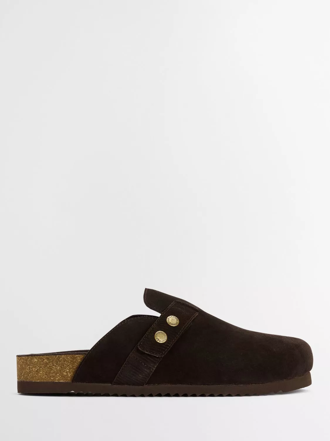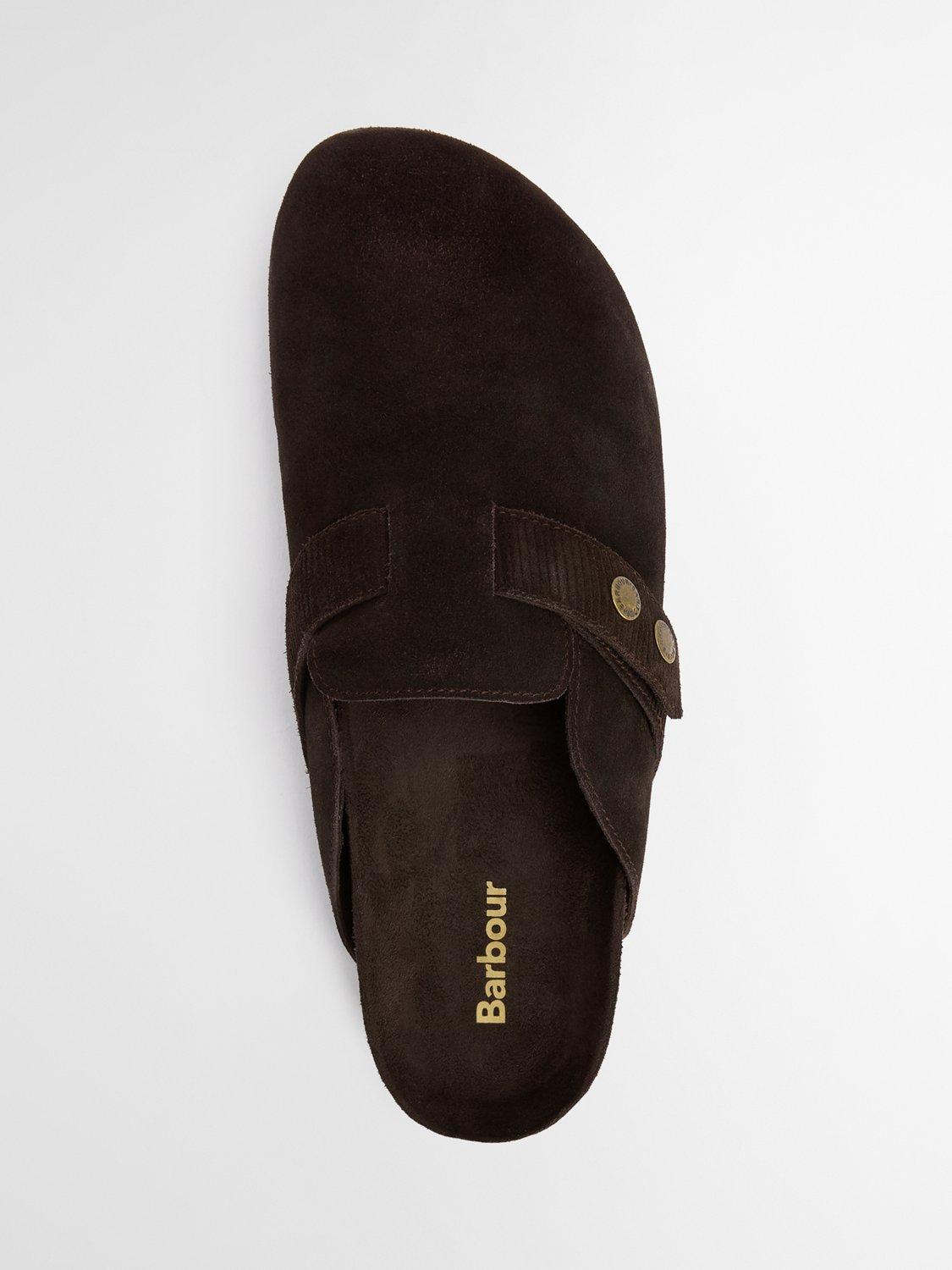 The Barbour Bowman suede mules offer a stylish twist on classic comfort. Featuring a closed-toe design with signature Barbour snap fastenings, these mules sit on a rugged razor-tooth outsole for grip and durability. With a real cork footbed, they provide natural support and cushioning, ideal for effortless, all-day wear.