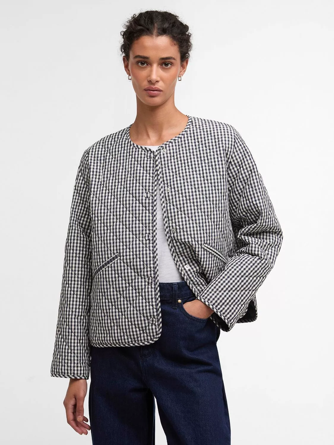 The Barbour Cashel Gingham Collarless Quilted Jacket is a lightweight, versatile layer perfect for transitional weather. Crafted with a short box quilt layered over seasonal tartan, it offers warmth without bulk. Featuring a self-covered stud front fastening, double jet pockets, and self-binding trim to cuffs and hem, this jacket combines practical functionality with timeless Barbour style, delivering a modern, heritage-inspired piece for effortless everyday wear.