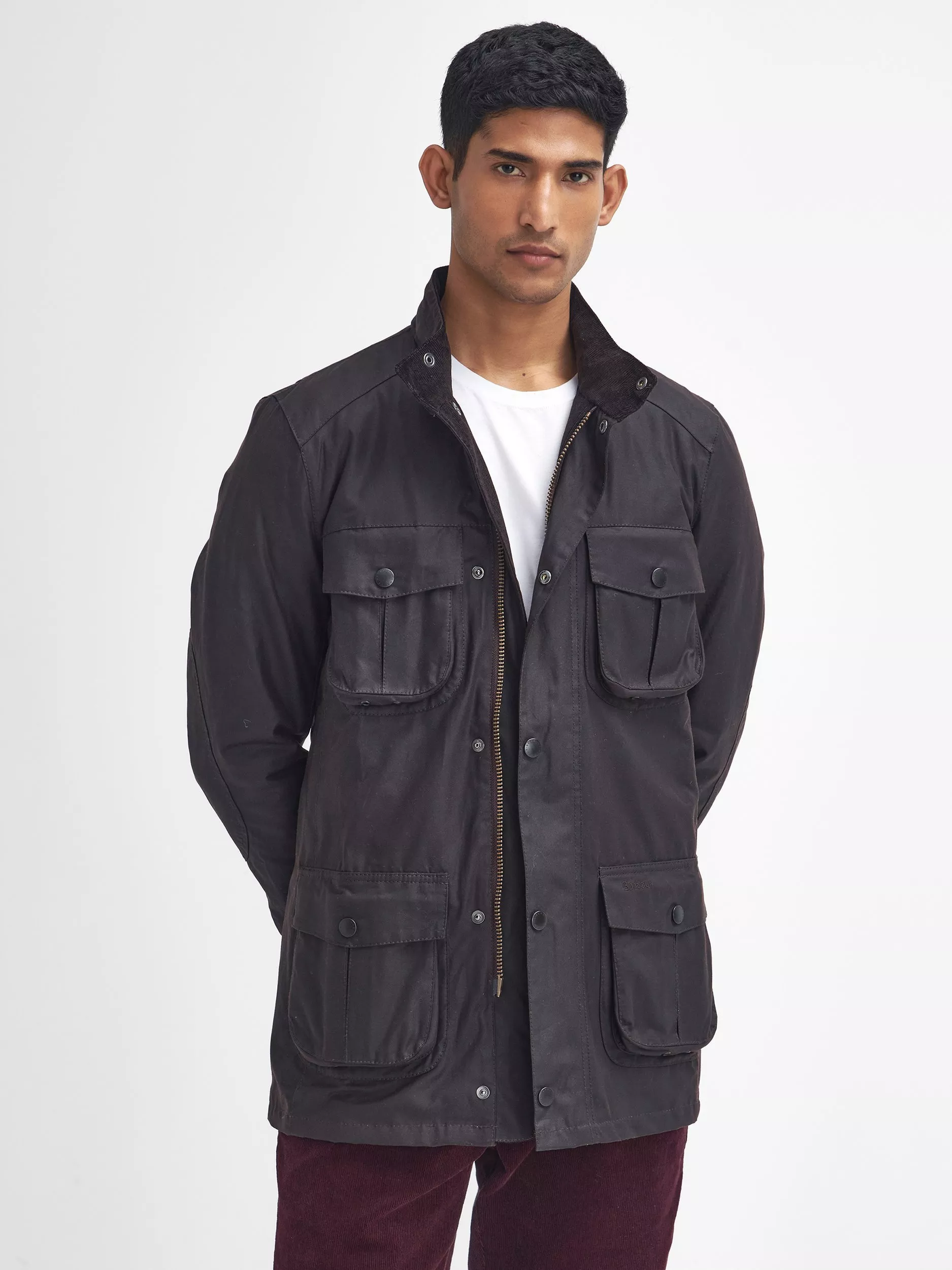 The Corbridge is a rugged utility-style men's waxed jacket updated with a contemporary engineered fit. With winter in mind, this multi-functional jacket is constructed in Barbour's hardy 6oz Sylkoil waxed cotton with a comfortable, lightweight Nylon lining quilted to 50g wadding, for additional warmth. The corduroy-lined funnel collar features an integral Nylon hood complete with adjustable toggles for a perfect fit, offering wet-weather defence when needed but easily stowed away in the collar on dry days. Built to offer comfort and protection to those who are active outdoors in any weather, the Corbridge benefits from adjustable cuffs, a robust two-way zip, a storm fly front with stud fastenings and an action back. The classic four-pocket detail adds a stylish, practical feature that keeps essentials safe and hands free. As this is a slim-fitting jacket, it's advised to purchase the next size up than you would normally choose.