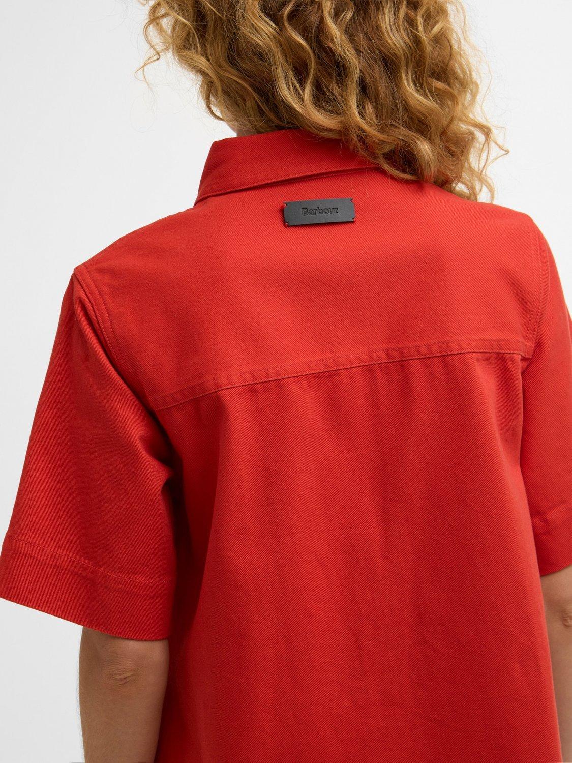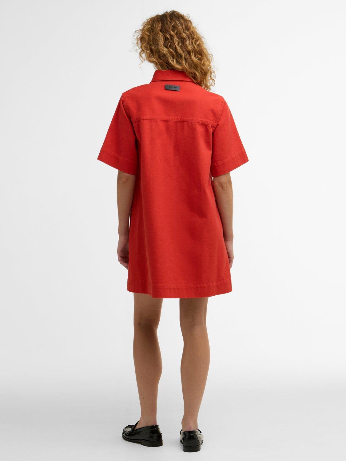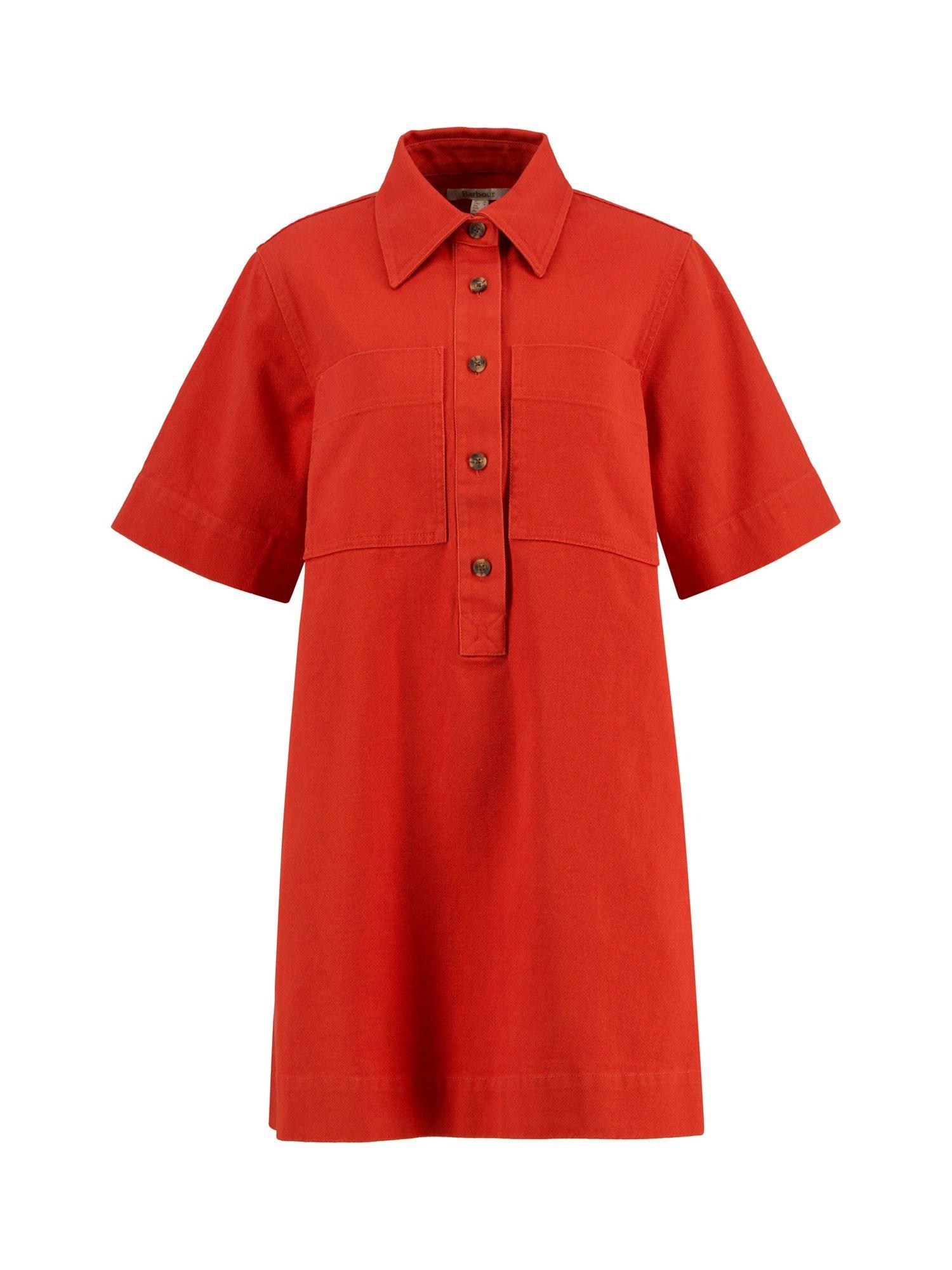 The Barbour Launton Mini Dress is a relaxed-fit style crafted from overdyed 100% cotton twill. It features two laid-on pockets, twin-needle stitching, and an extended front placket. Finished with branded mock horn buttons down the front and a debossed PU badge at the back yoke, this dress blends practical detailing with a timeless, relaxed silhouette.