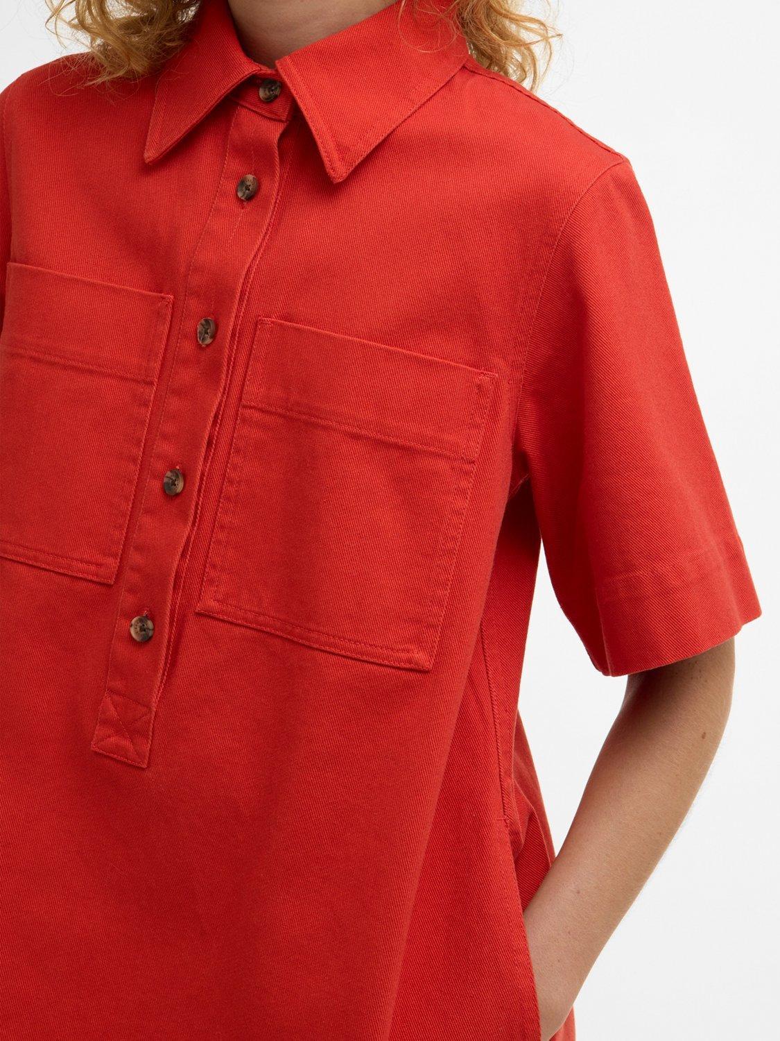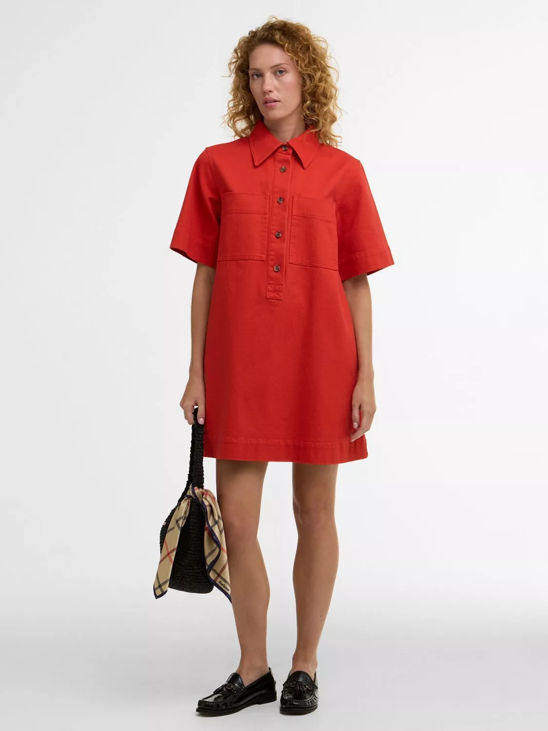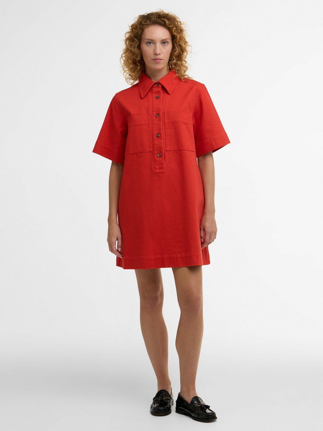 The Barbour Launton Mini Dress is a relaxed-fit style crafted from overdyed 100% cotton twill. It features two laid-on pockets, twin-needle stitching, and an extended front placket. Finished with branded mock horn buttons down the front and a debossed PU badge at the back yoke, this dress blends practical detailing with a timeless, relaxed silhouette.