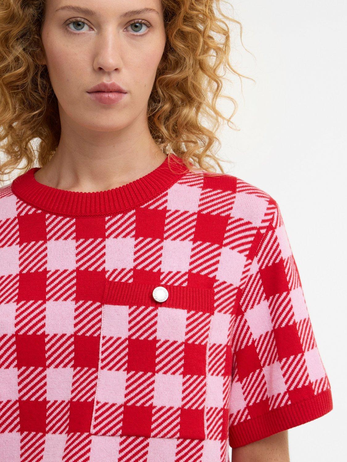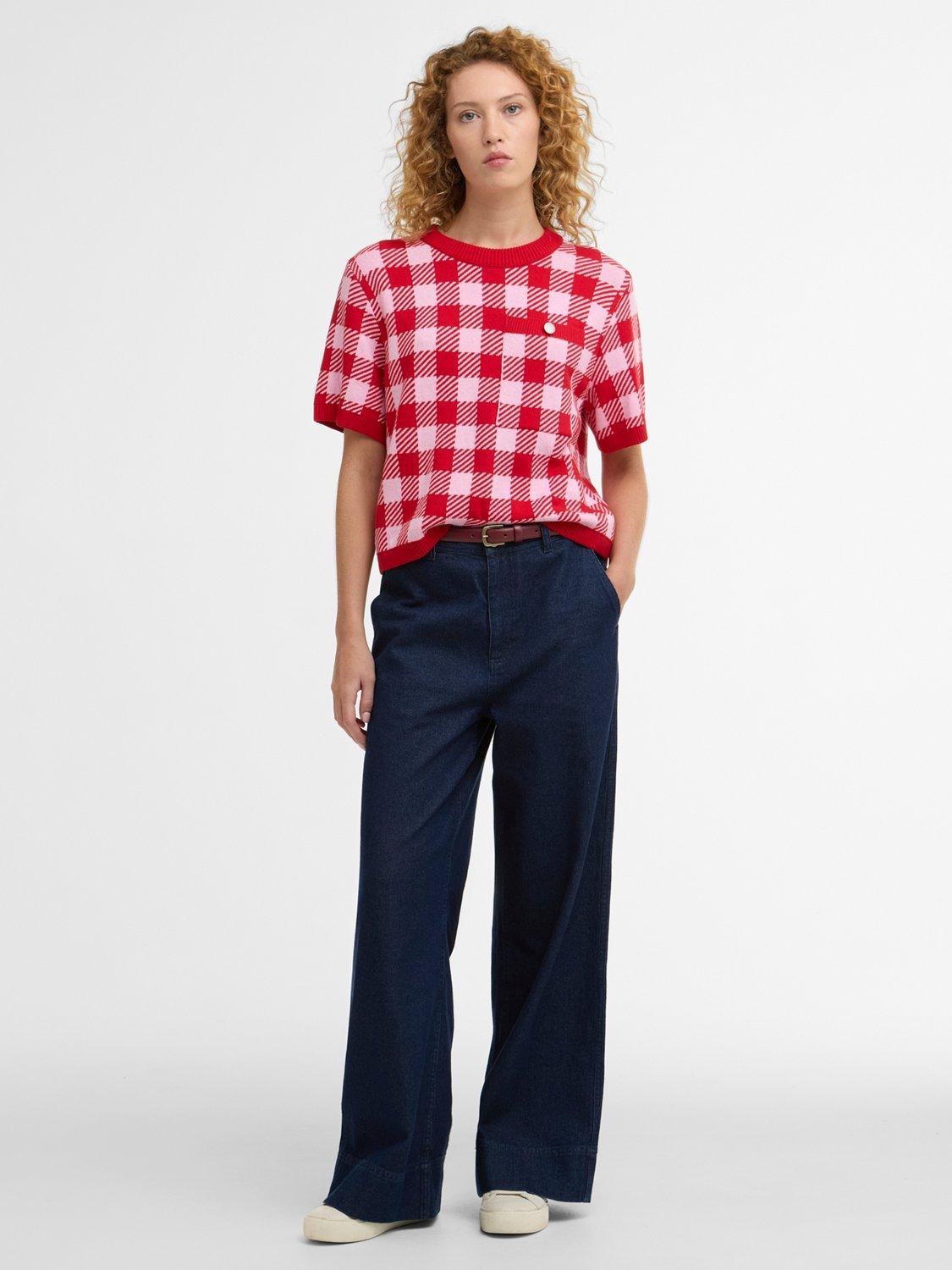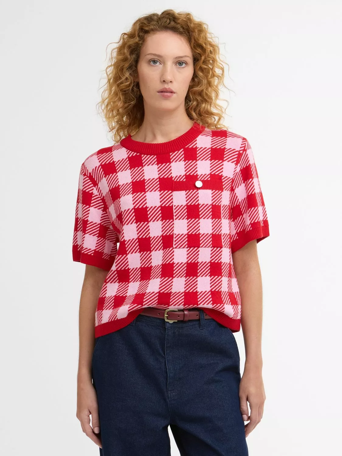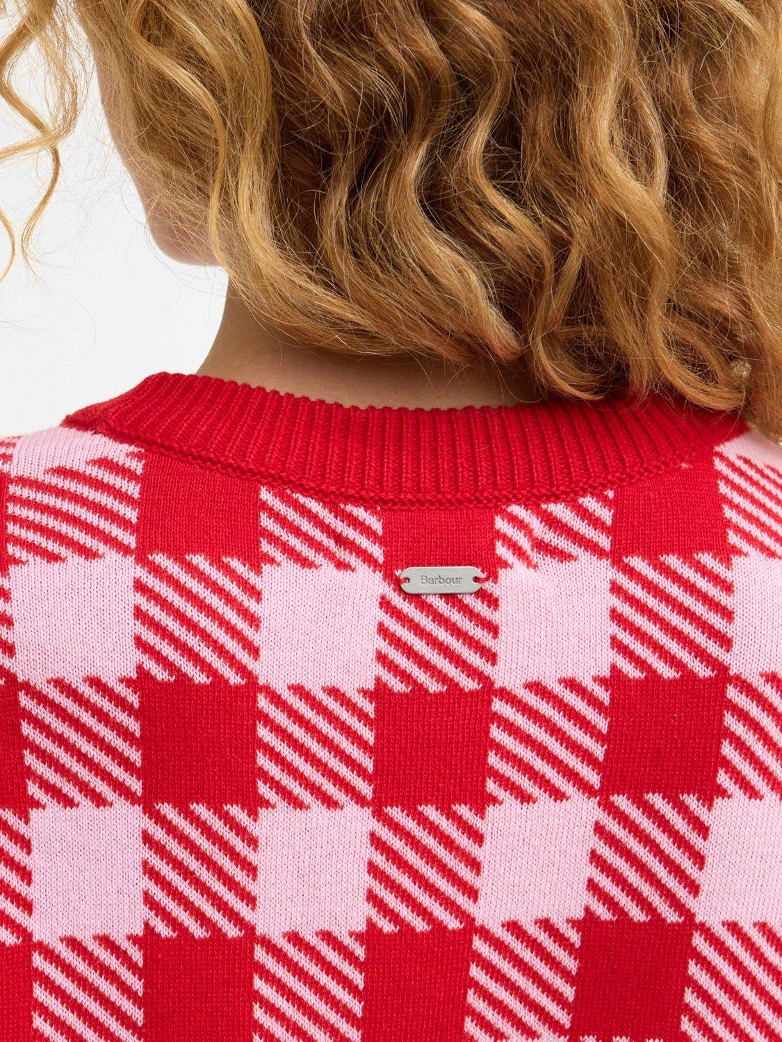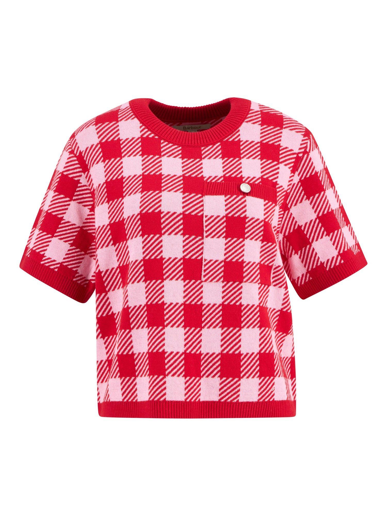 The Barbour Esther Gingham Crew Neck Jumper is a stylish, textured layering piece. Crafted in a gingham jacquard knit, it features a relaxed boxy silhouette, ribbed trims, and a patch pocket with a Barbour-branded button for subtle detailing. Finished with a slim metal ID bar at the back neck, this jumper blends contemporary design with heritage-inspired craftsmanship, offering versatile, comfortable style for everyday wear.