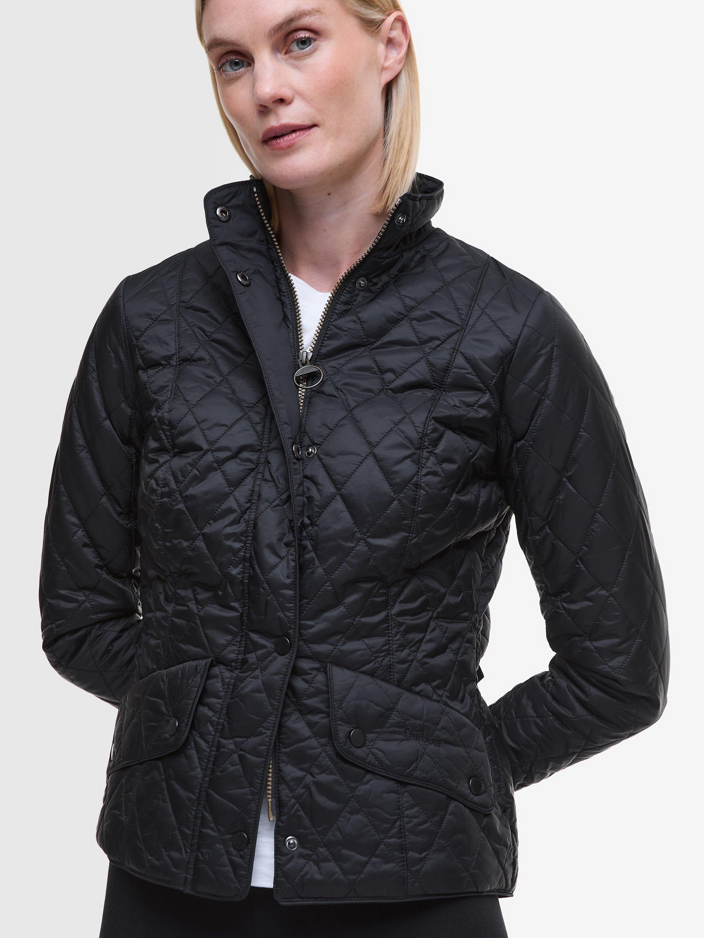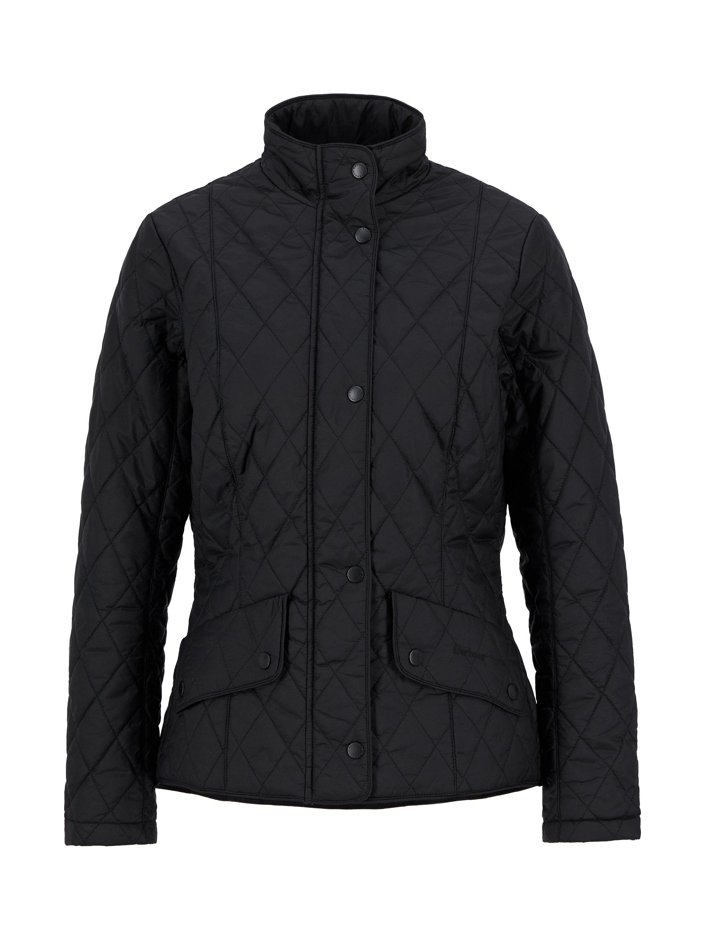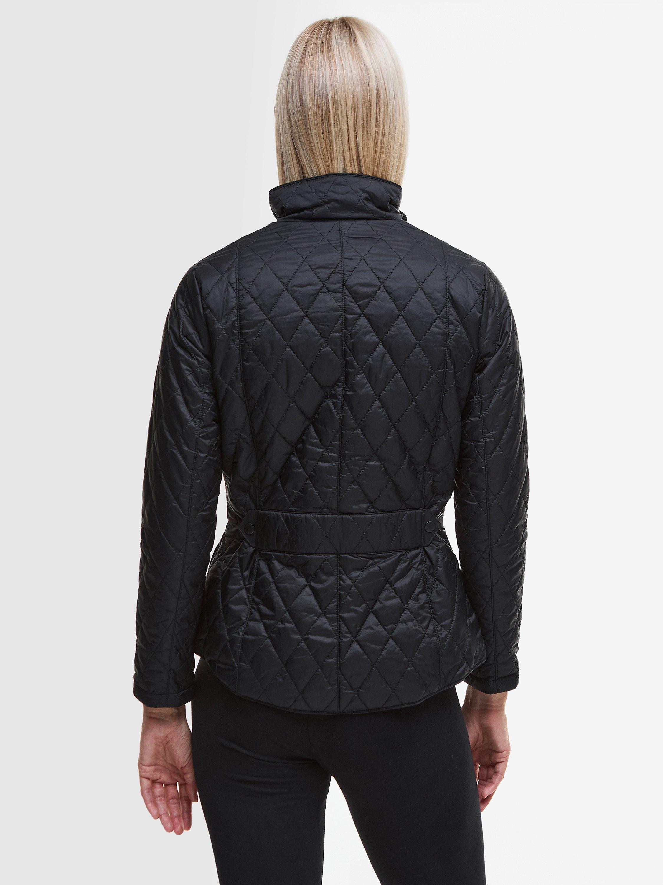 The Barbour Flyweight Cavalry Quilted Jacket is a diamond-quilted design with a flattering curved back hem and angled pocket flaps. Styled with a funnel collar, it offers a classic fit and features a studded and elasticated back belt for a smart finish with unrestricted movement.