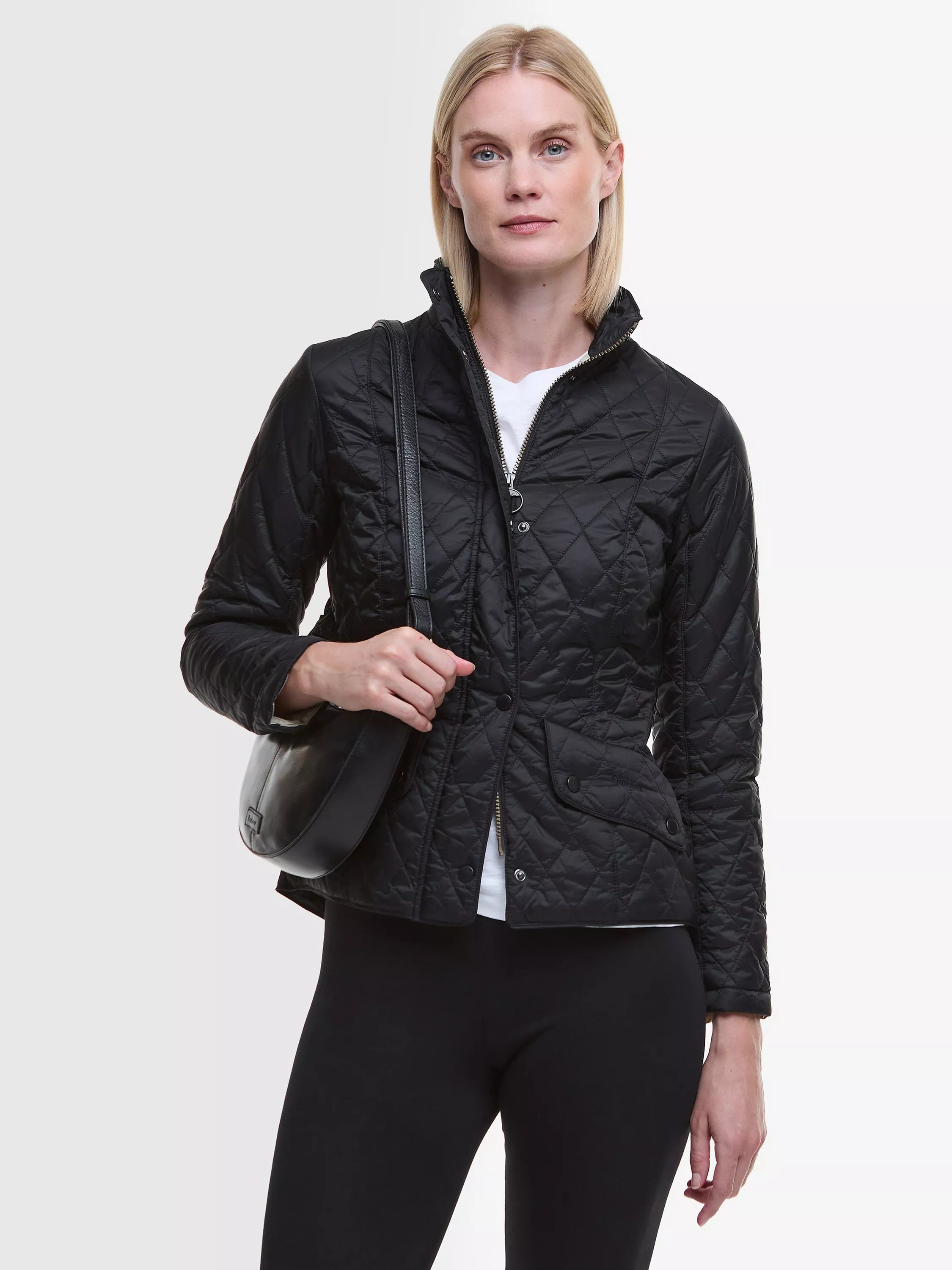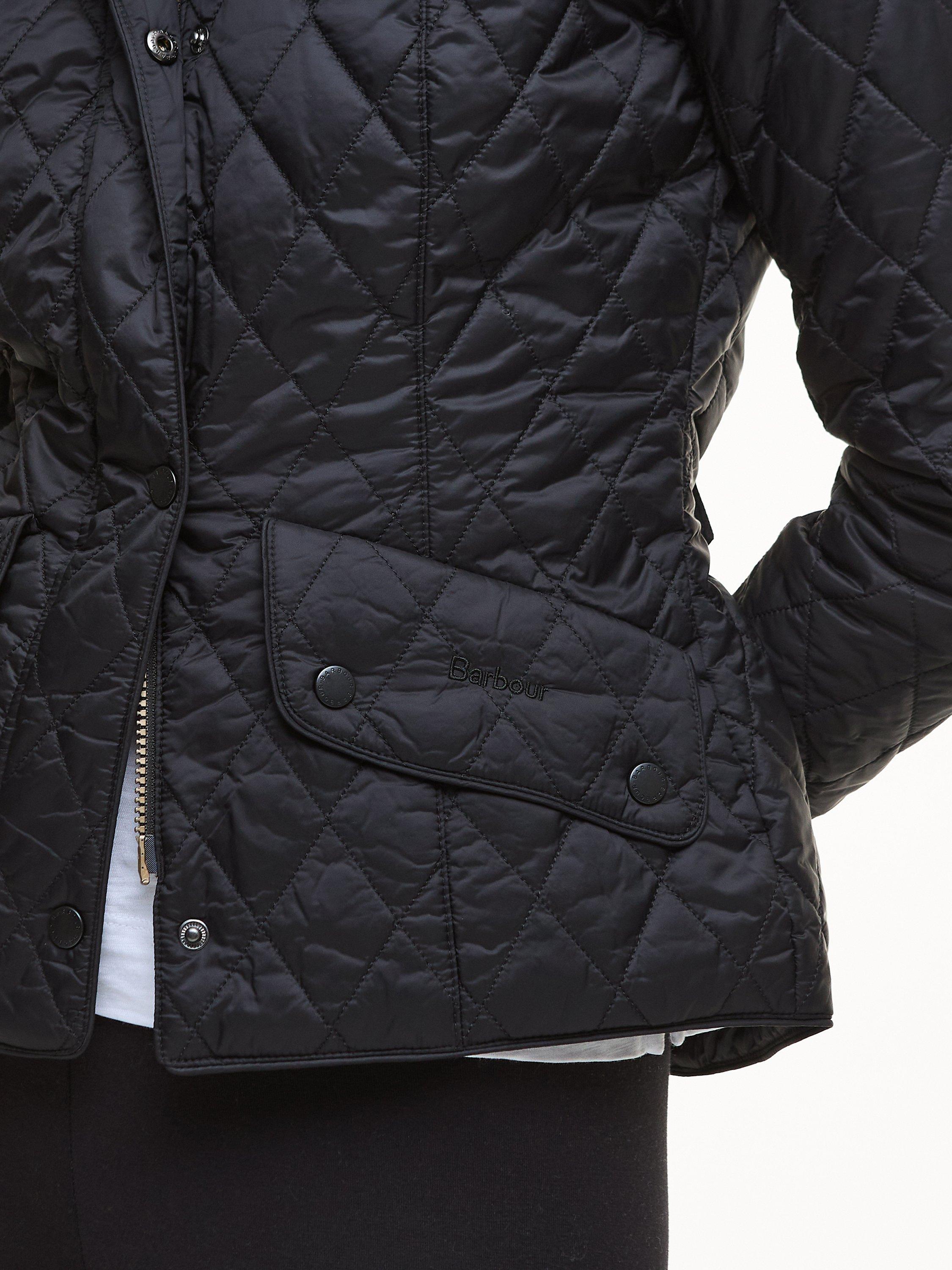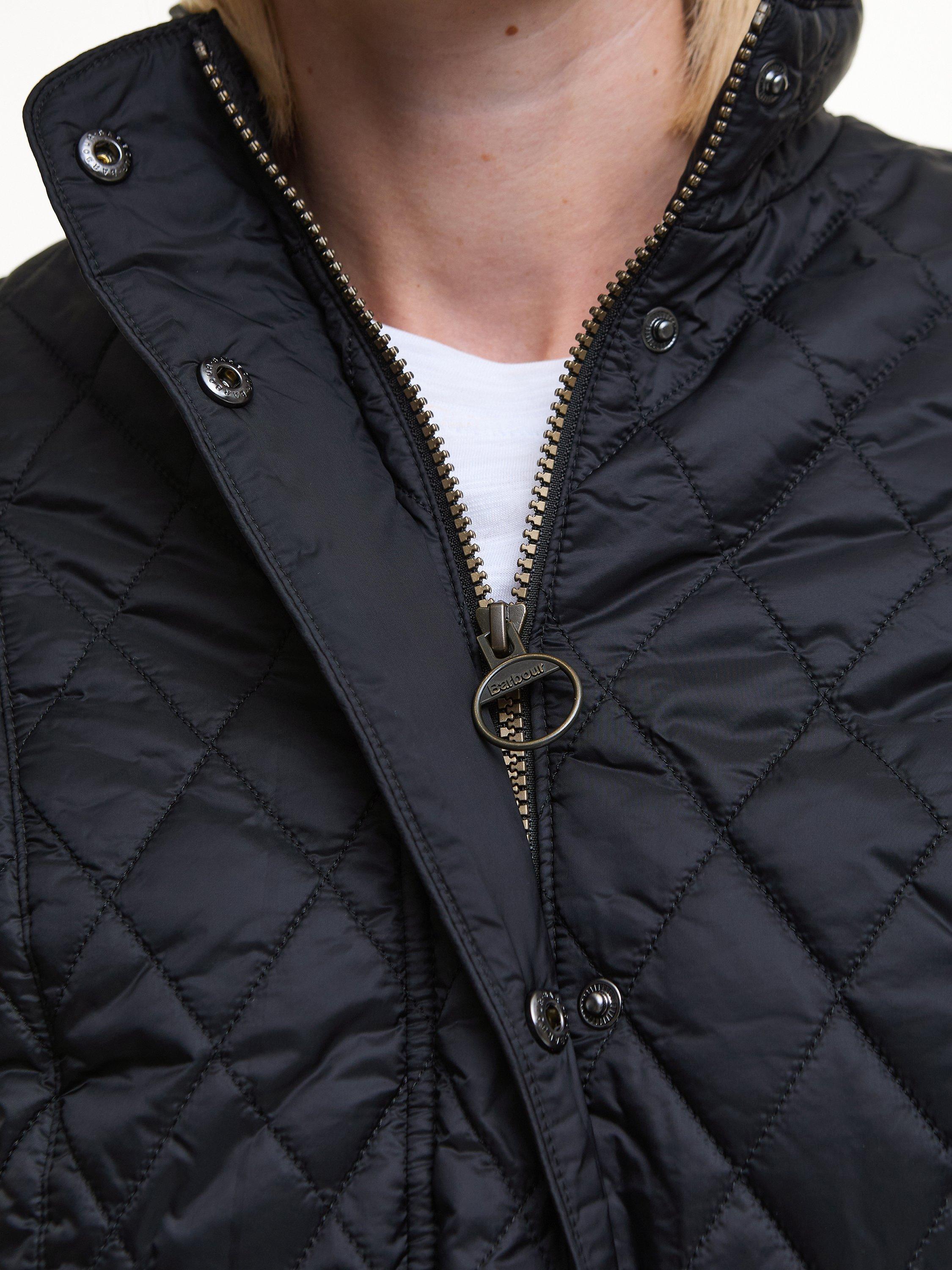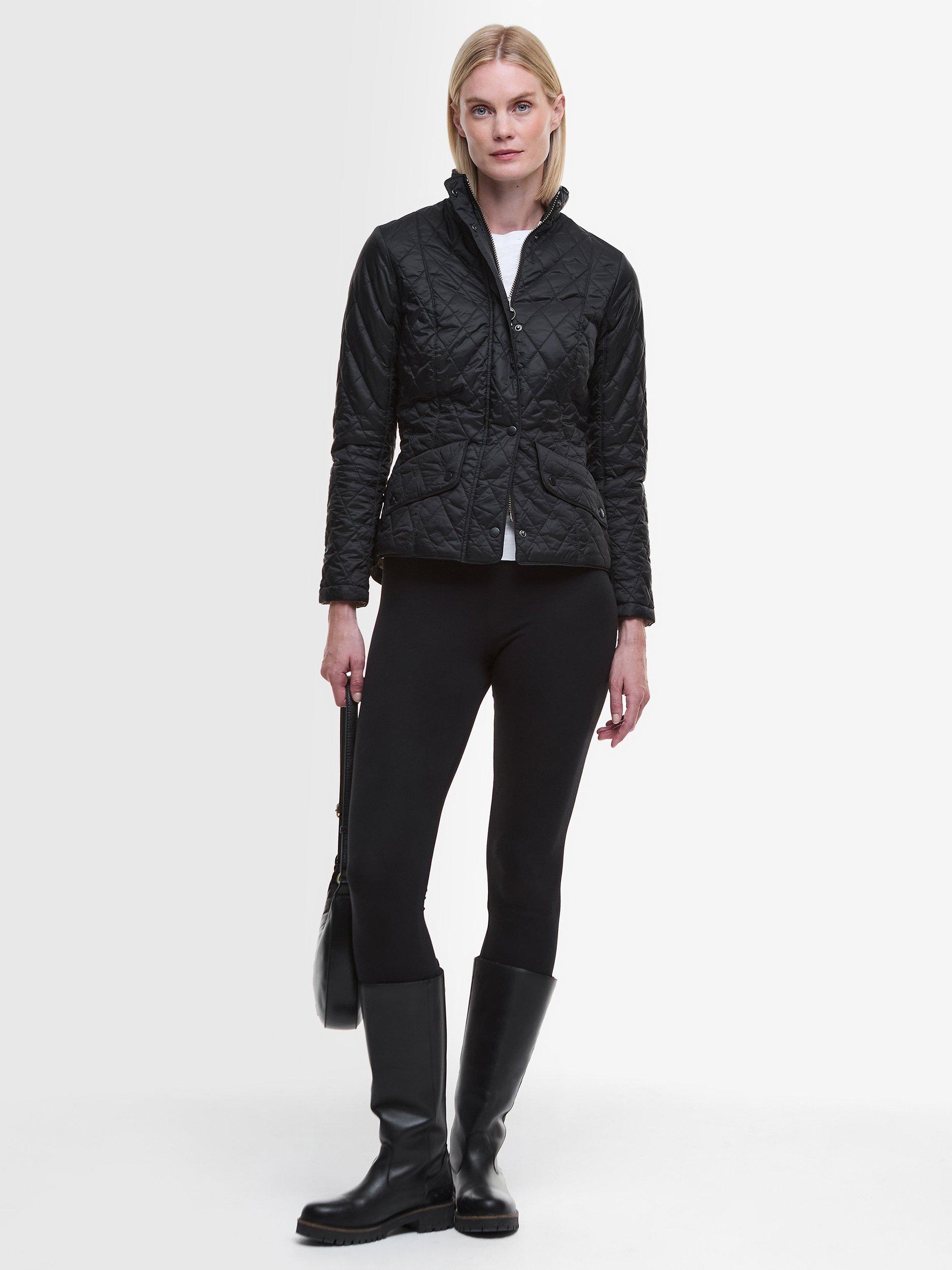 The Barbour Flyweight Cavalry Quilted Jacket is a diamond-quilted design with a flattering curved back hem and angled pocket flaps. Styled with a funnel collar, it offers a classic fit and features a studded and elasticated back belt for a smart finish with unrestricted movement.