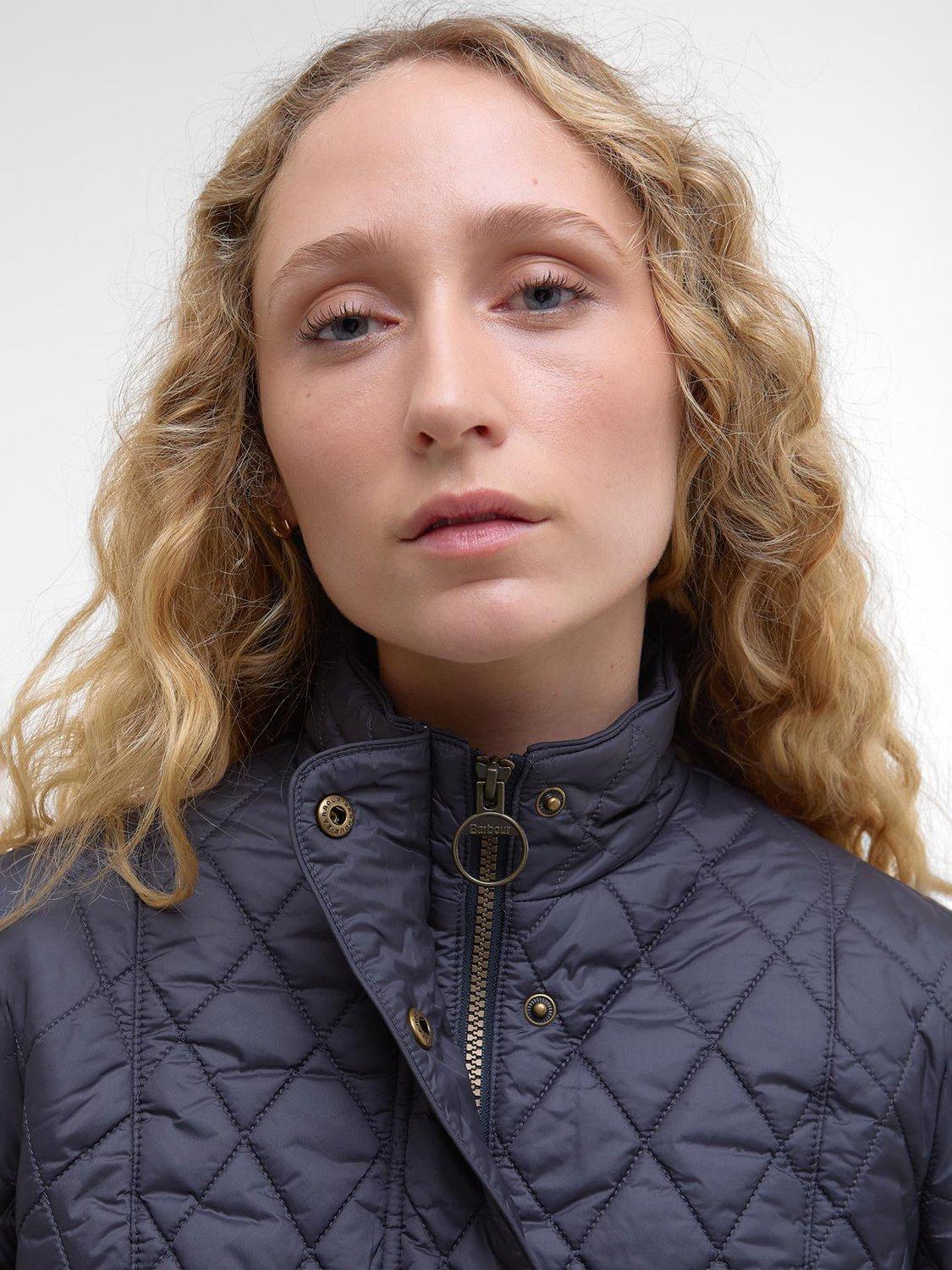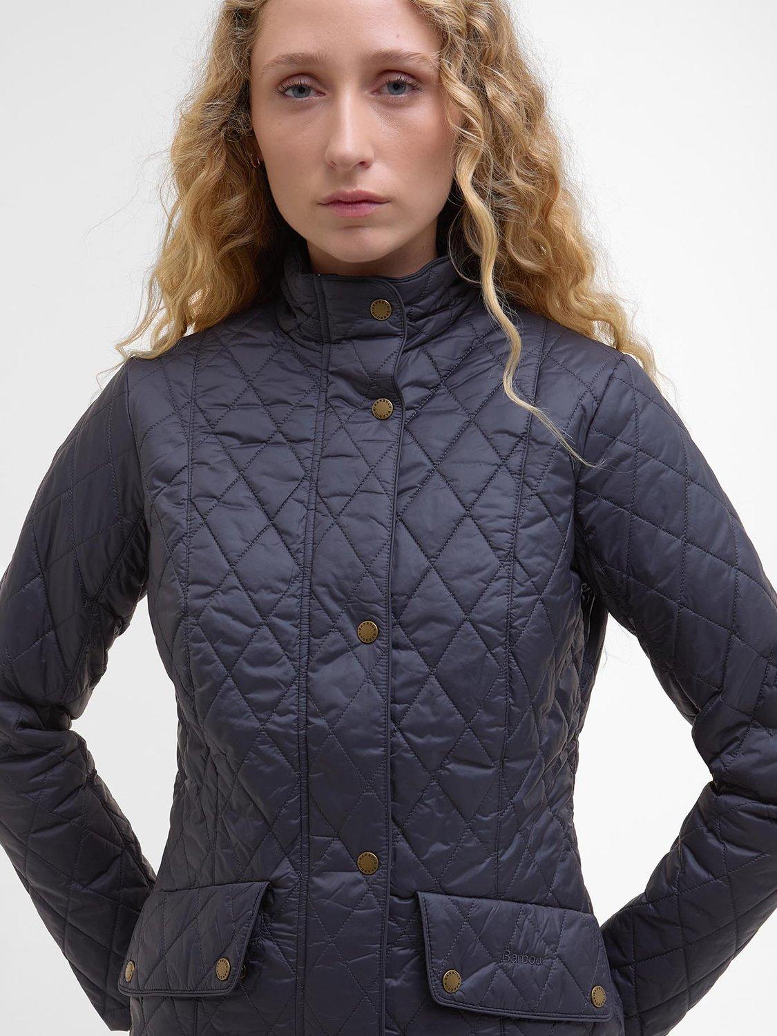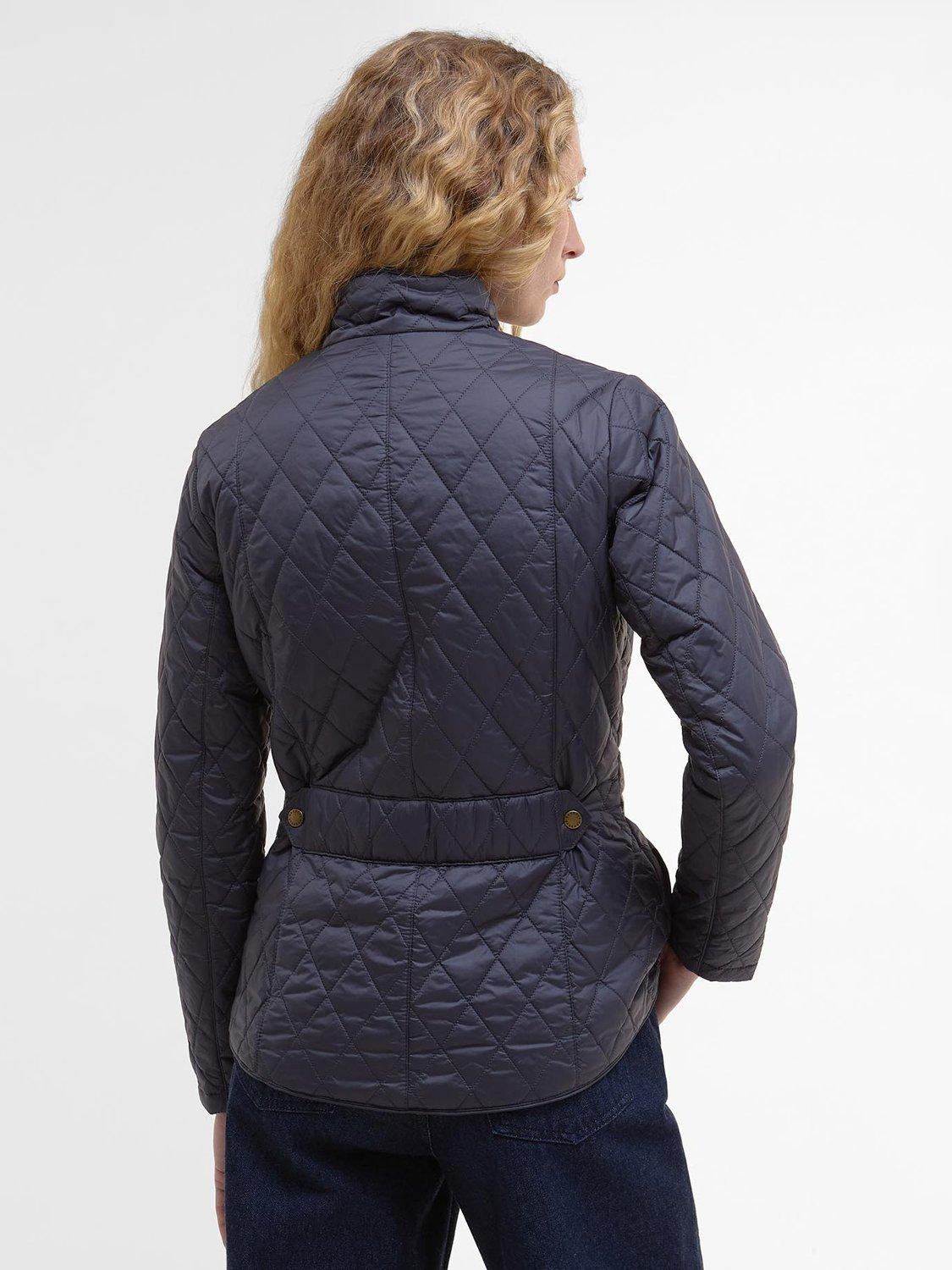 The Barbour Flyweight Cavalry Quilted Jacket is a diamond-quilted design with a flattering curved back hem and angled pocket flaps. Styled with a funnel collar, it offers a classic fit and features a studded and elasticated back belt for a smart finish with unrestricted movement.