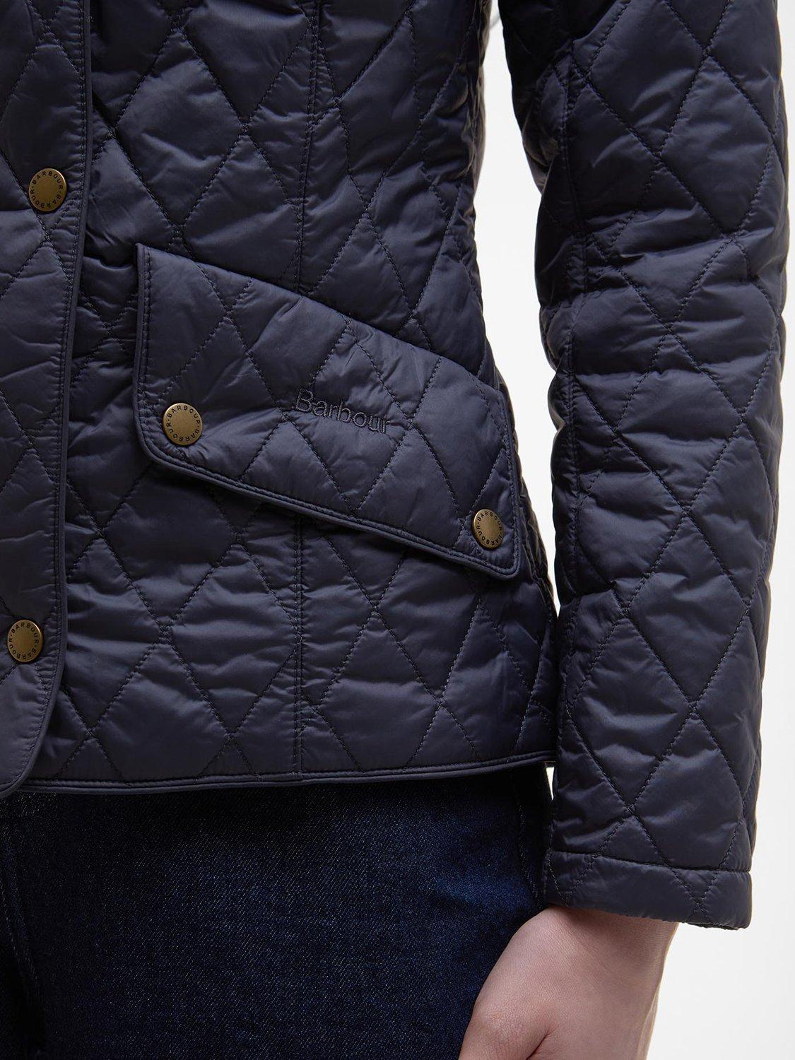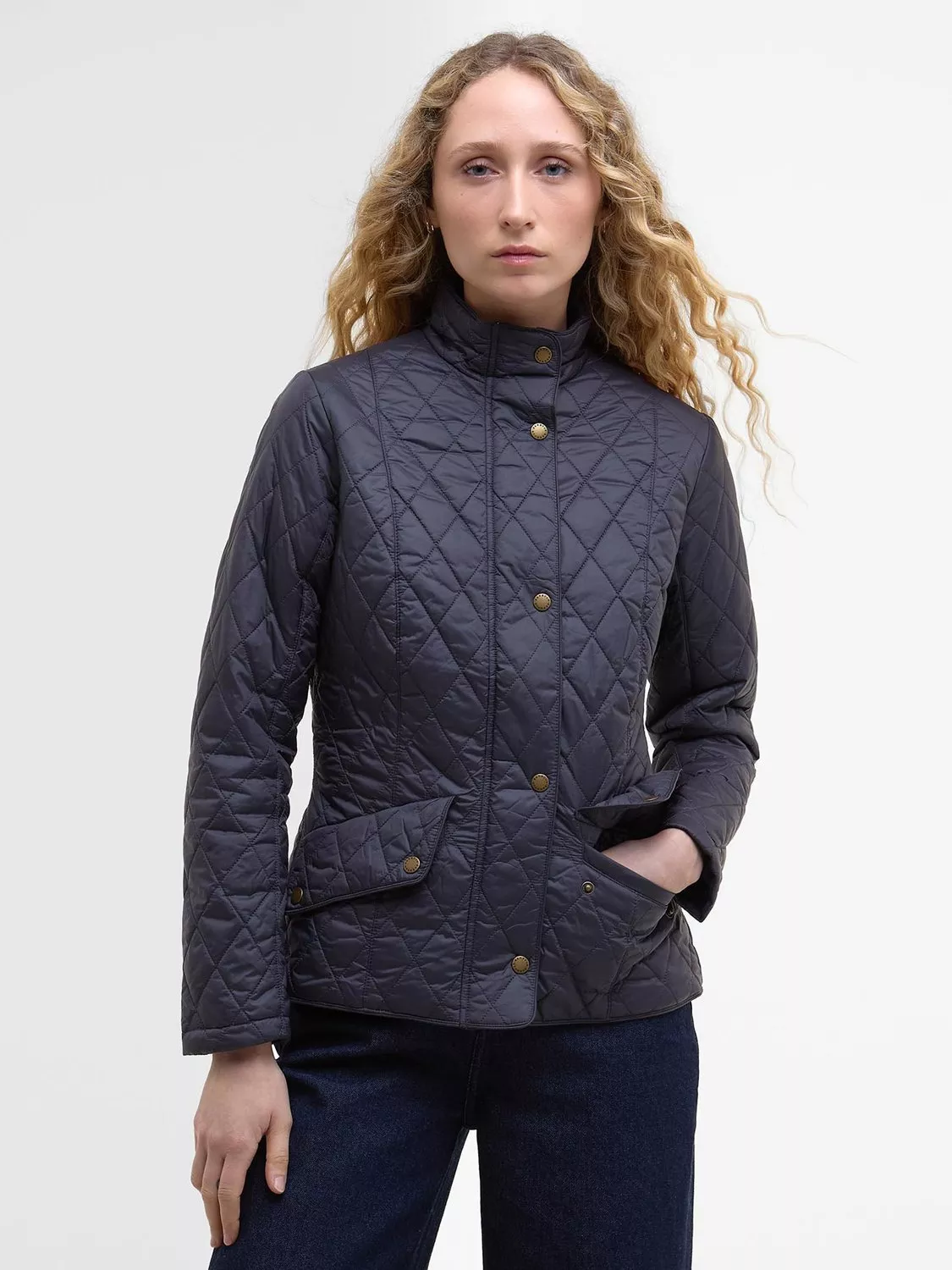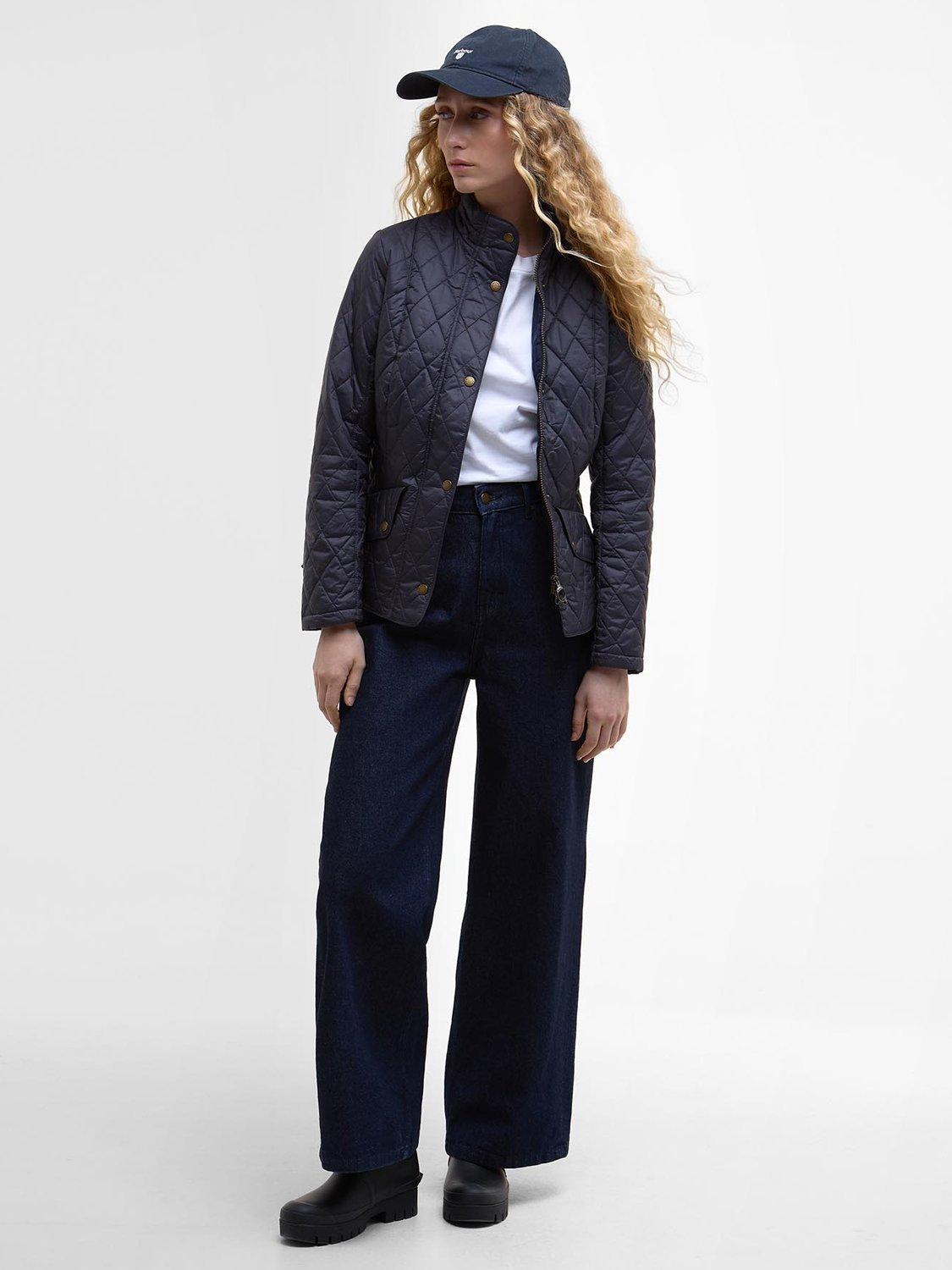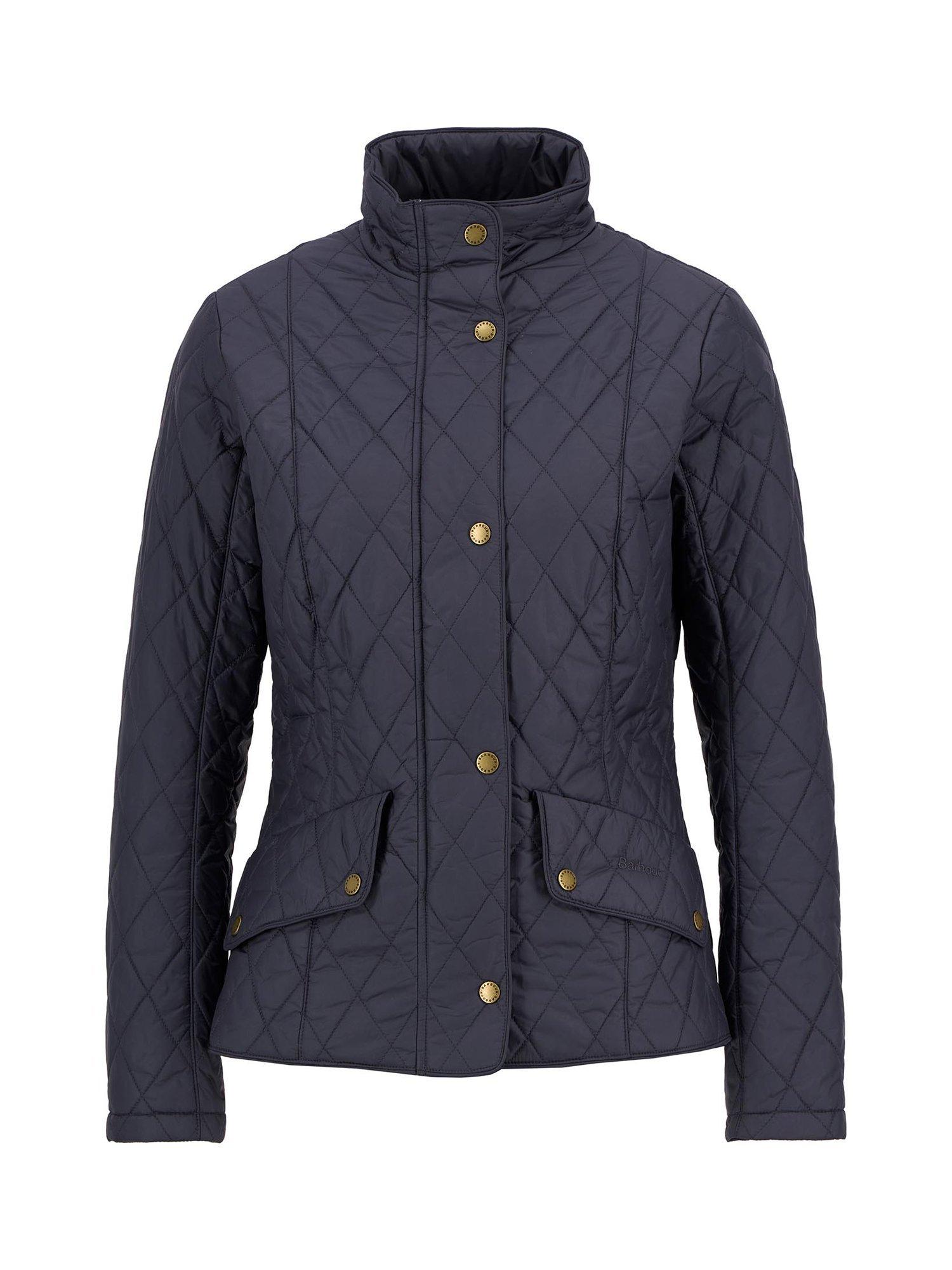 The Barbour Flyweight Cavalry Quilted Jacket is a diamond-quilted design with a flattering curved back hem and angled pocket flaps. Styled with a funnel collar, it offers a classic fit and features a studded and elasticated back belt for a smart finish with unrestricted movement.