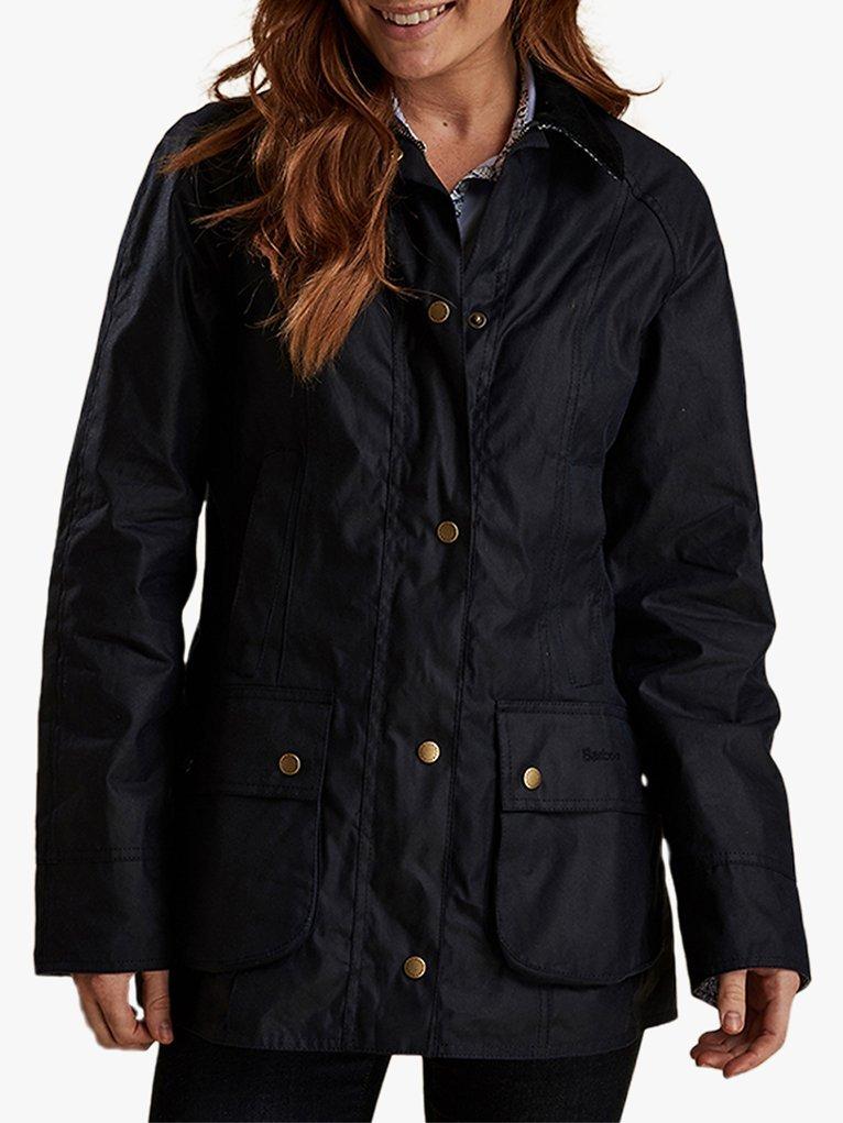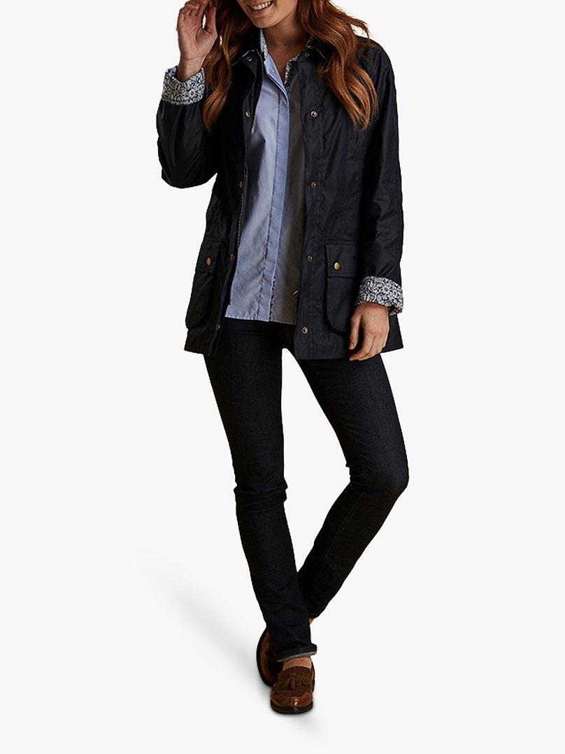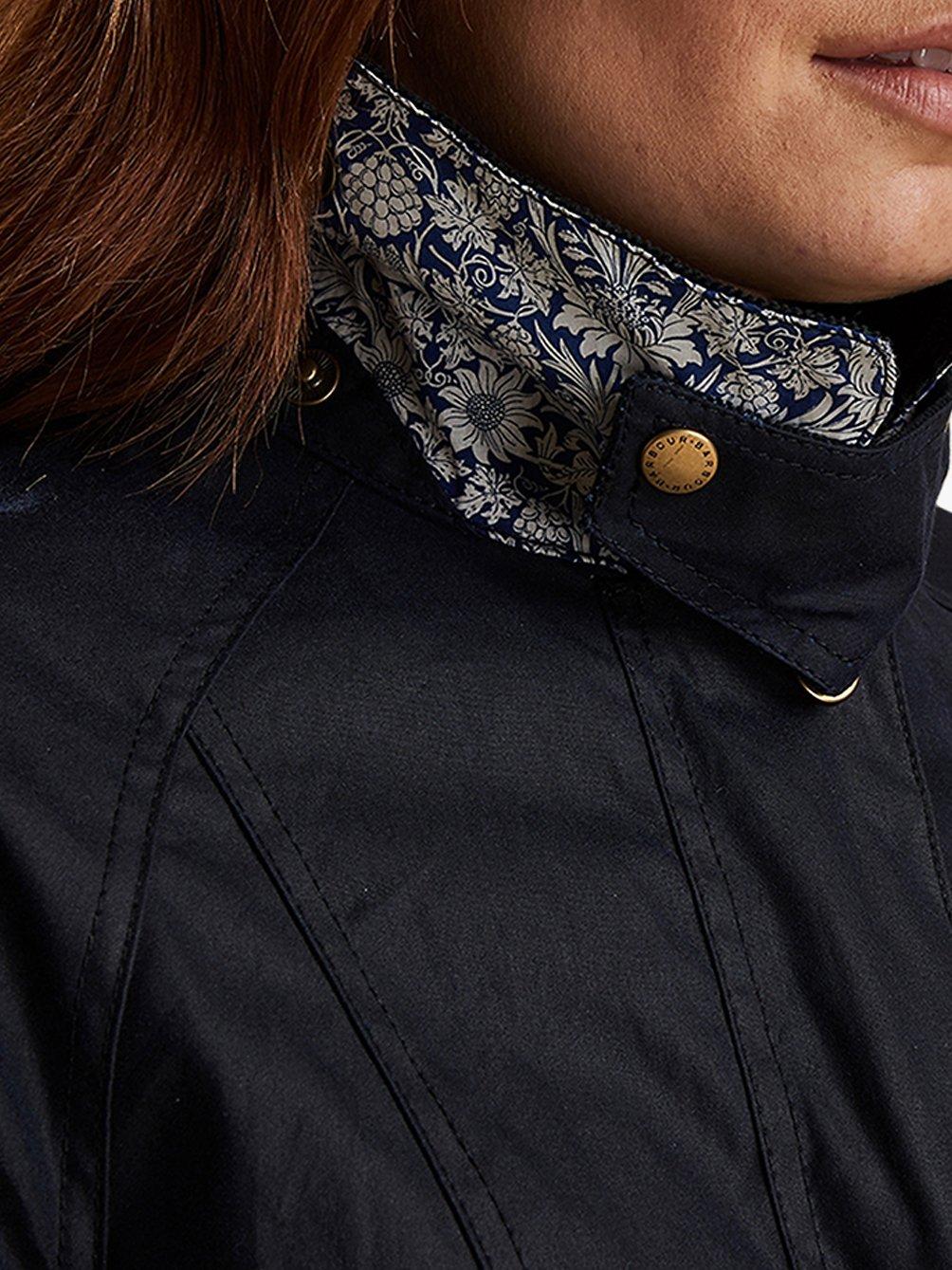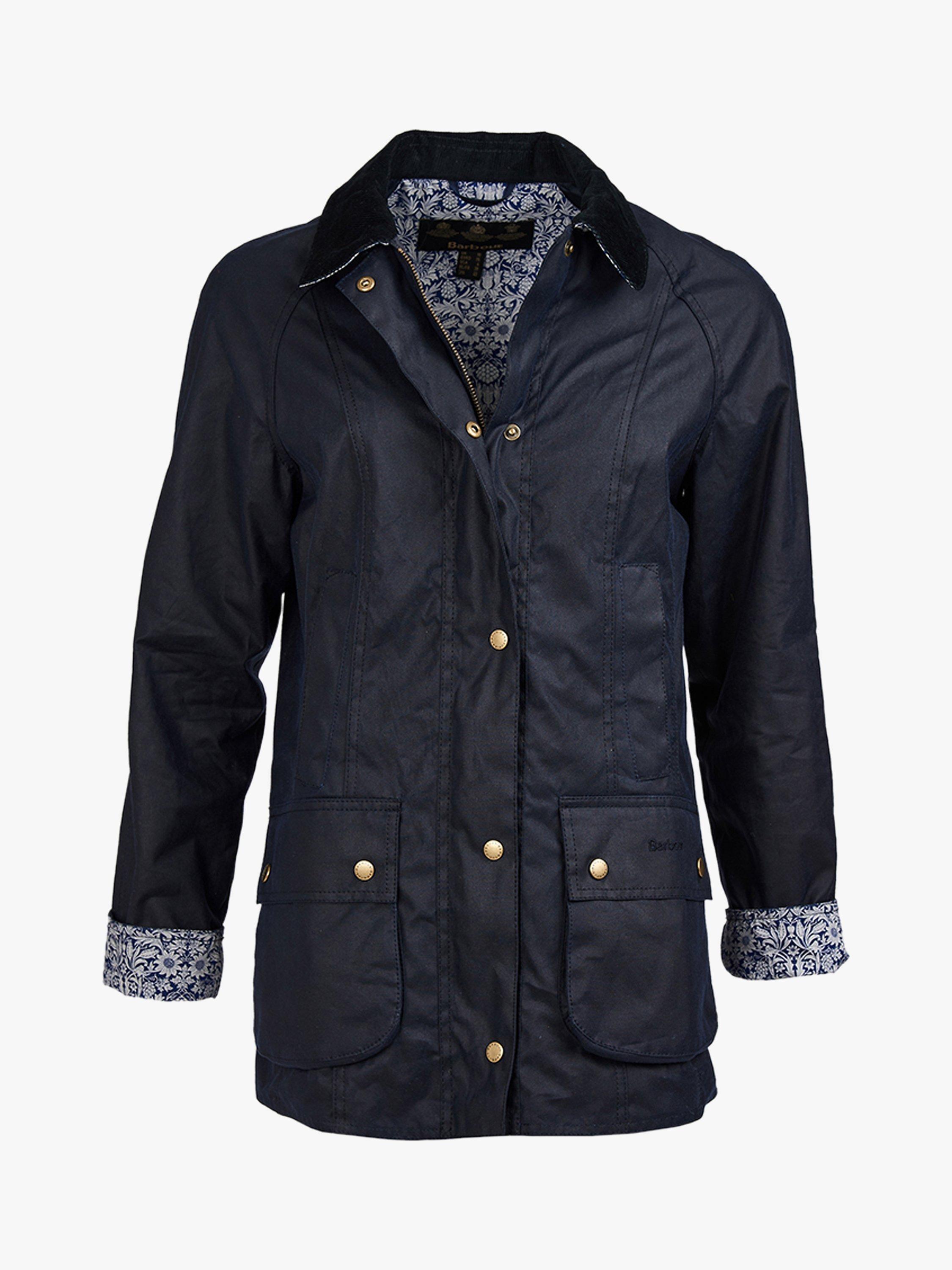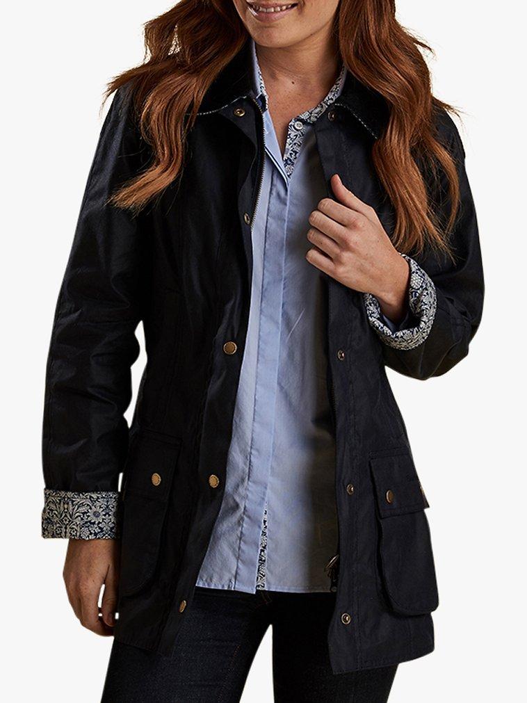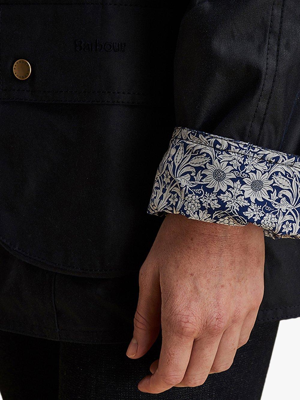Made from waxed cotton, it has the brand's signature Beadnell silhouette with a straight cut, popper front fastenings and patch pockets. The inside is lined with Liberty print fabric that also adorns the corded under collar.