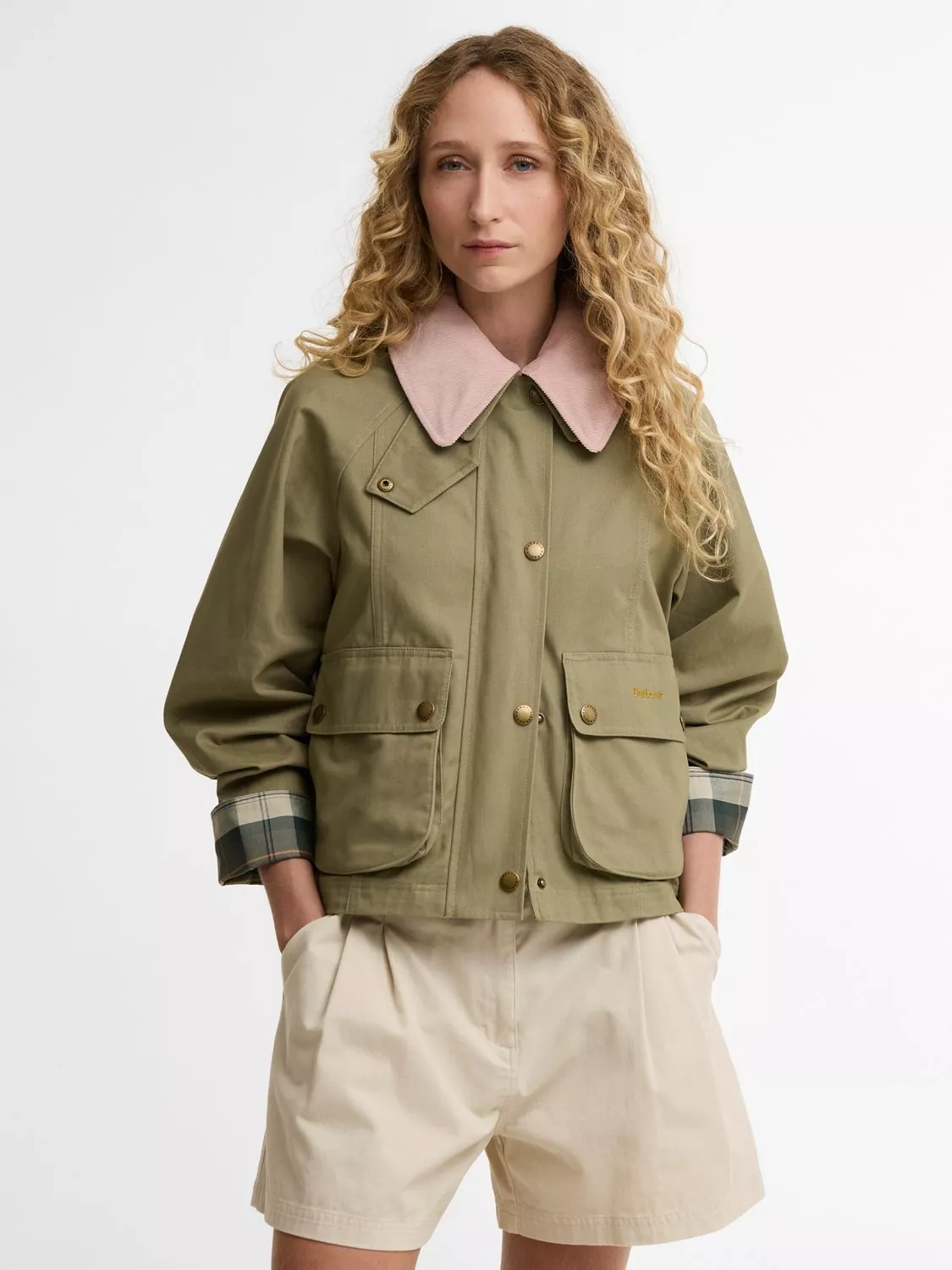 The Barbour Cropped Beadnell Casual Jacket is a regular-fit, shortened take on the classic Beadnell style. Crafted from 100% cotton, it features a detachable cord collar, tartan turn-up cuffs, and large bellow pockets as the focal point. Finished with subtle Barbour embroidery on the pocket flaps, it combines heritage detailing with a playful, cropped silhouette.