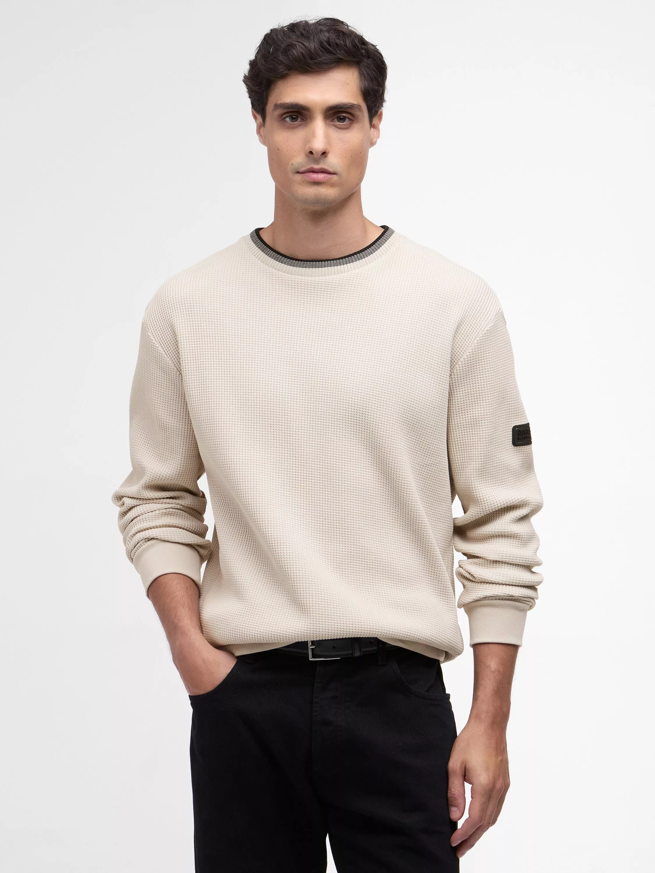 Upgrade your casualwear with the Callum Tipped Jumper. Crafted from 100% cotton for ultimate comfort, this crew neck sweatshirt features a stylish waffle texture and rib knit hem and cuffs for a refined finish. The iconic Barbour International lozenge branding badge on the left sleeve adds a signature touch to this versatile wardrobe essential.