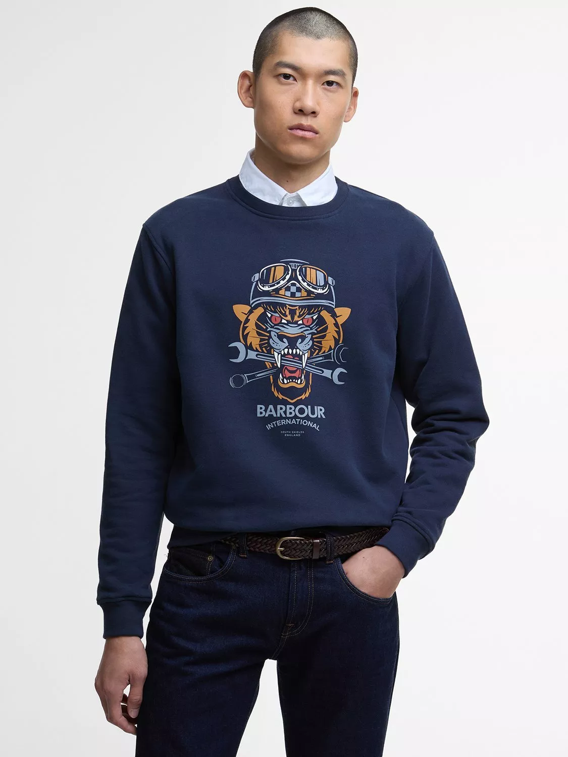 The Barbour International story began in 1936 when Duncan Barbour - the third generation of the Barbour family and a keen motorcyclist - designed a one-piece waxed cotton suit for the International Six Day Trials. The B.Intl Carlisle Graphic Sweatshirt pays homage to this year as the beginning of it all. Simply style it with jeans and trainers for an everyday look that is filled with heritage.