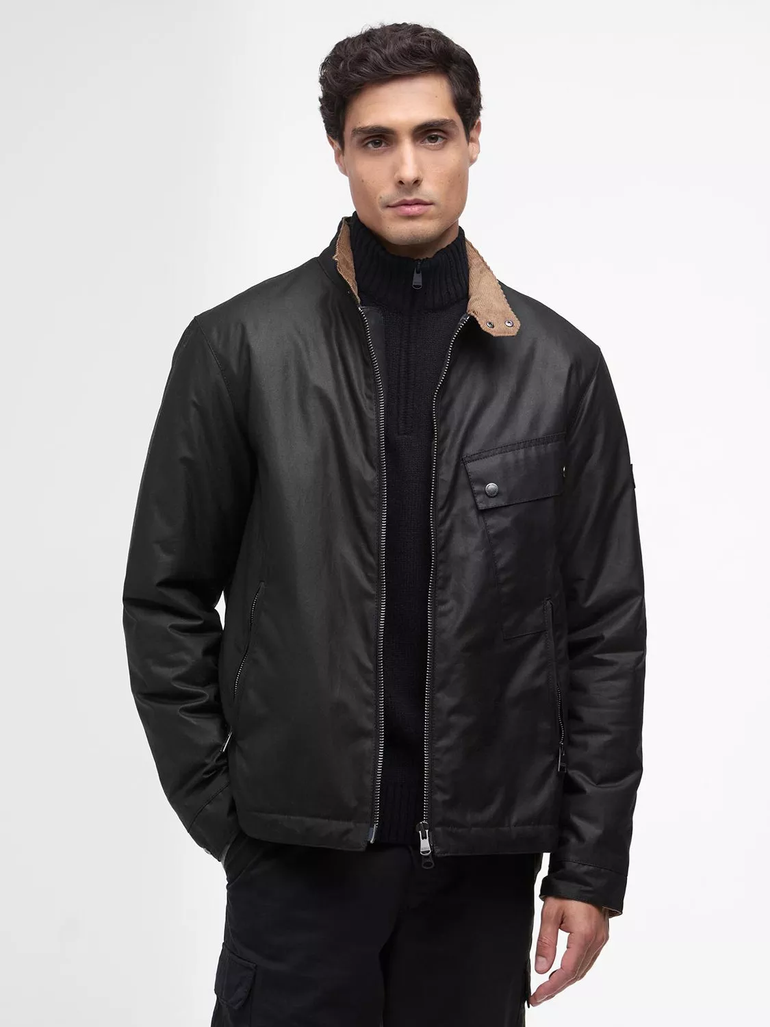 The Chard Waxed Jacket, made from 6oz waxed cotton, features a stand collar, angled map pocket, and lower zip pockets, with needlecord trims and a tartan lining. Finished with a black and gunmetal sleeve badge, it pairs effortlessly with dark denim, leather boots, and layered knits for a rugged, timeless look.