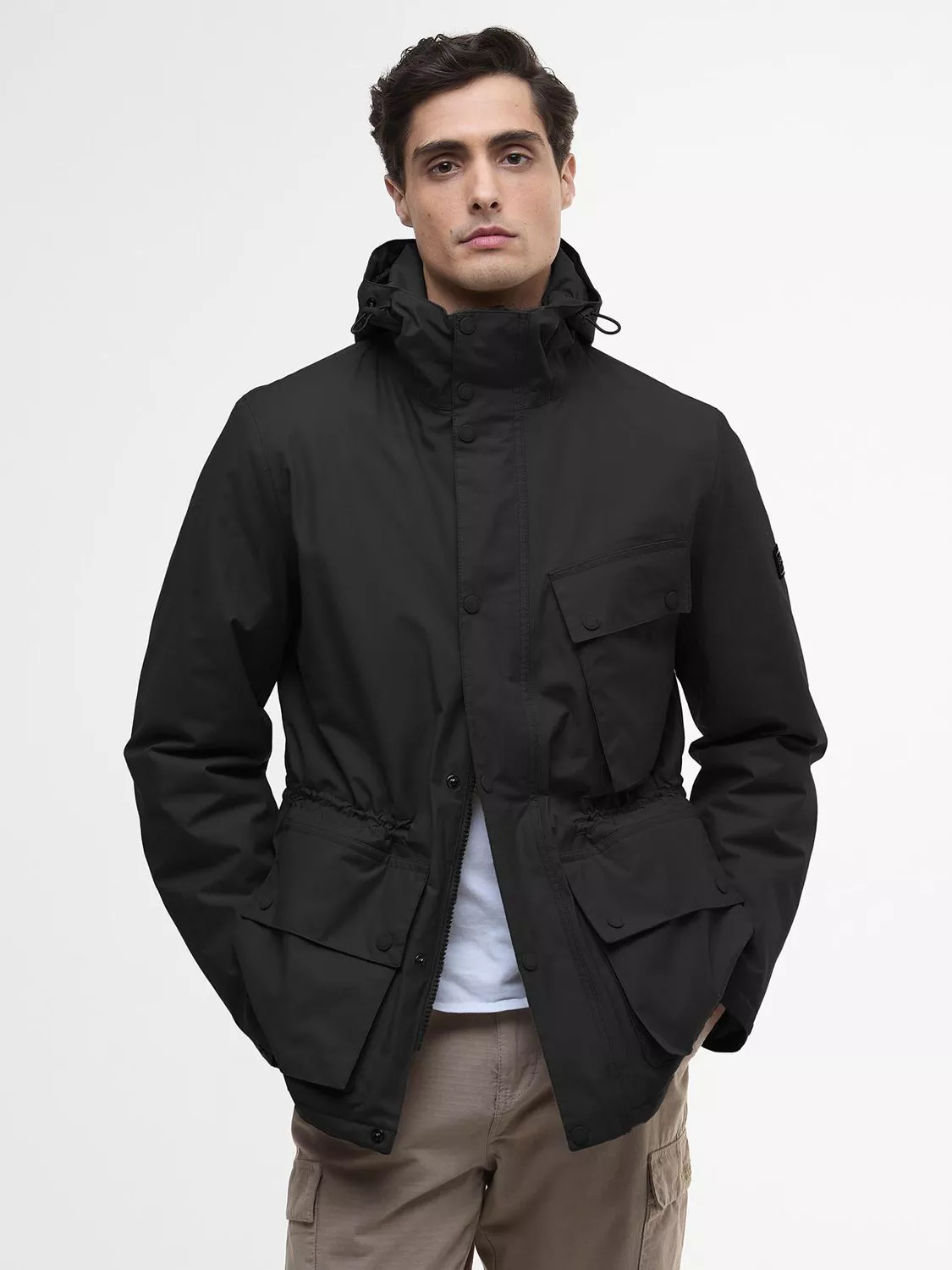 Its shock cord adjustment to the waist and hood allows for a playful take on silhouette styling. The zip and stand front fastening keeps things casual, while the embossed Barbour International logo on the sleeve finishes the garment.