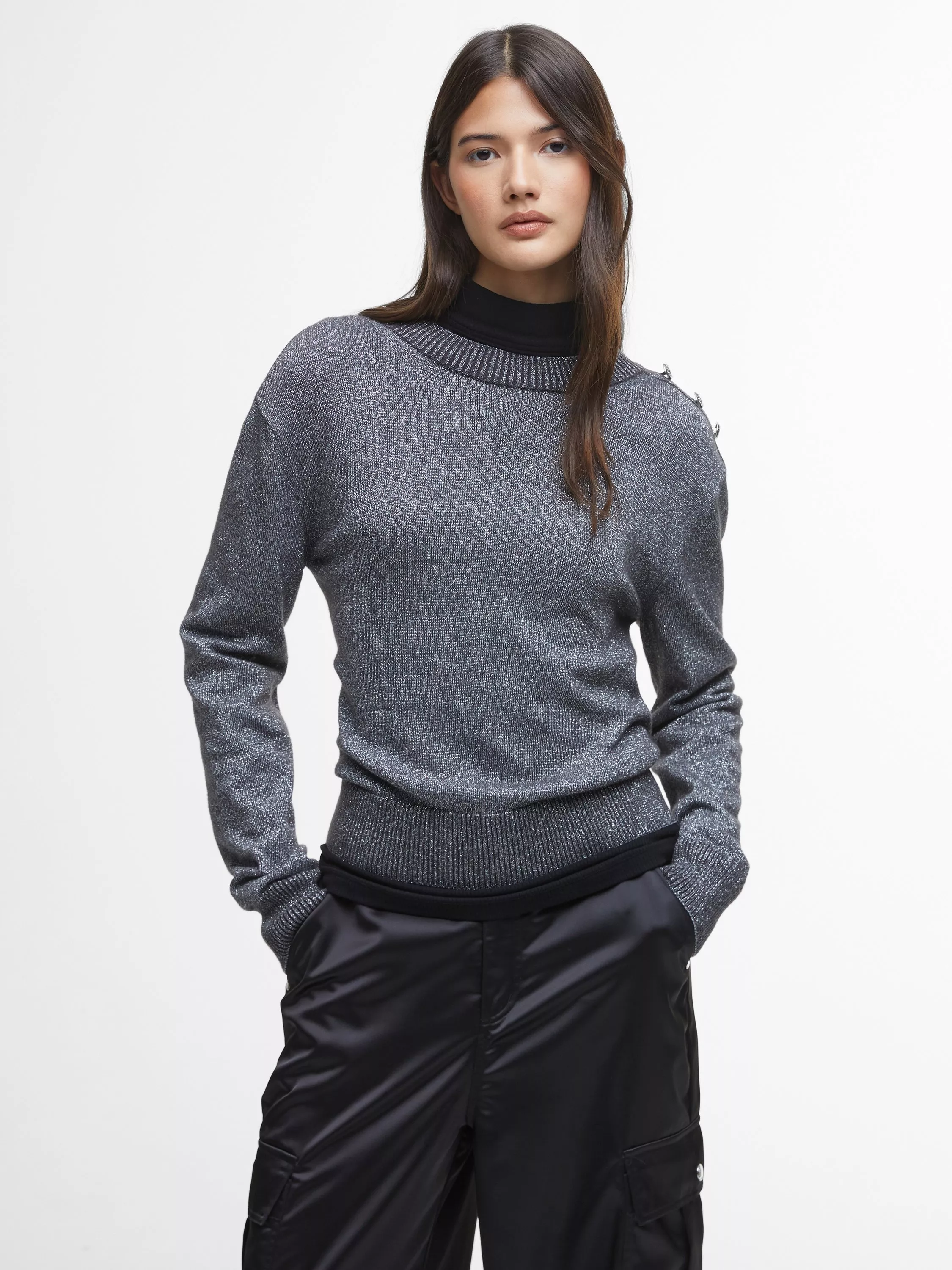 This season, Barbour International has reset its palette to bring you bold metallics for a timeless dose of attitude. Even the knitwear has received a shimmering innovation with the Jade Crew Neck Jumper woven with metallic threads and bright silver branded buttons on the left shoulder. Finished with a BI logo badge on the back of the neck, there's no denying this is a Barbour International staple.