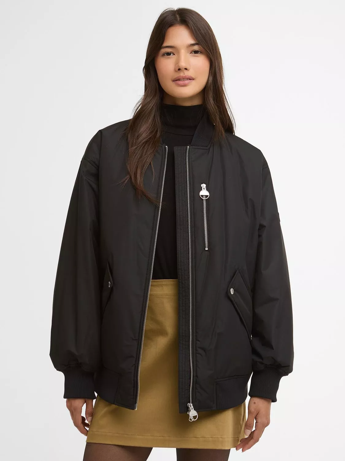 Stay dry with the Barbour International Kuala Showerproof Jacket. This oversized bomber-style jacket combines a classic silhouette with modern functionality. Featuring a super-soft faux fur lining for warmth and luxury, it's perfect for cooler days. Complete with ribbed details, studded and zip front pockets, and a relaxed fit, it's a seamless blend of comfort and style.