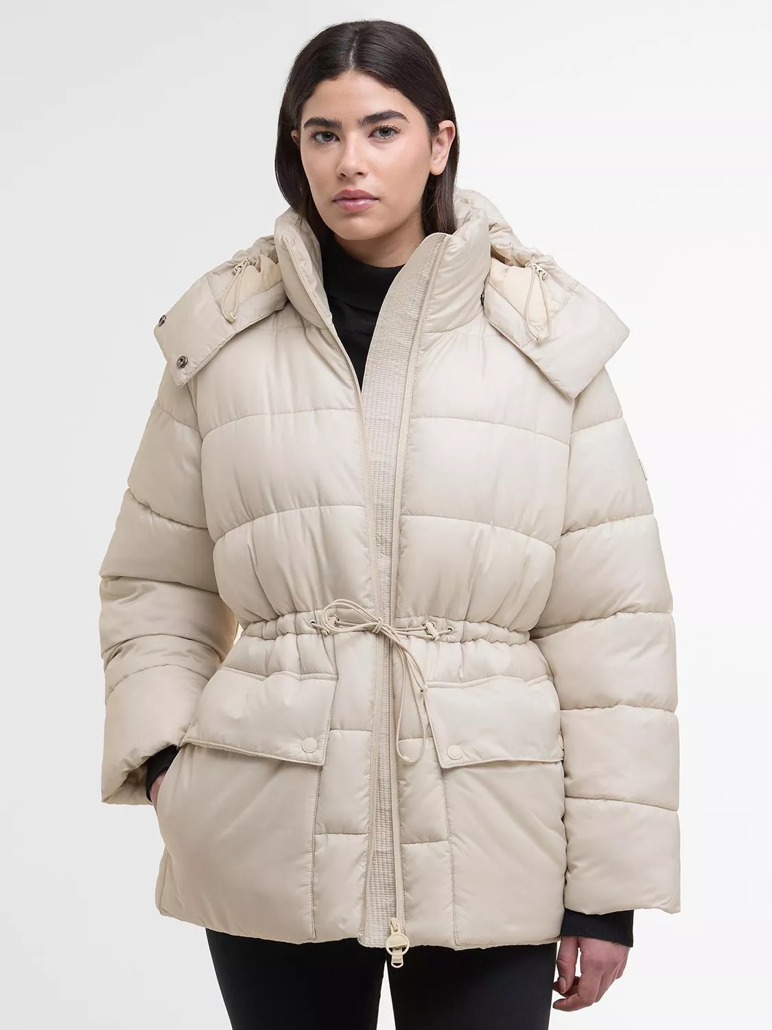 Showcasing a shorter fitted style, the Barbour International Lisbon Puffer Jacket boasts an all-over oversized baffle design with a detachable hood. A drawcord to the waist offers a feminine fit while retaining unwavering comfort and functionality.