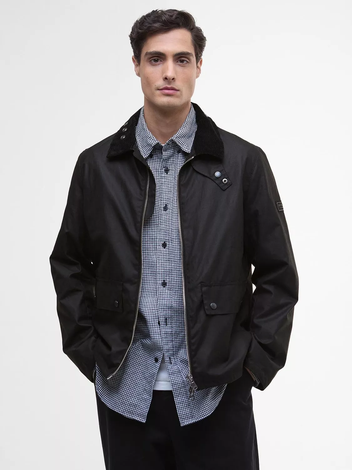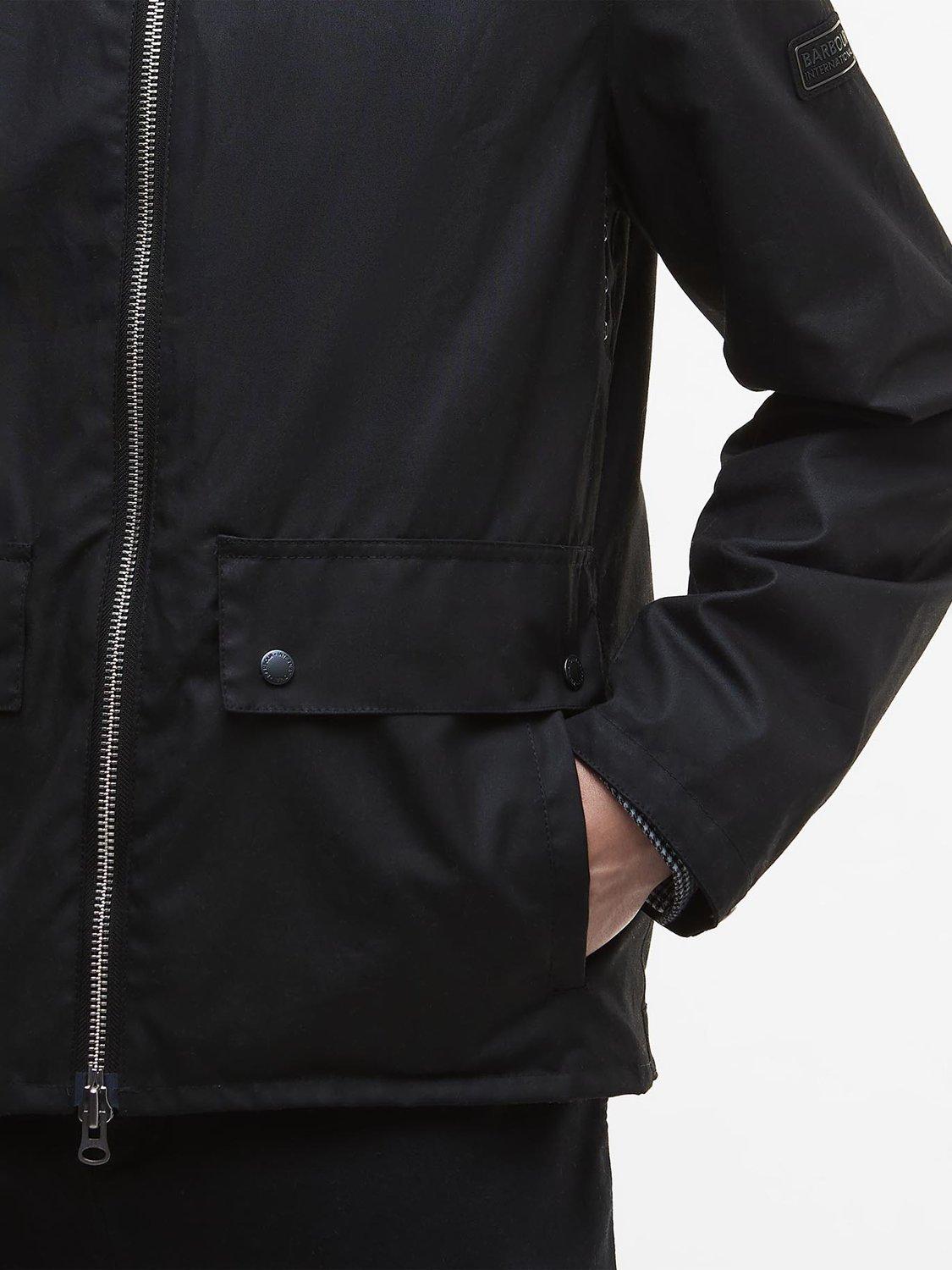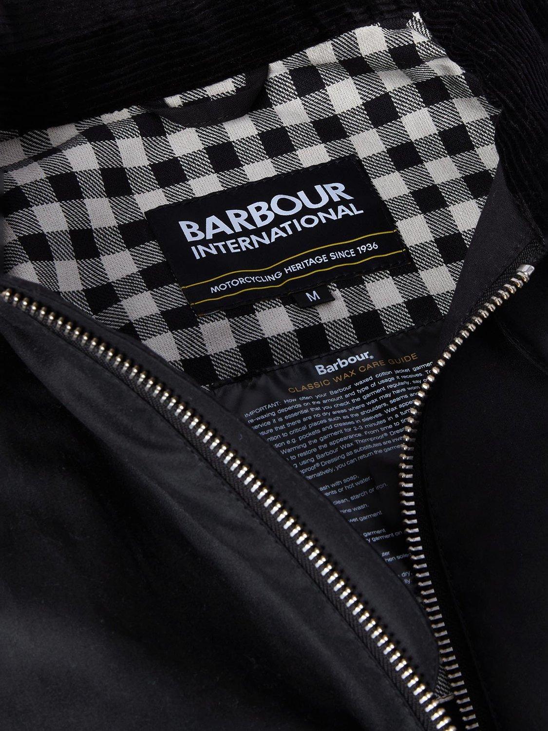 Taking inspiration from the Black Streak Jacket, the Barbour International Marker Wax Jacket boasts a boxy design with an exposed front zip fastening. A cord collar pays homage to classic Barbour while gingham adds a playful touch. Boasting a Barbour International lozenge to the side arm, it's finished with two lower pockets for on-the-go storage.