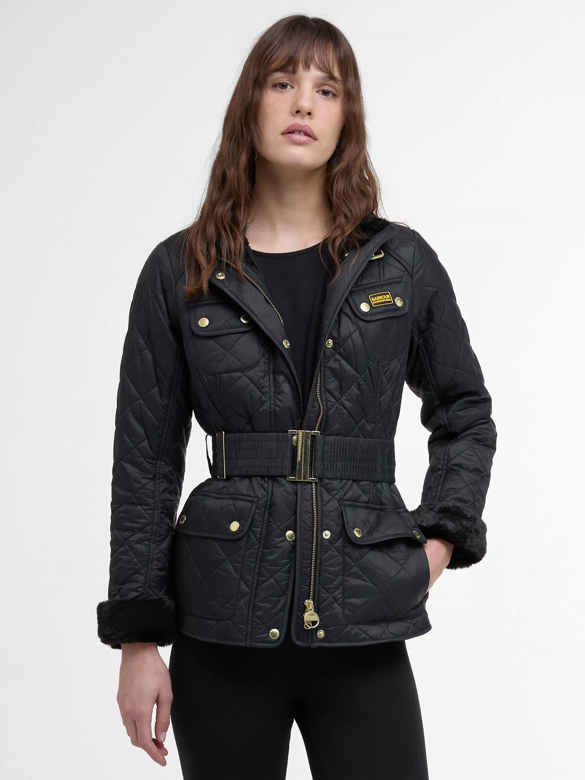 Boasting a stylish take on the classic quilt, the Barbour International Modern Polarquilt showcases a stud front fastening and a snap buckle fastening belt. Boasting a faux-fur-lined inner cuff and a curved hem, this belt showcases timeless style with its four-stud fastening pockets and a neck strap. A Barbour International branding to the left chest pocket flap finishes the garment.
