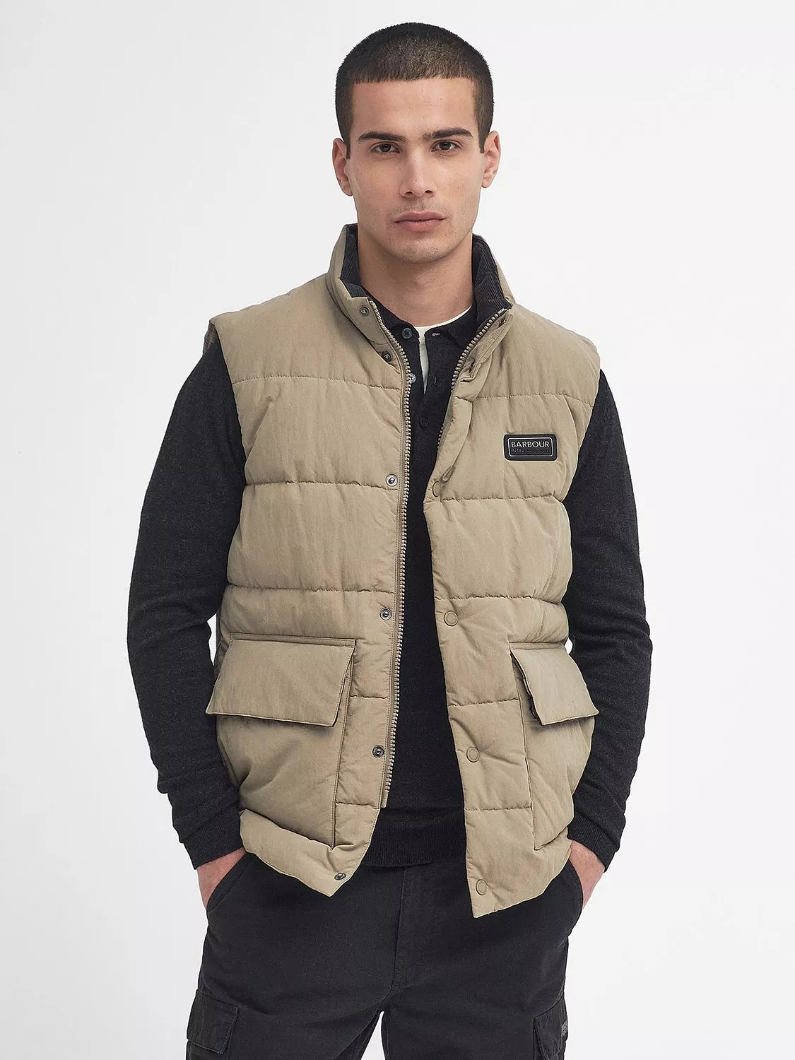 The ultimate layering staple for the transitional months, the B.Intl Morville Gilet delivers premium warmth from head to toe thanks to its baffle quilted design. Detailed with two oversized patch pockets and a Barbour International logo plaque to the chest, this sleeveless silhouette is perfect for pairing over t-shirts, sweatshirts and knitwear alike.