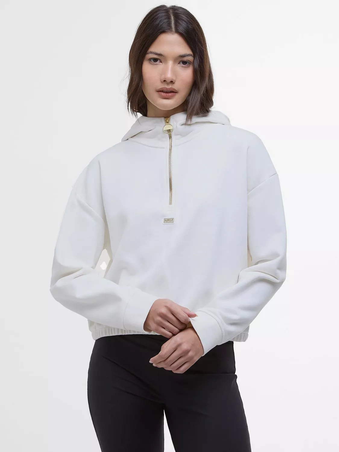 Made from a super soft stretch jersey fabric for comfort, the Barbour International Priya Half-Zip Hoodie is elevated with considered branded details such as a logo patch and ring-pull zip for a modern finish.