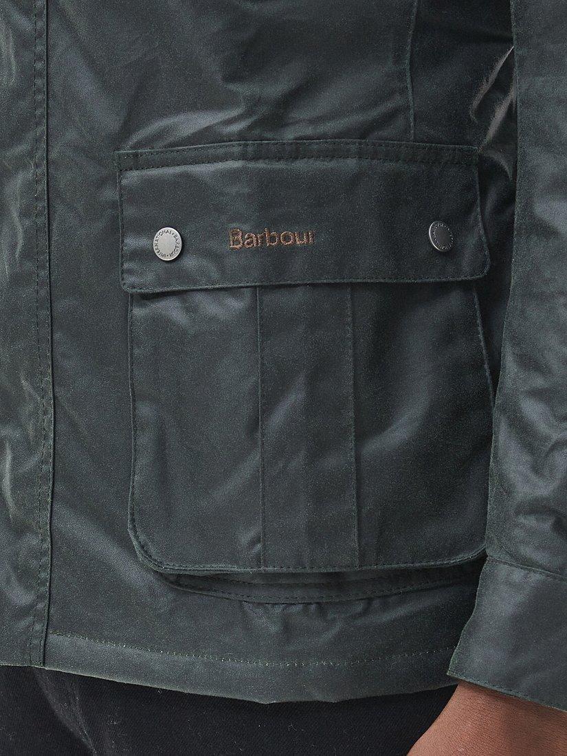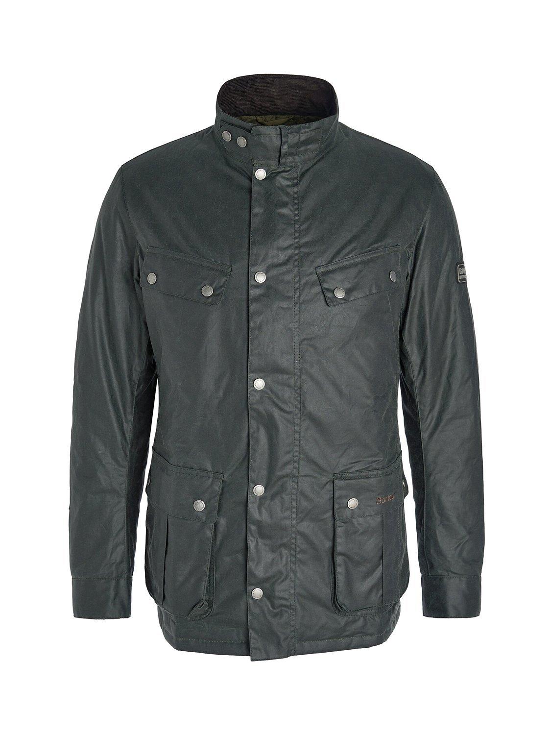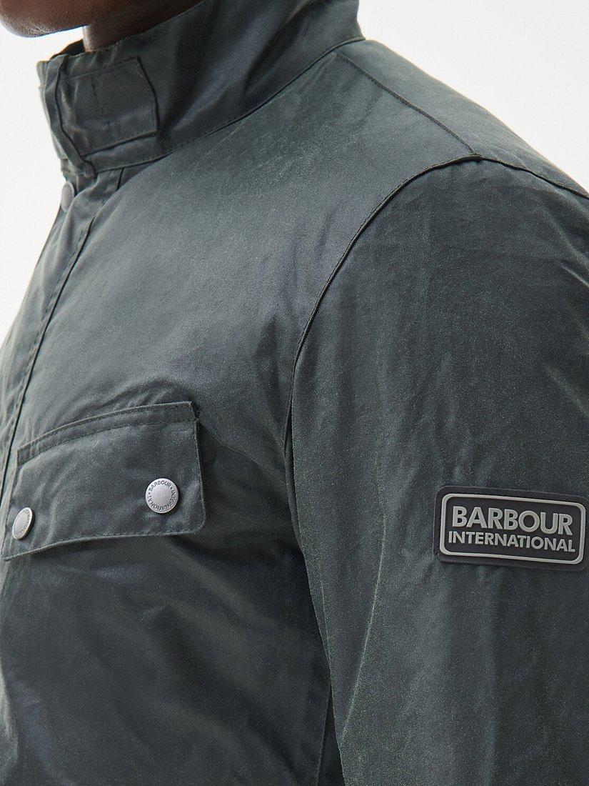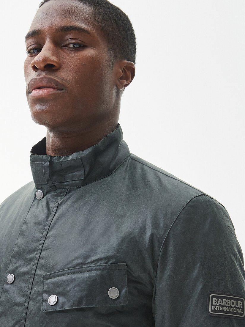 The Barbour International Duke Wax Jacket boasts self-fabric overlay elbow patches, two lower bellow pockets and two chest welt pockets. The perfect layer for city and country exploring, this jacket offers a quilted lining and is finished with a branded silicone badge to the left arm.