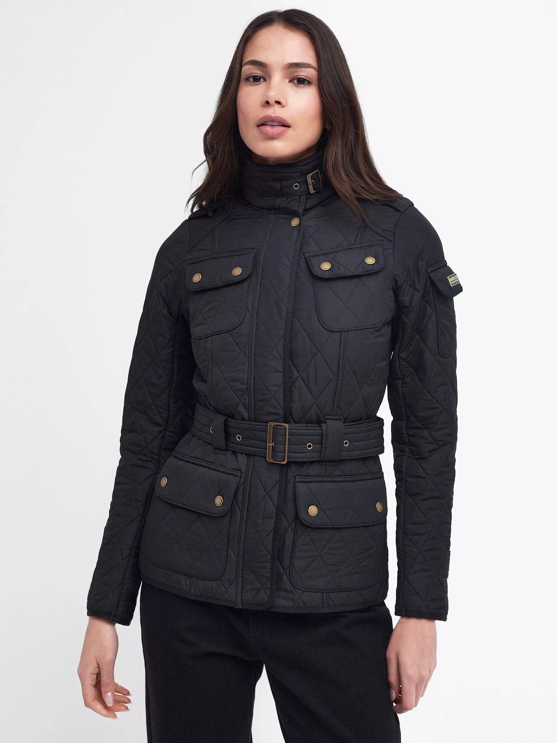 The Tourer International Polarquilt reworks Barbour's iconic biker jacket with an incredibly warm quilted outer and a quilted fleece lining. This stylish quilted jacket is cut for a feminine silhouette and stays true to its moto heritage with authentic details including a collar strap, metal buckles and studs, shoulder patches and a single sleeve pocket. Well-equipped for cold weather, it teams Barbour's unique Polarquilt combination with a fleece-lined funnel neck and generous front pockets, which offer room to keep hands warm and essentials safe. An adjustable fabric belt defines the waist for an extra flattering touch.