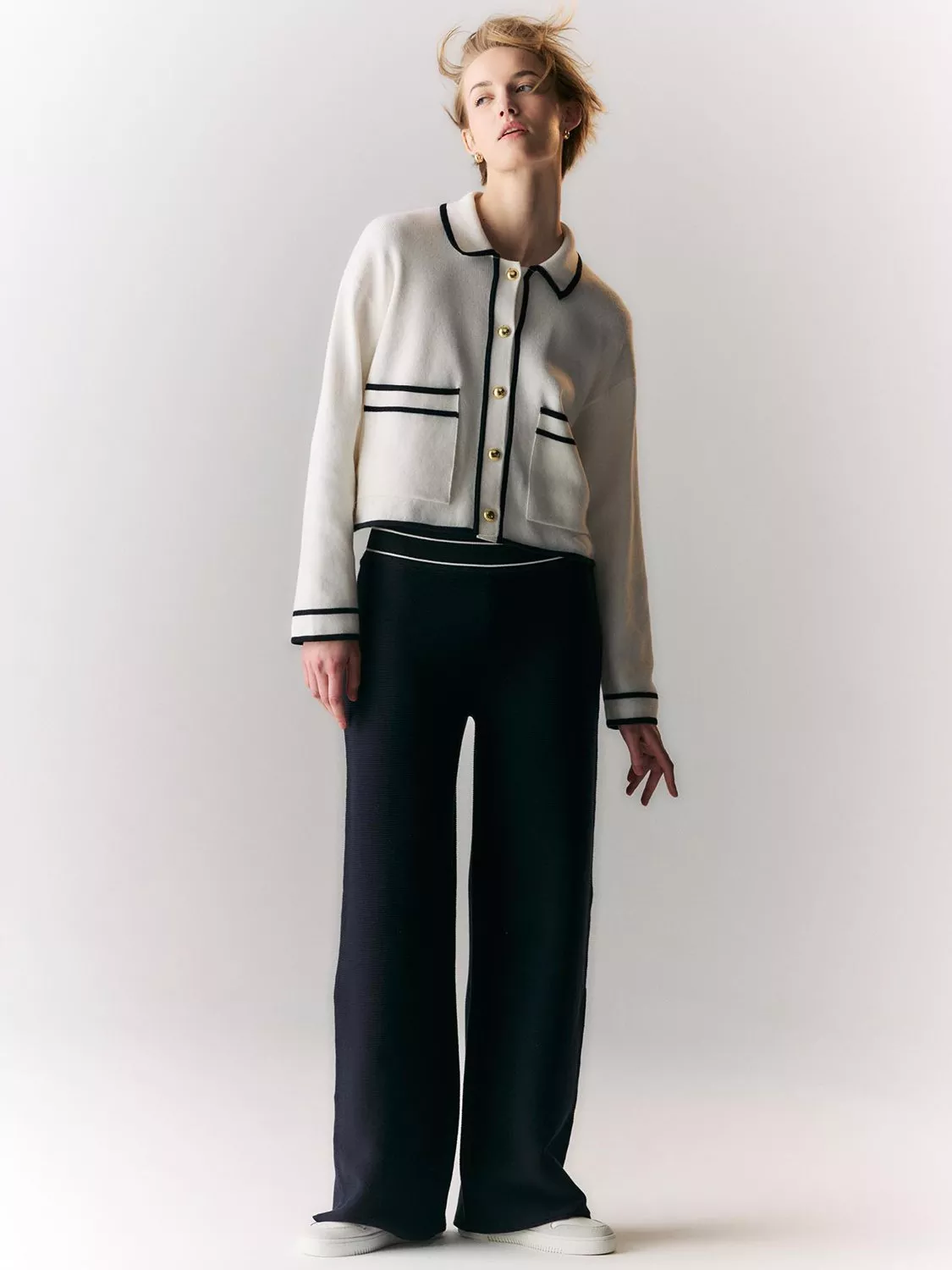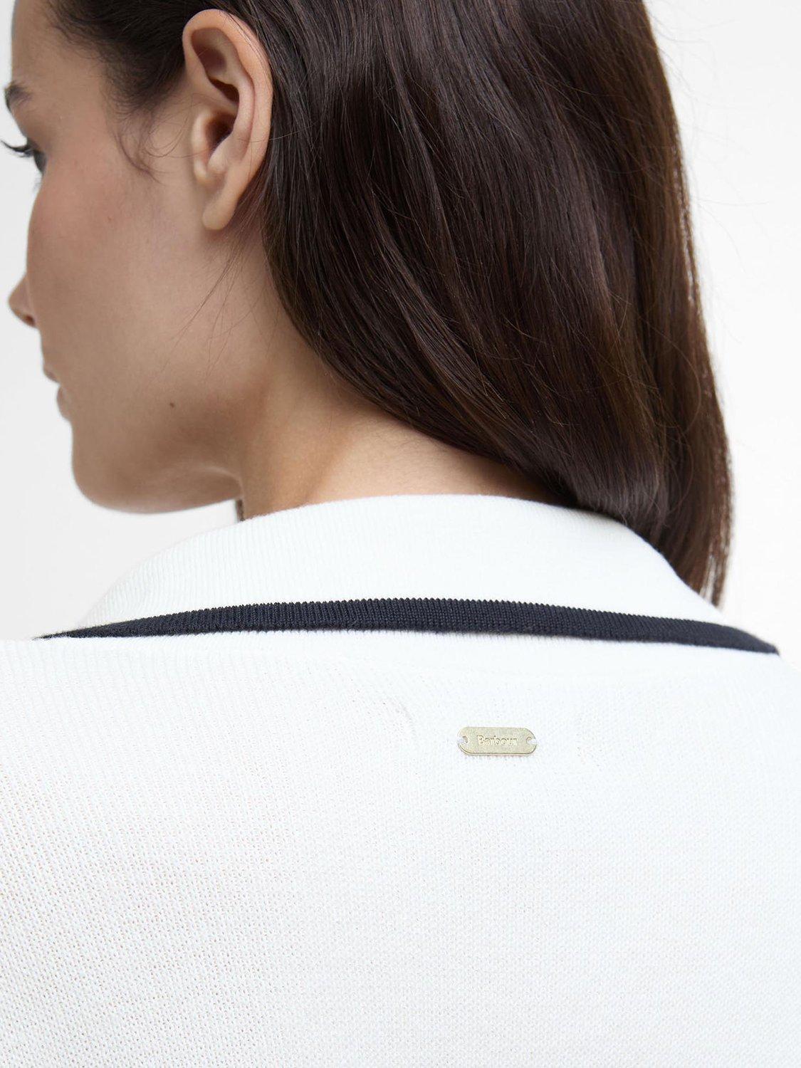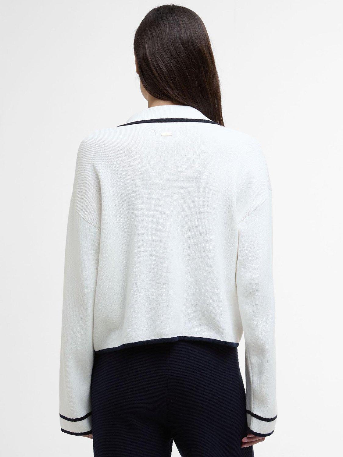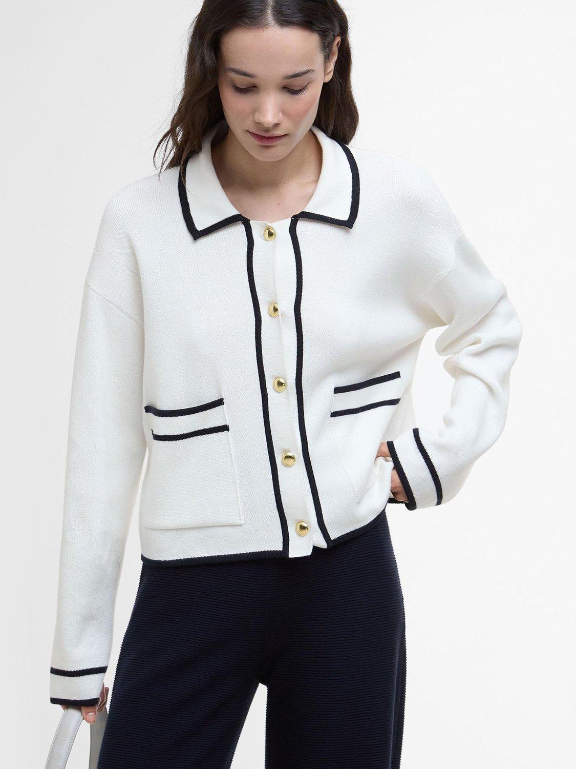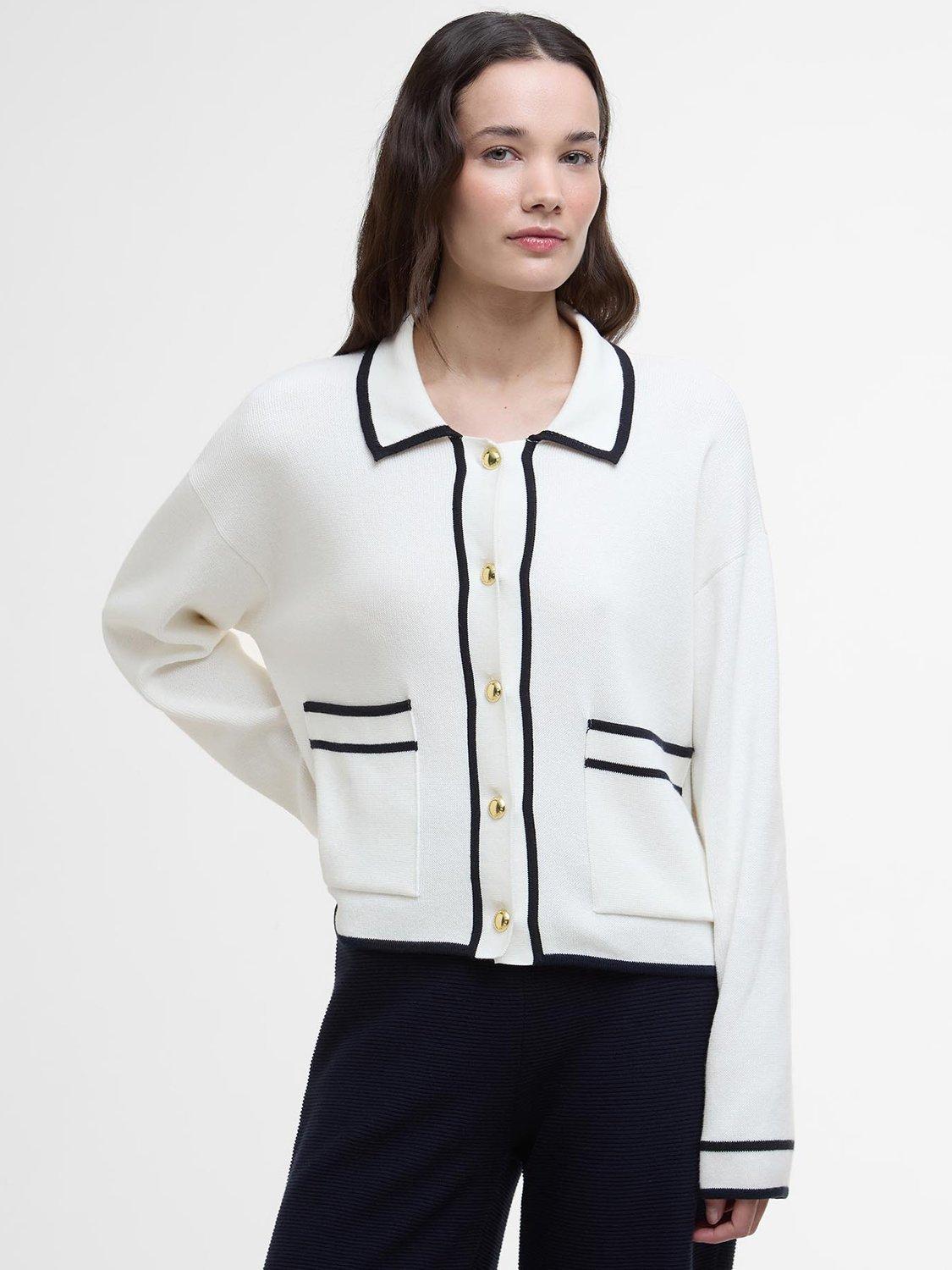 The Barbour Jasmine Knitted Cardigan is cut to a boxy design with contrast tipping details to the hems. Boasting contrast metal buttons and angled patch pockets, this cardigan takes inspiration from maritime design for the perfect everyday layering piece.