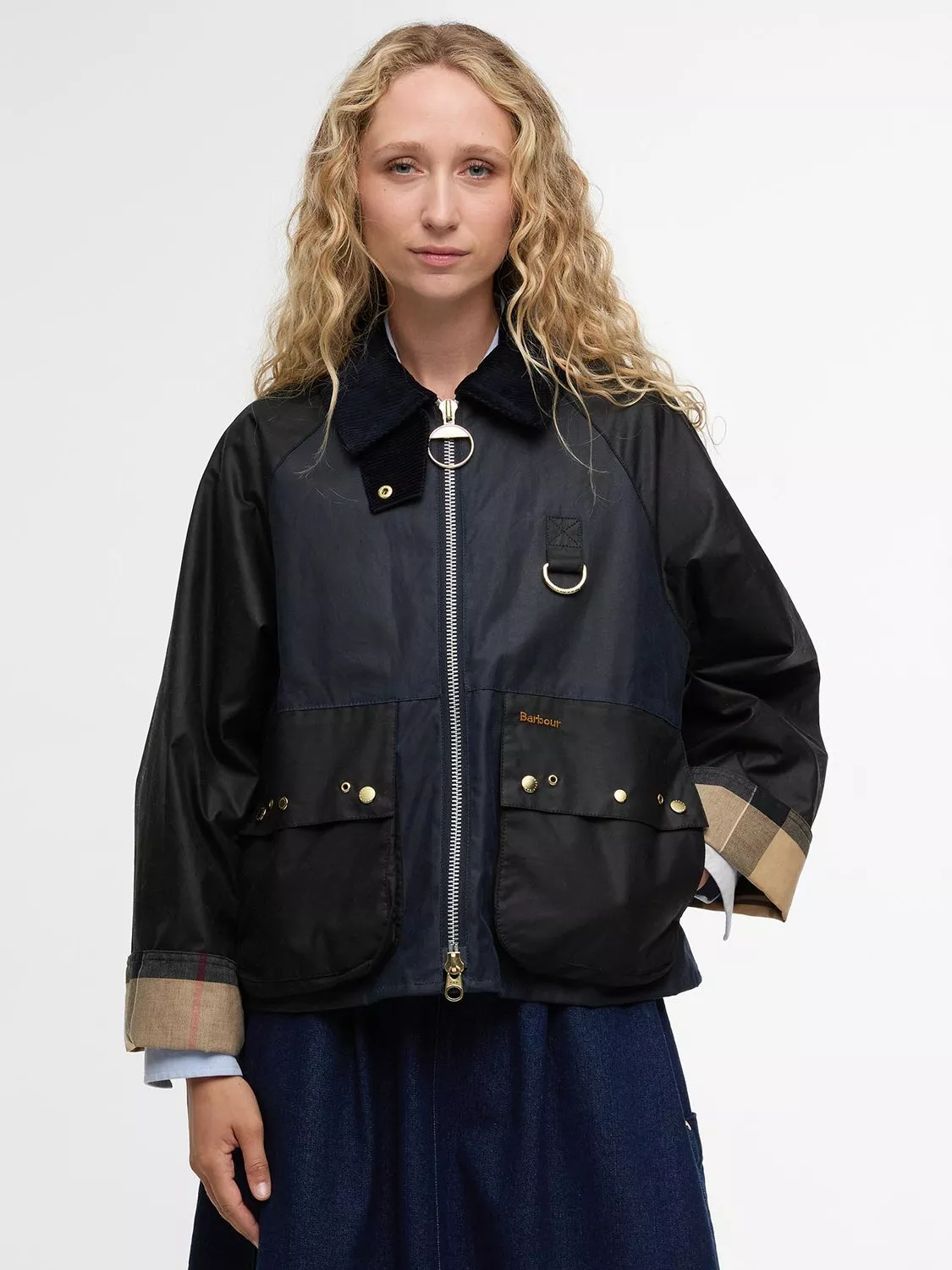 Crafted from 100% waxed cotton, this Spey-inspired jacket blends rugged charm with refined details. Bright brass hardware, a silver zip, and a needlecord collar deliver standout accents, while the metal D-ring adds a functional edge. The tartan lining and inner cuff lend a heritage touch. Pair it effortlessly with dark jeans and leather boots for a timeless, versatile look.