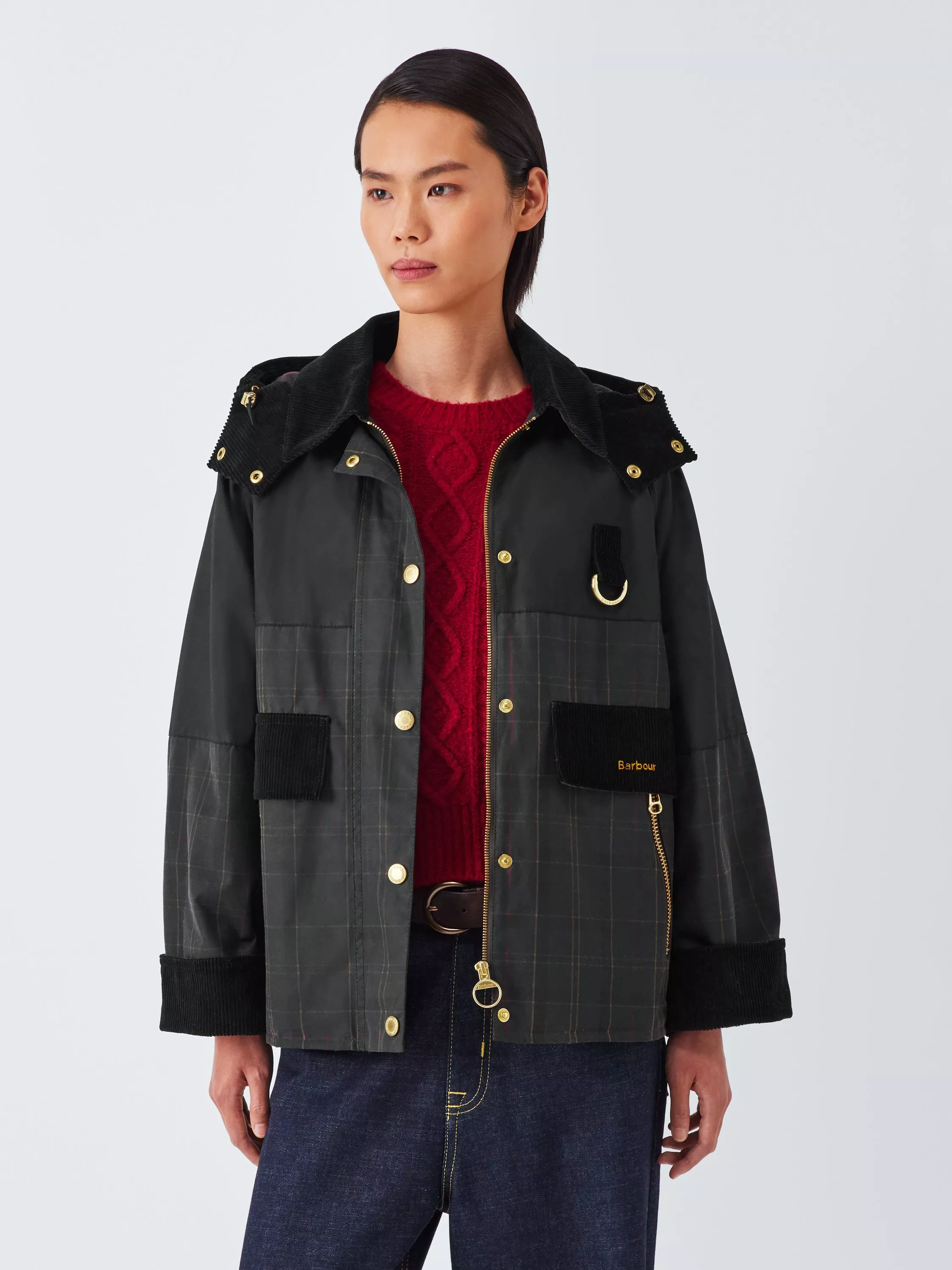 Inspired by Barbour's iconic Spey jacket, the Barbour Lanton Waxed Jacket has you covered. Featuring a patchwork of tartan, cord and plain panels paired with a lightly insulated snorkel hood, handwarmer pockets and cord trims for a classic Barbour look.