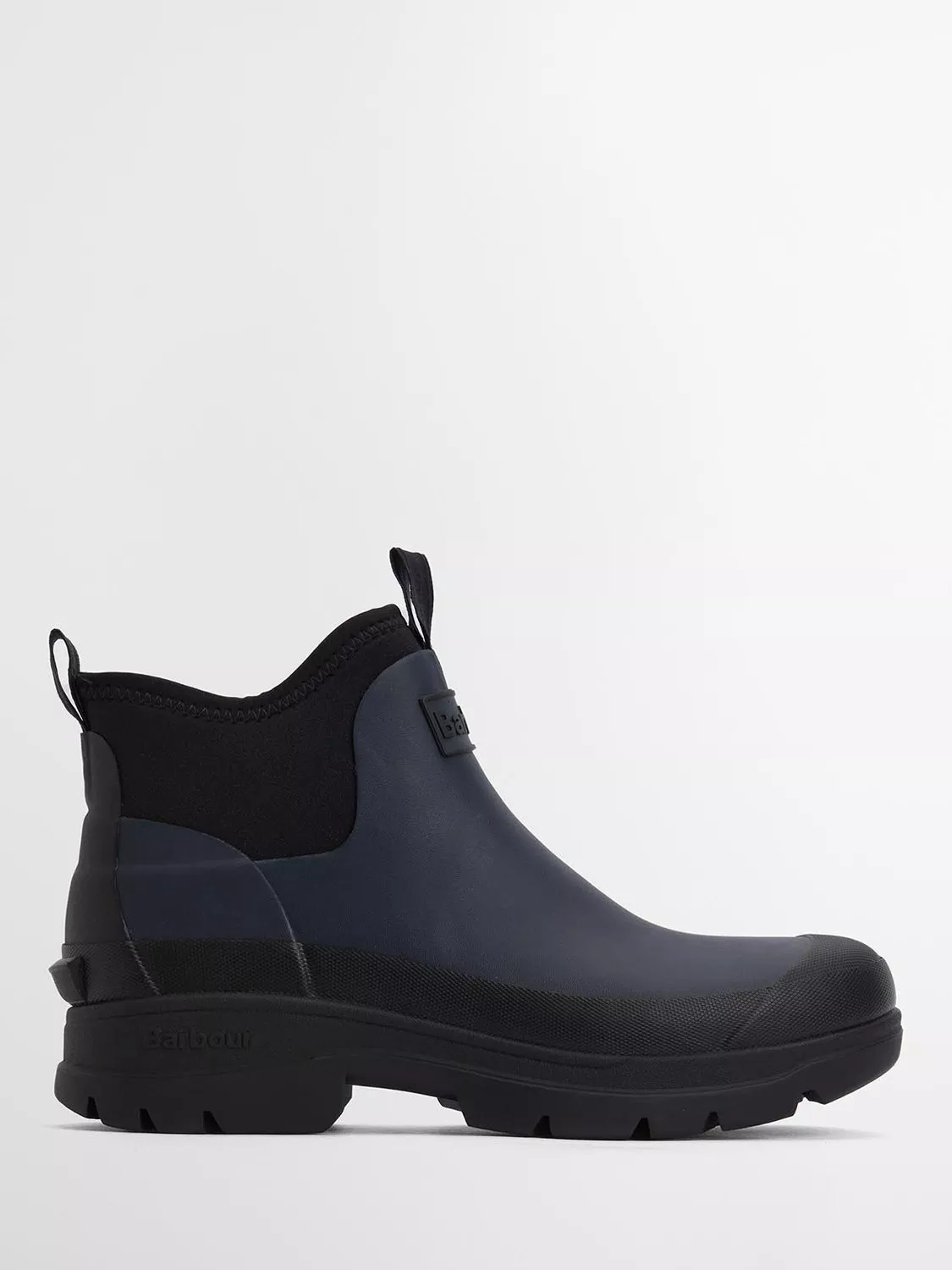 A Barbour wellington boot with a ridge sole unit and sidewall Barbour branding, as well as convenient pull tabs for ease of wear.