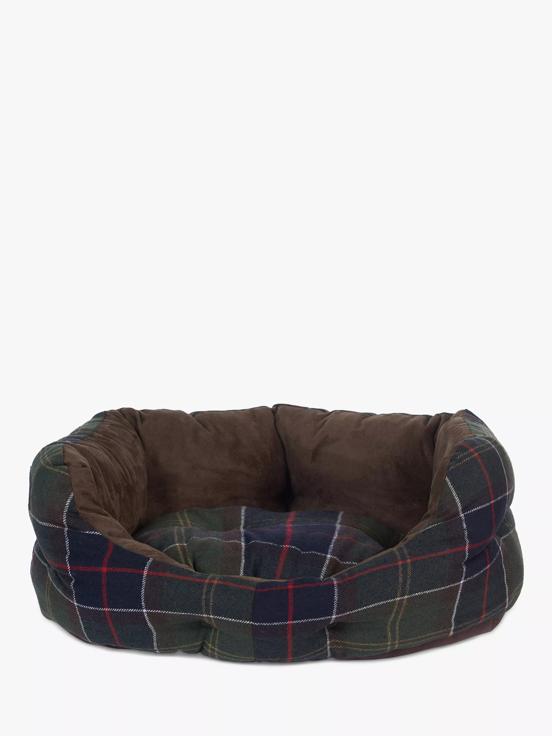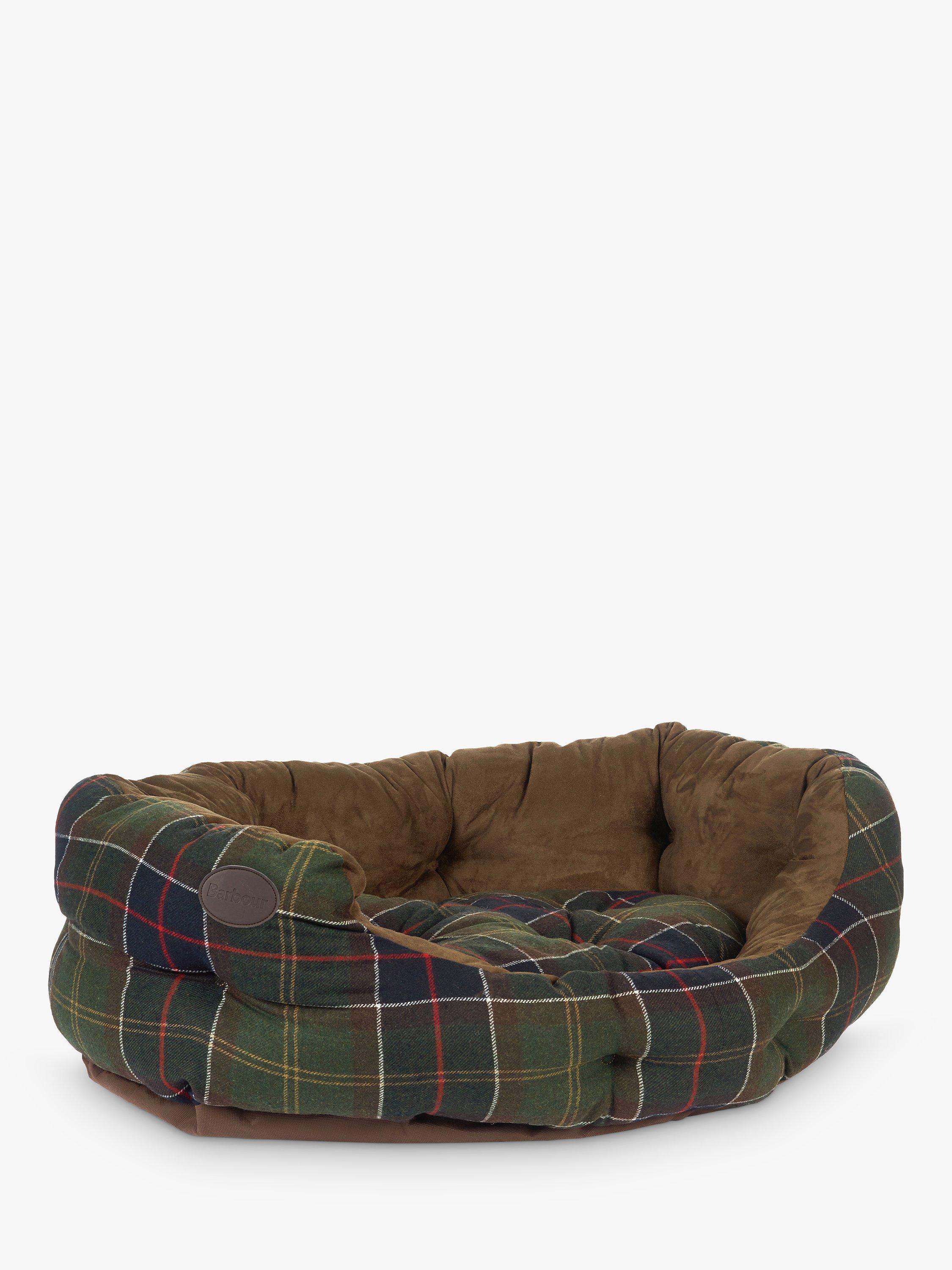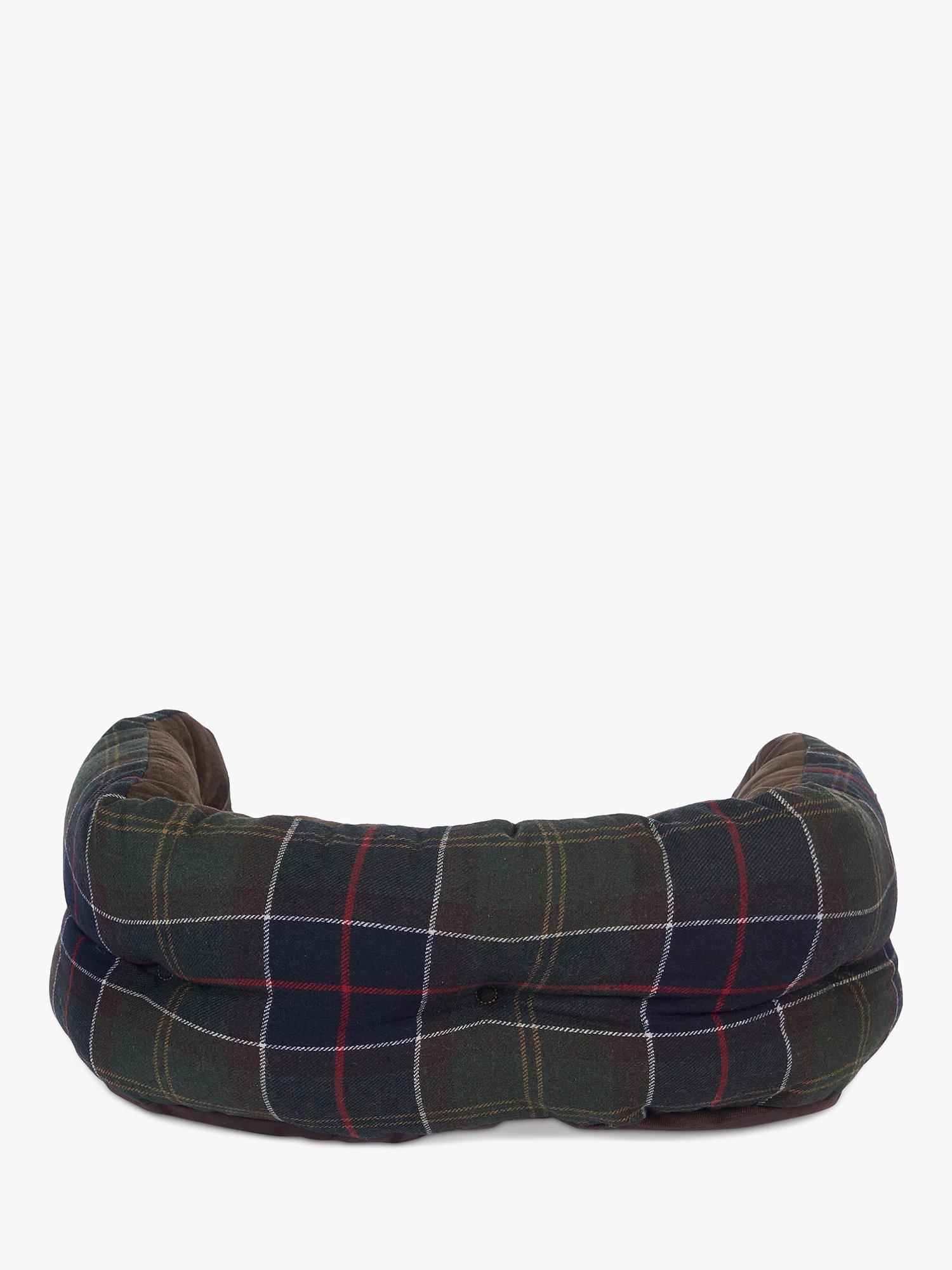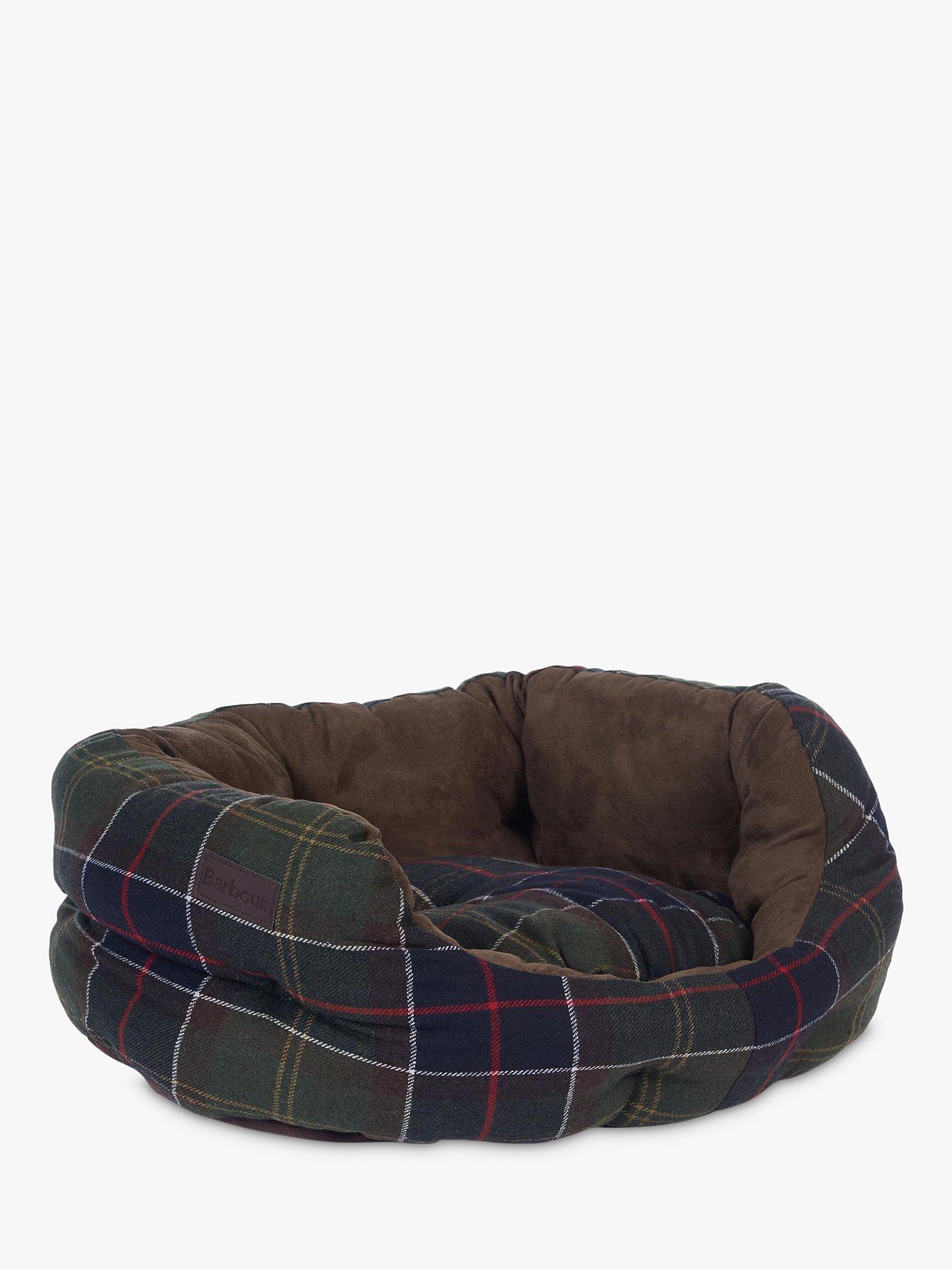 This luxurious dog bed features a wool-touch Barbour Tartan outer and a soft faux-suede inner. The cushion pad is both removable and reversible, and its polyester wadding keeps dogs warm and dry.