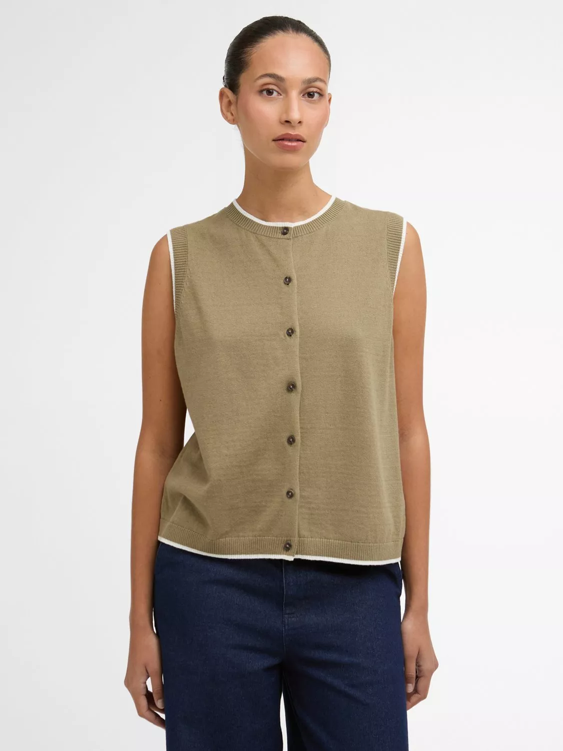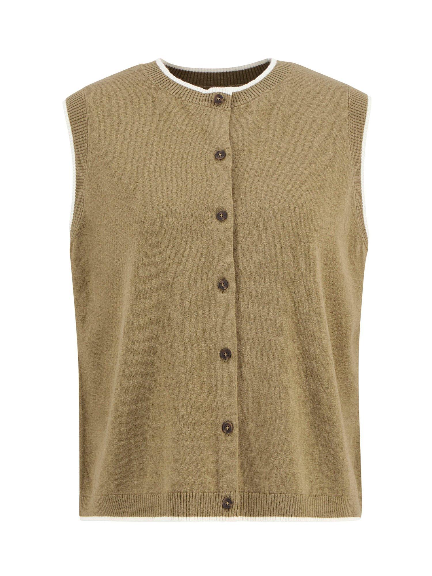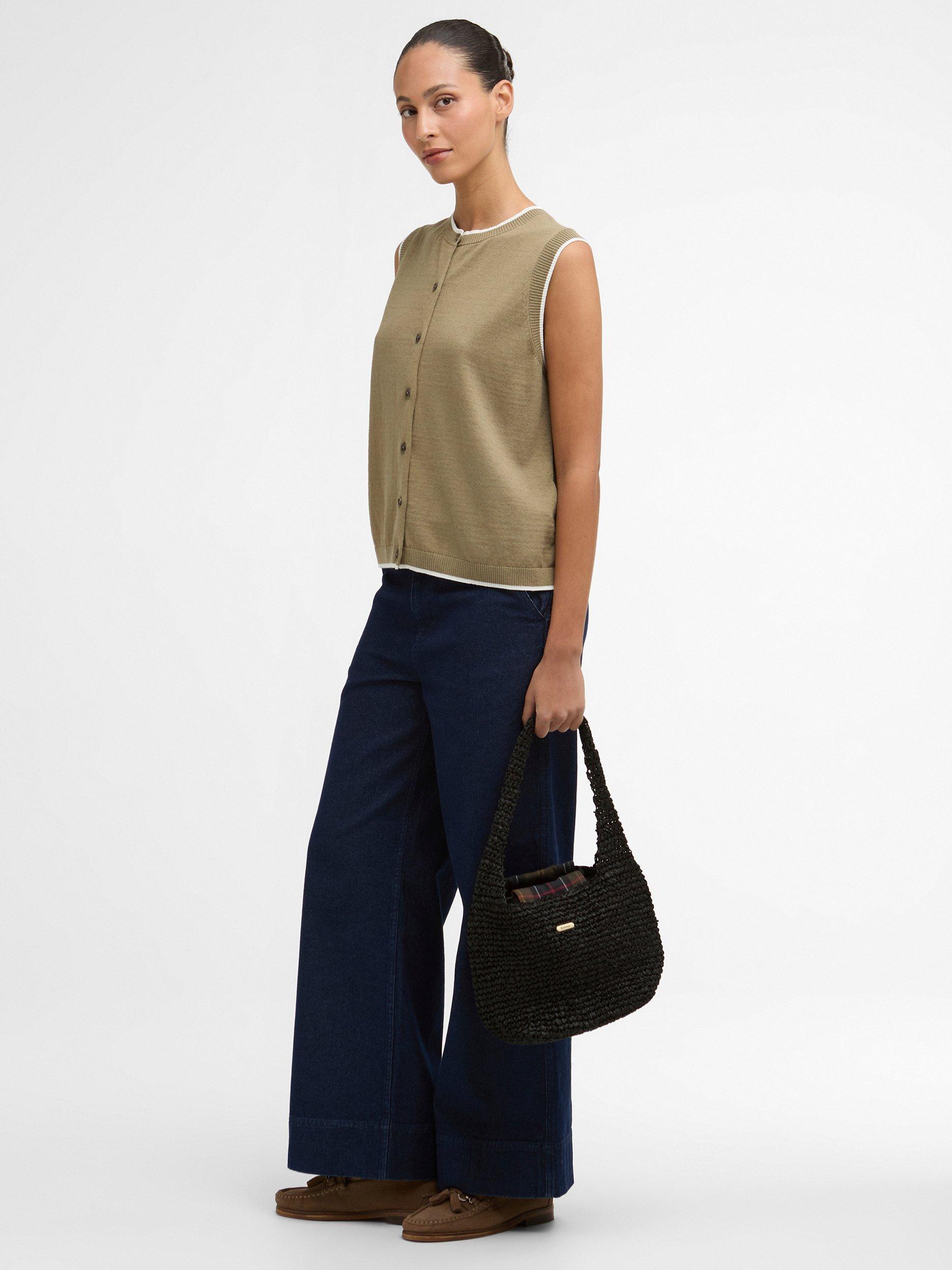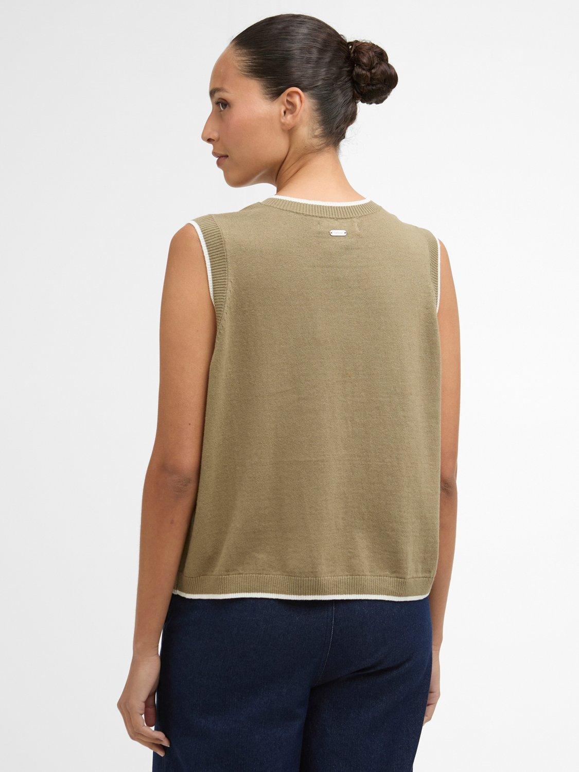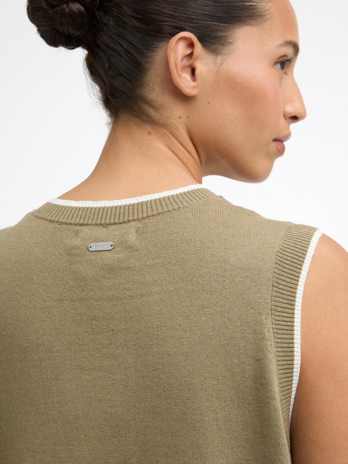 The Barbour Maia Knitted Vest is a modern layering essential crafted from a breathable cotton-linen blend. This button-through design features contrast tipping at the rib trims, Barbour-branded mock horn buttons along the front, and a slim metal ID bar at the back neck. Effortlessly versatile, it brings a refined touch to relaxed seasonal styling.