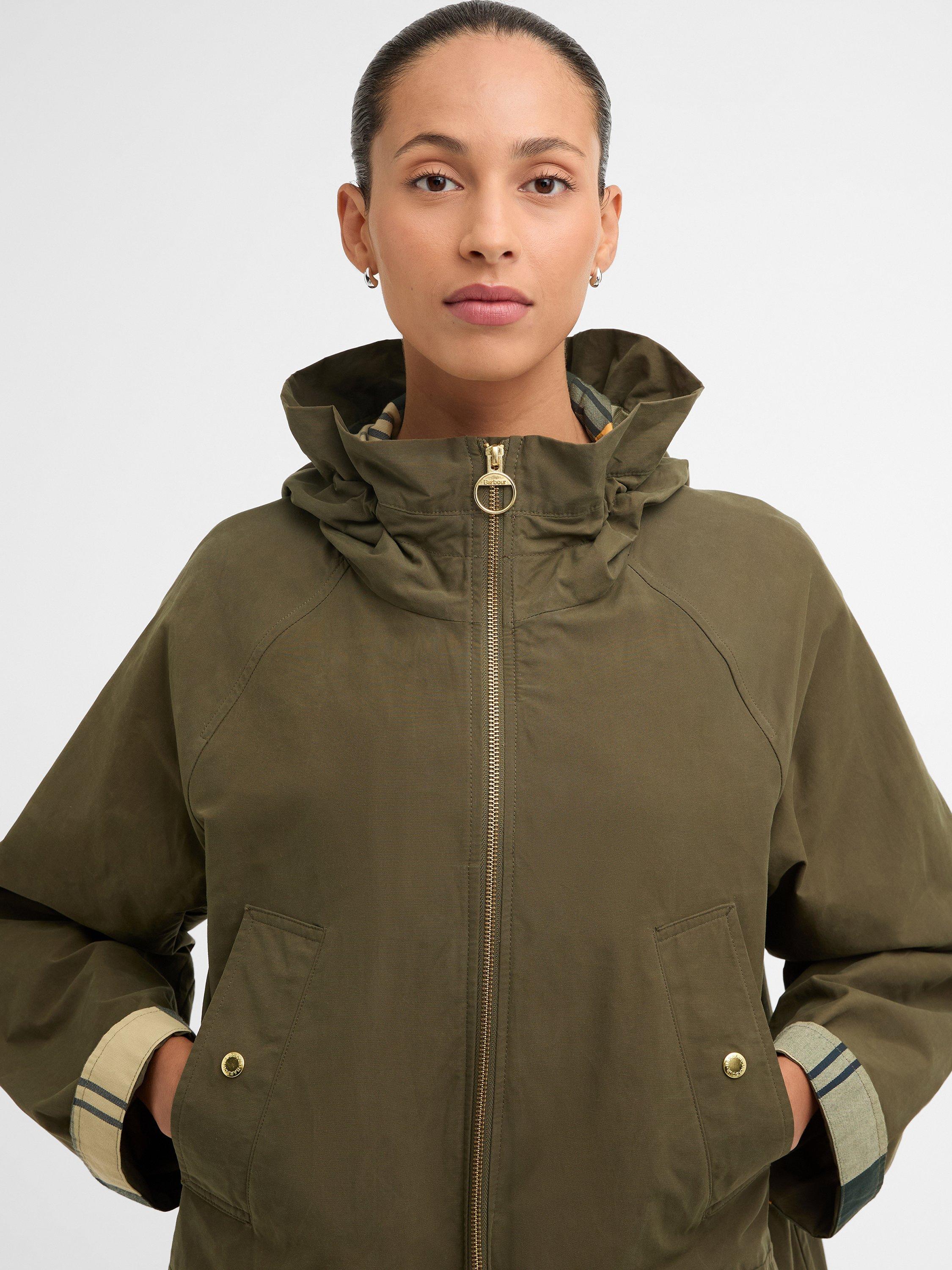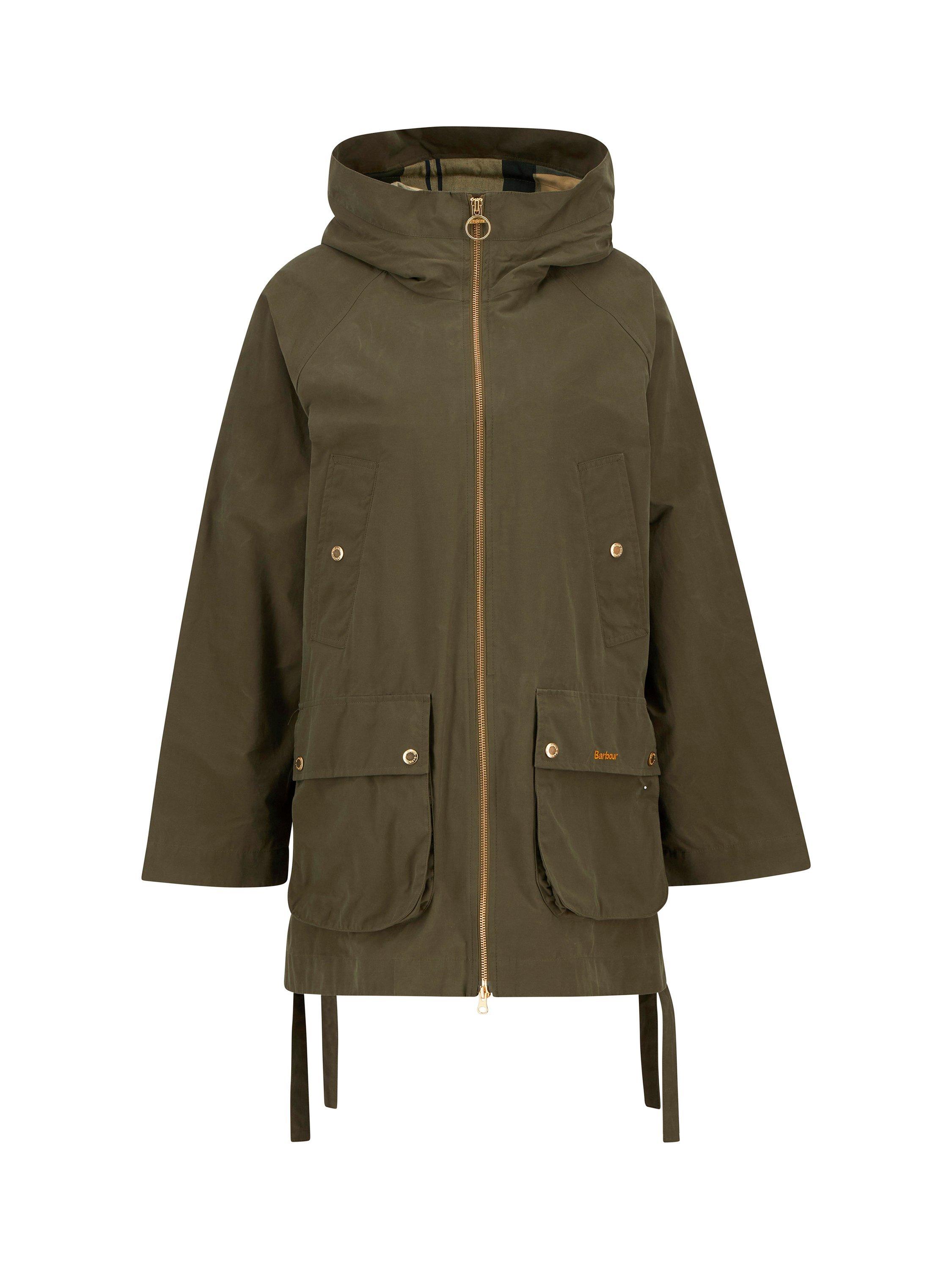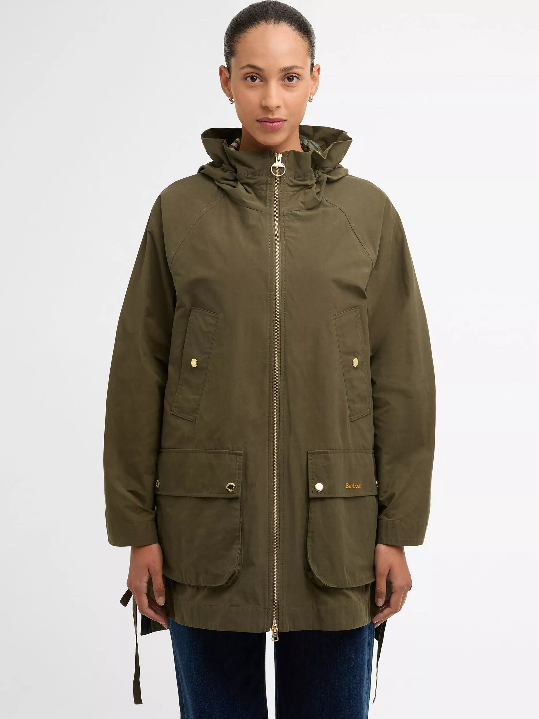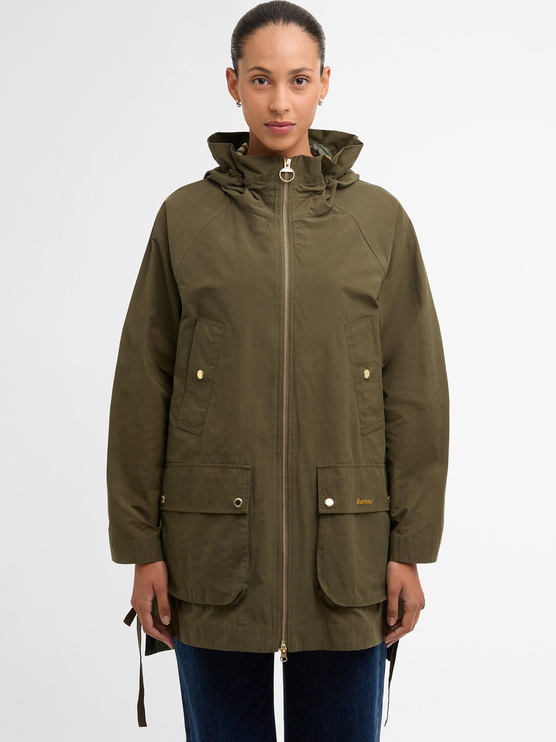 Designed with plenty of functional accents, this showerproof coat by Barbour comes in a flattering longer length and fastens with a practical zip.