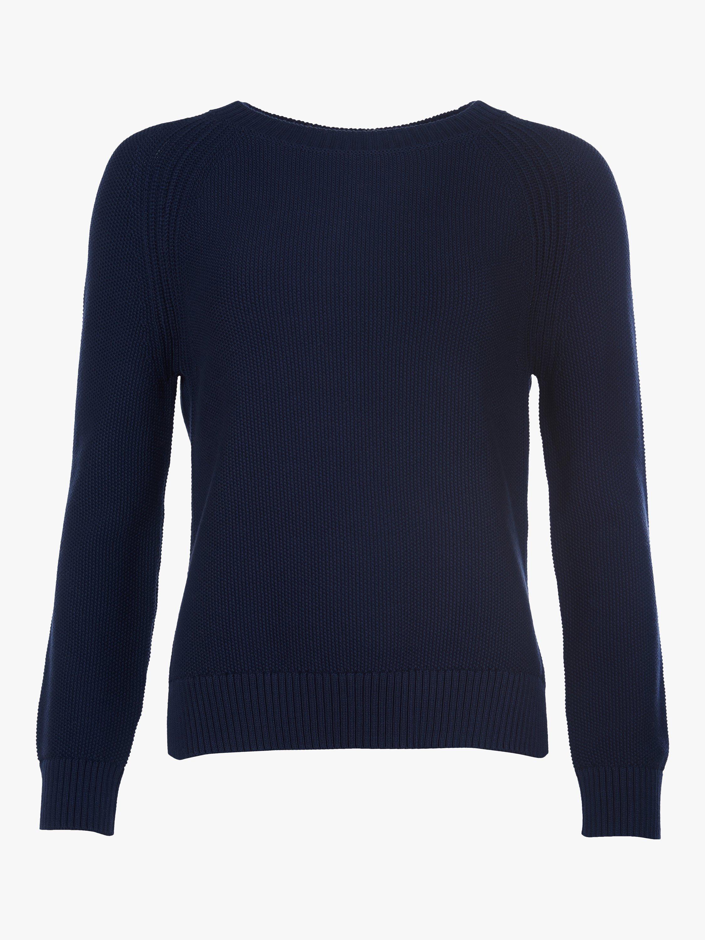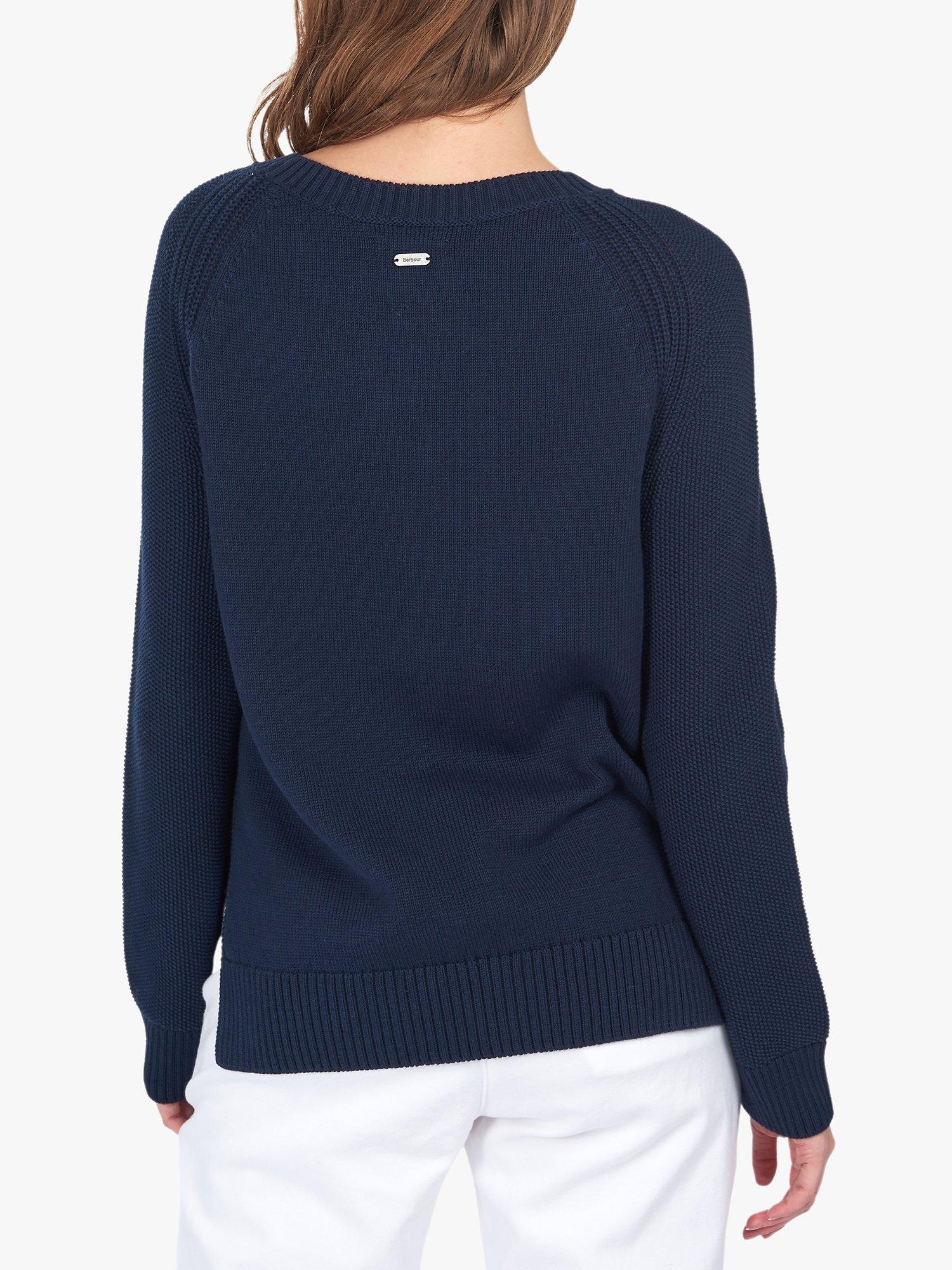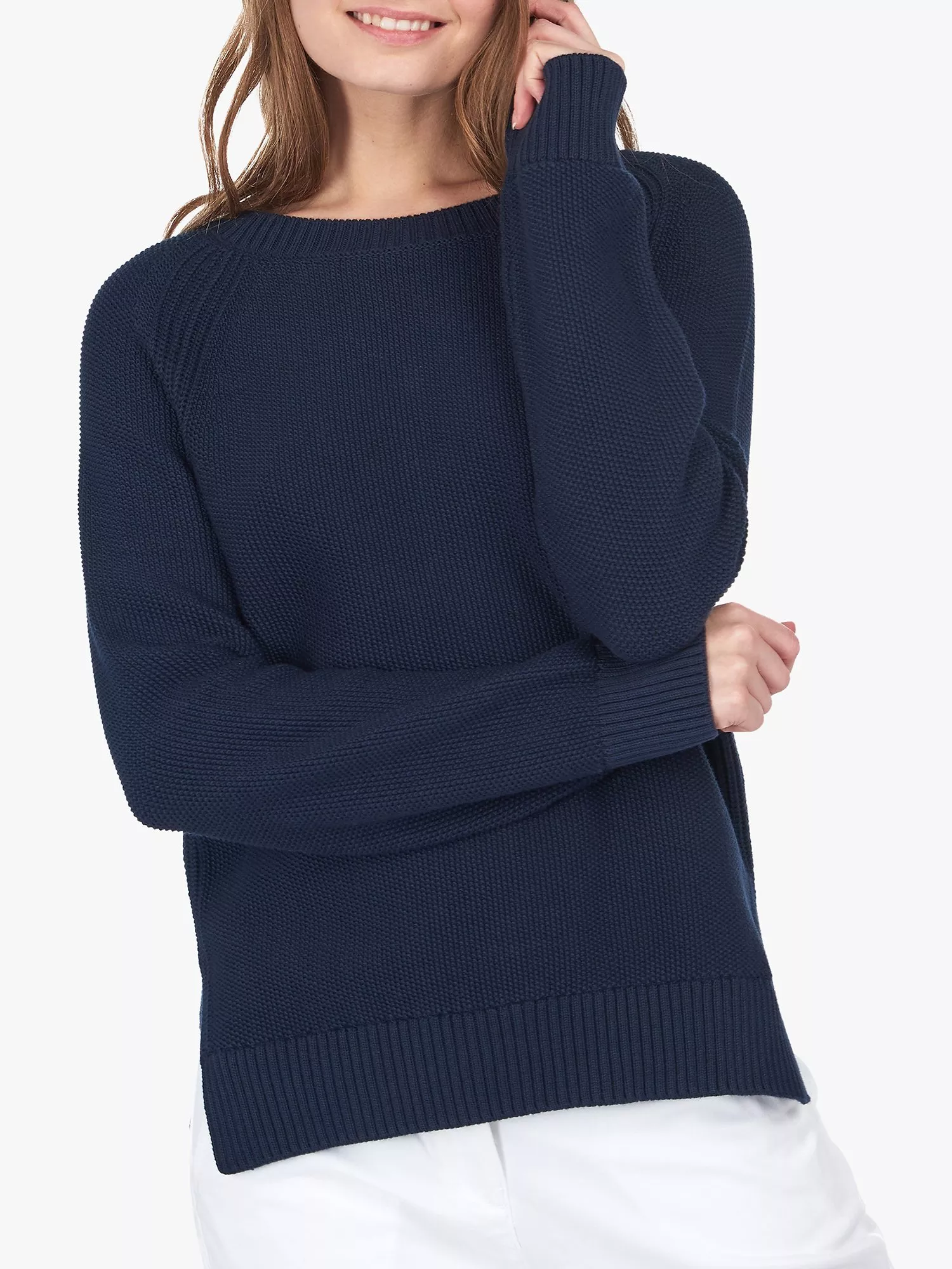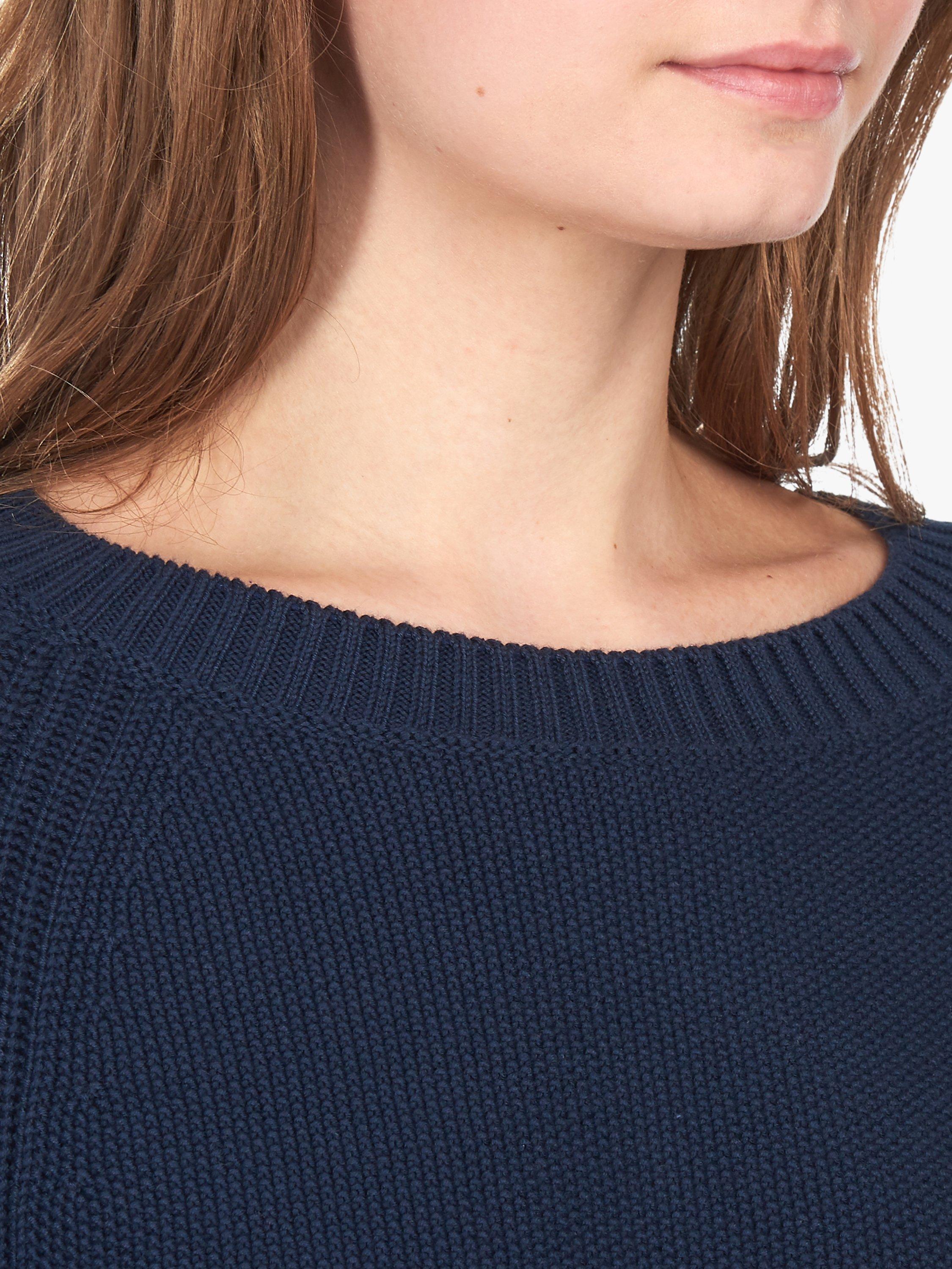 A textured jumper from Barbour featuring a chunky basket weave front, this soft knit has an easy relaxed shape with side splits to skim over the hips. Designed with a wide boat neckline so you can layer it over shirts and tees, it is finished with the brand's coastal badge on the upper sleeve.