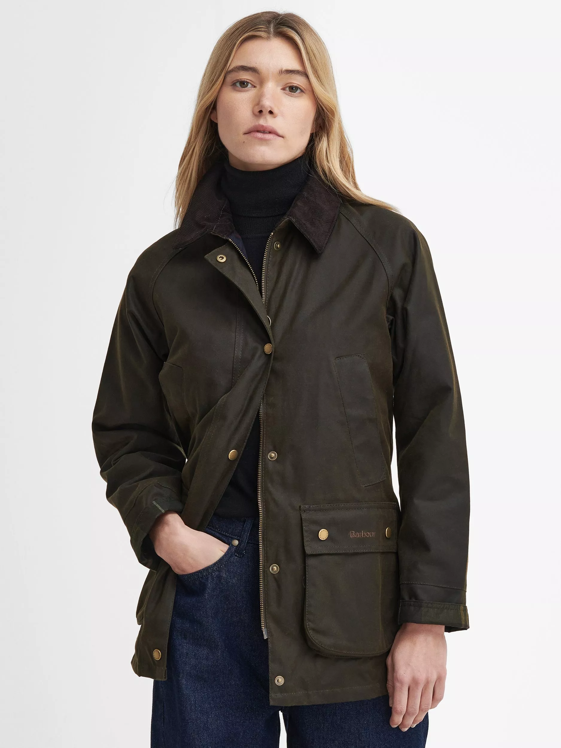 A relaxed, comfortable jacket constructed with a waxed cotton outer and Barbour's iconic tartan lining. Signature details include a corduroy collar with throat tab, handwarmer pockets and lower patch pockets detailed with tonal Barbour embroidery.