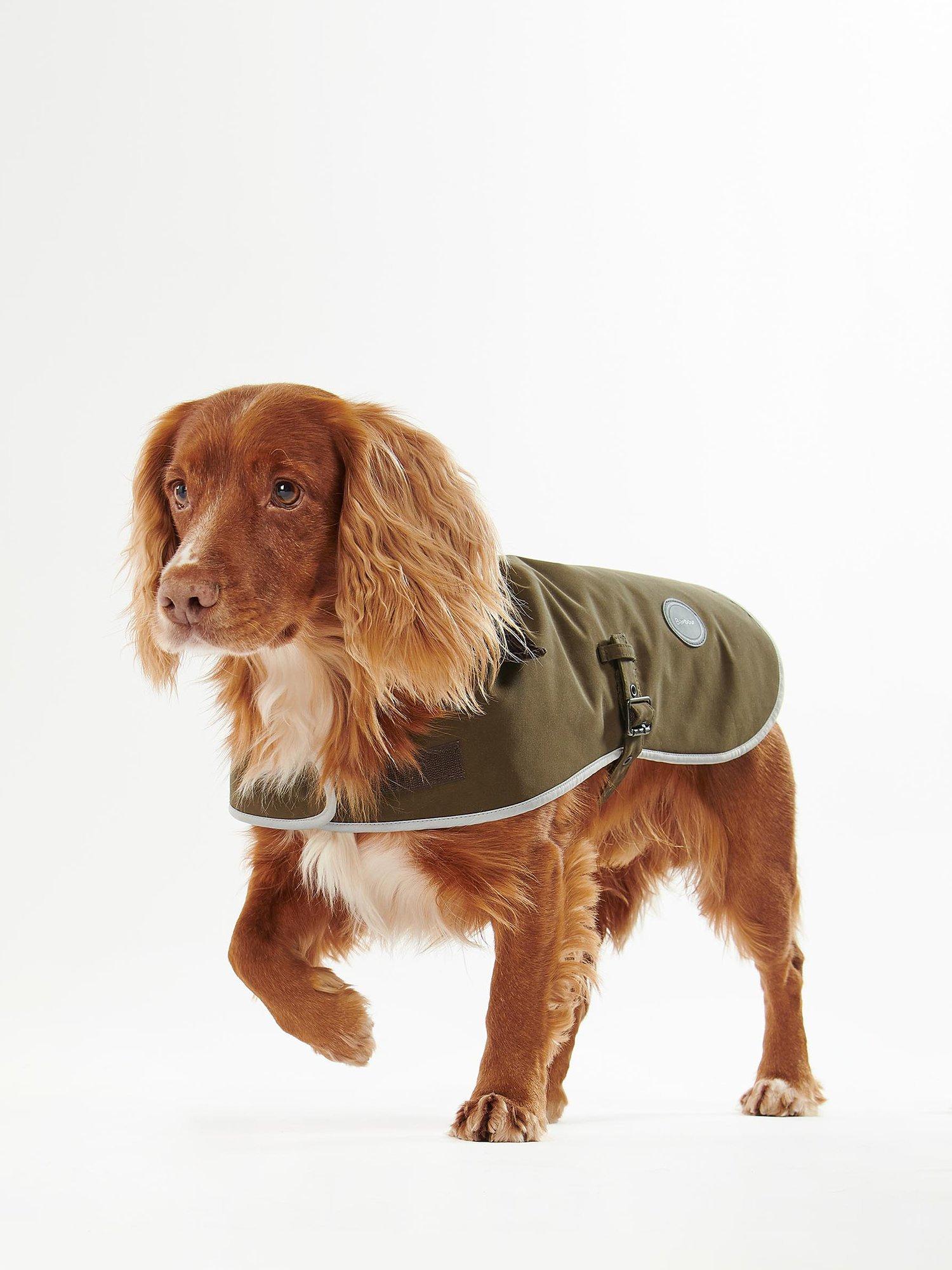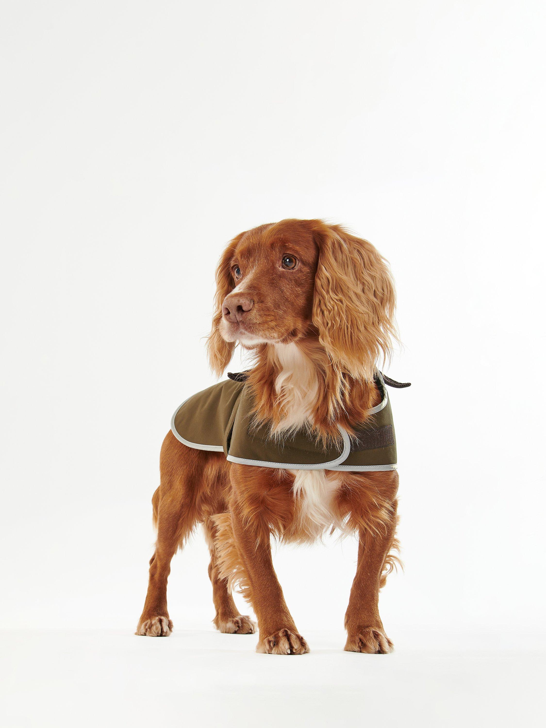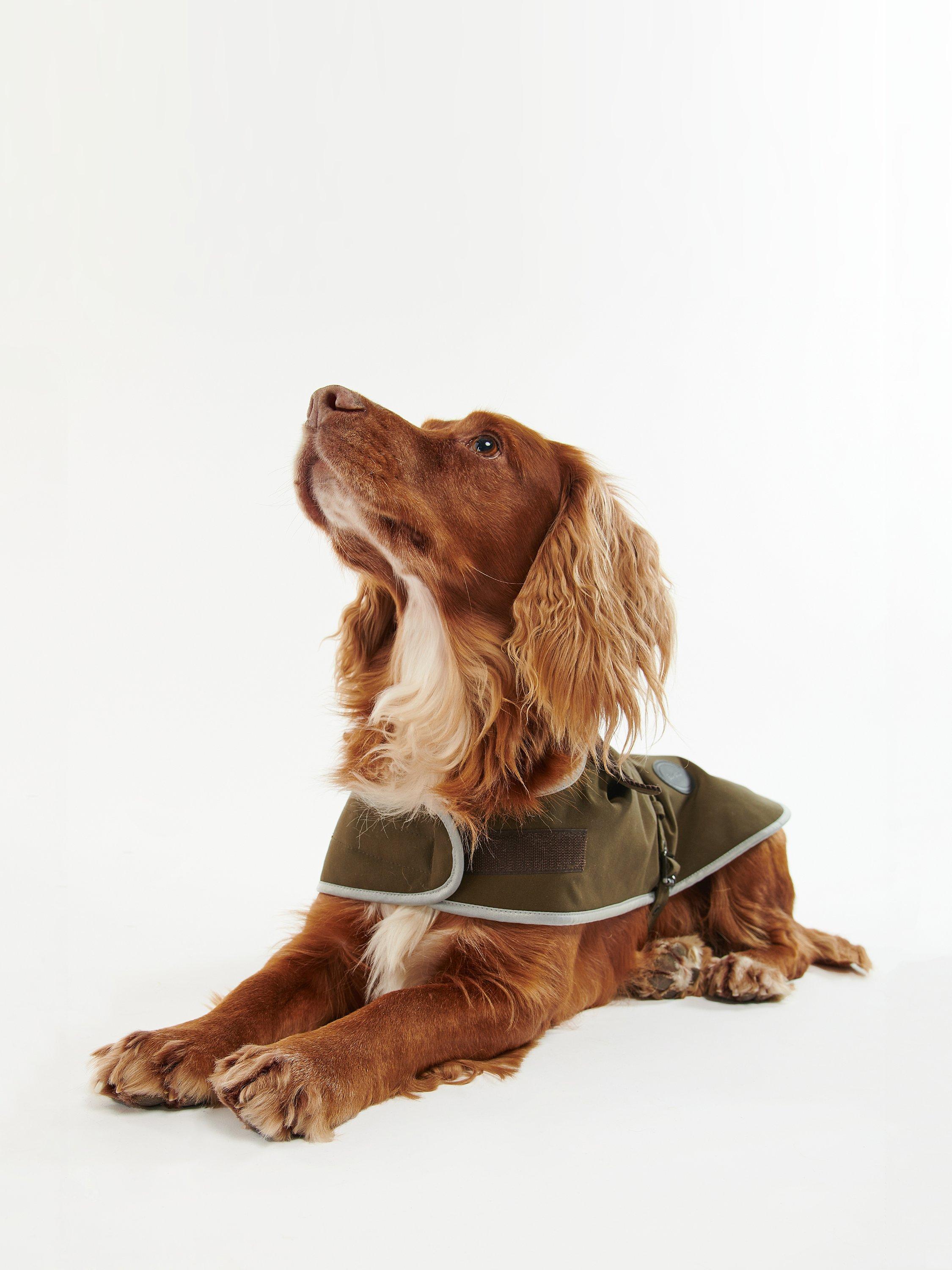 A Barbour waterproof dog coat with reflective trim and tartan lining. Trimmed with cord collar and Barbour embossed badge. With key hole opening for harness.