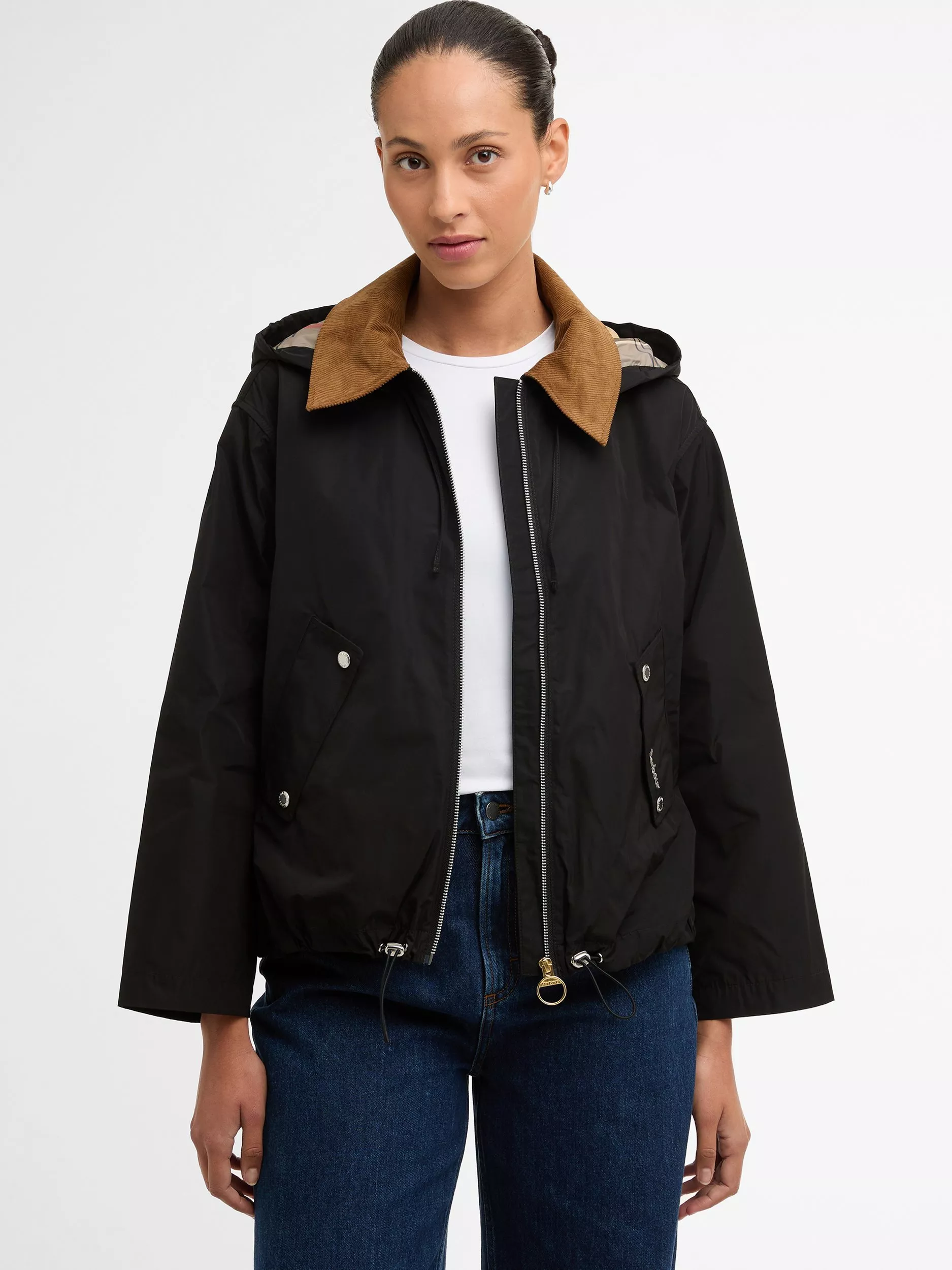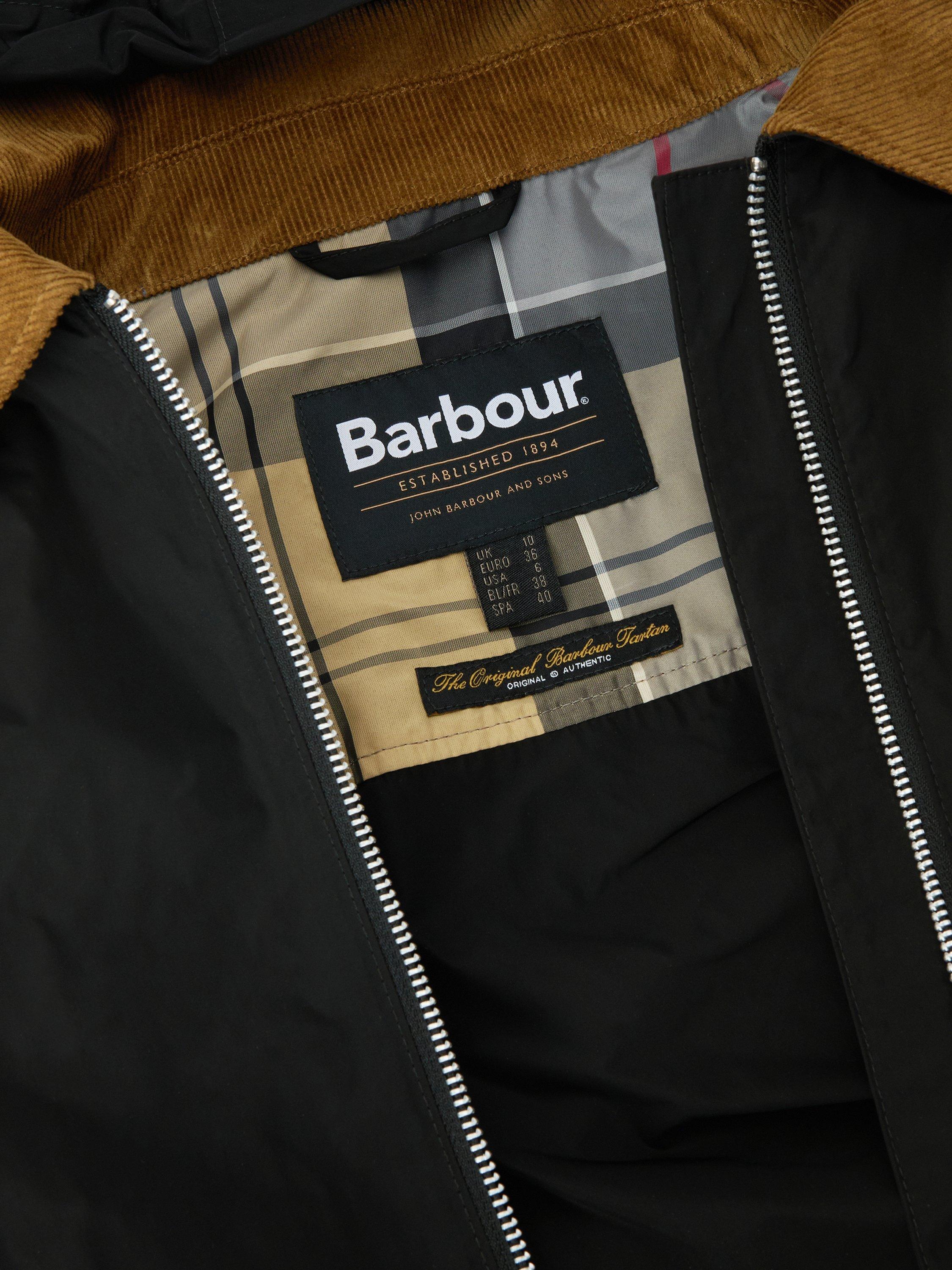 The Barbour Weaver Showerproof Jacket combines practicality with signature Barbour style. Designed with a cord collar and detachable hood, it offers versatile protection against light rain. Featuring a metal zip with an oversized ring-pull zip, studded flap pockets, and a tartan detail to the inner hood and lining, this jacket blends heritage detailing with contemporary functionality.