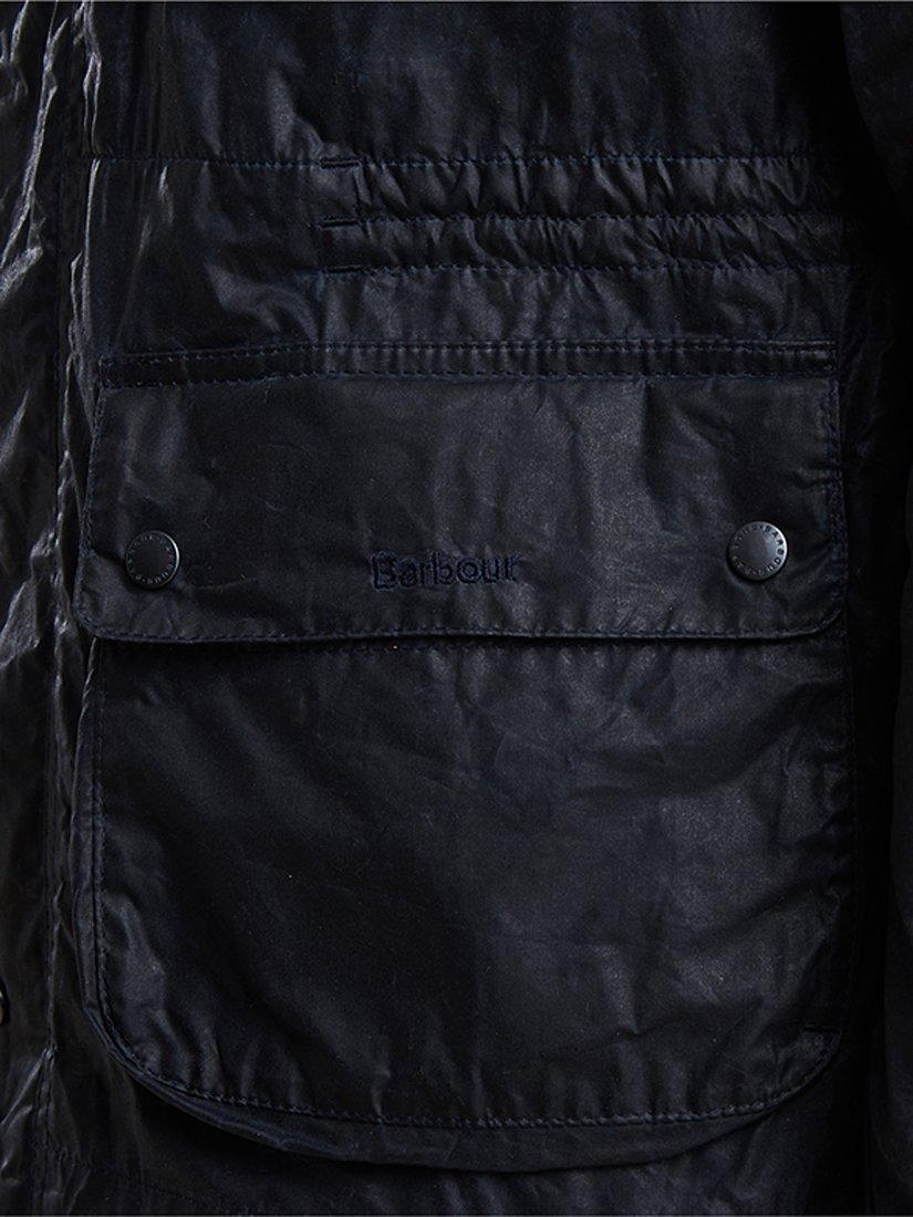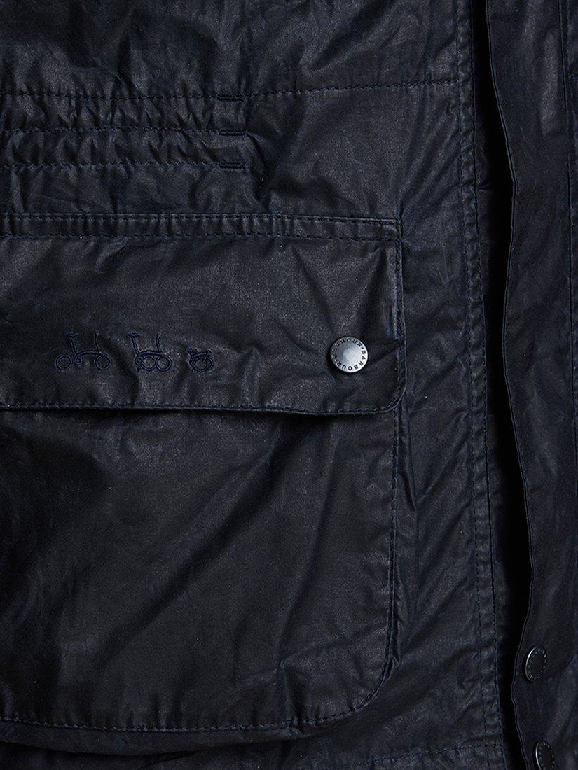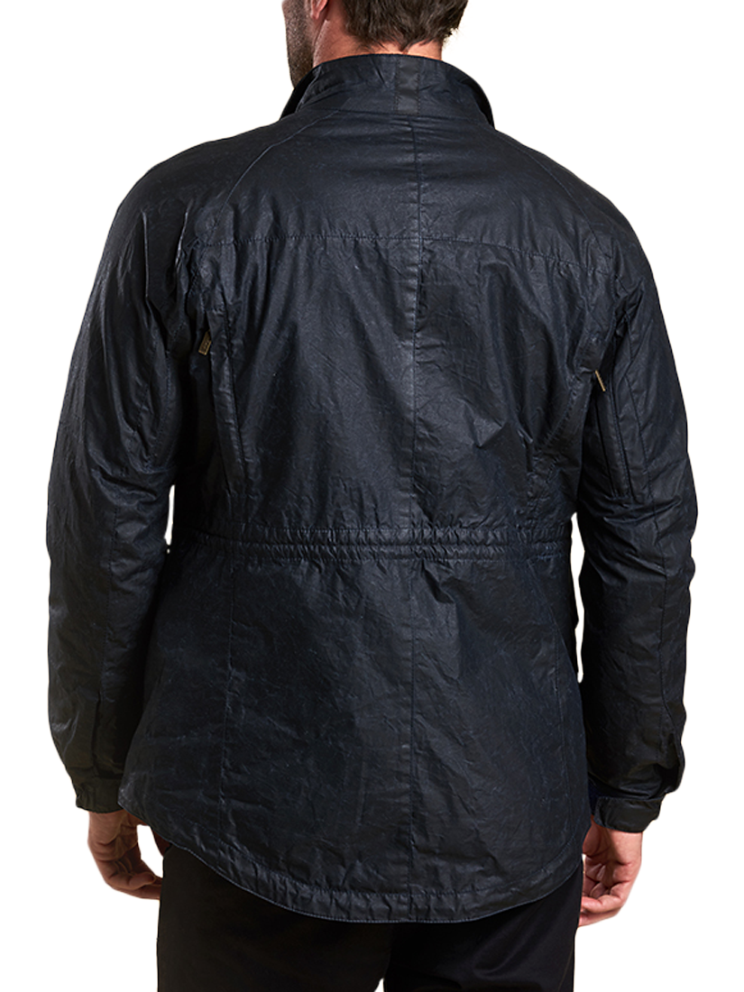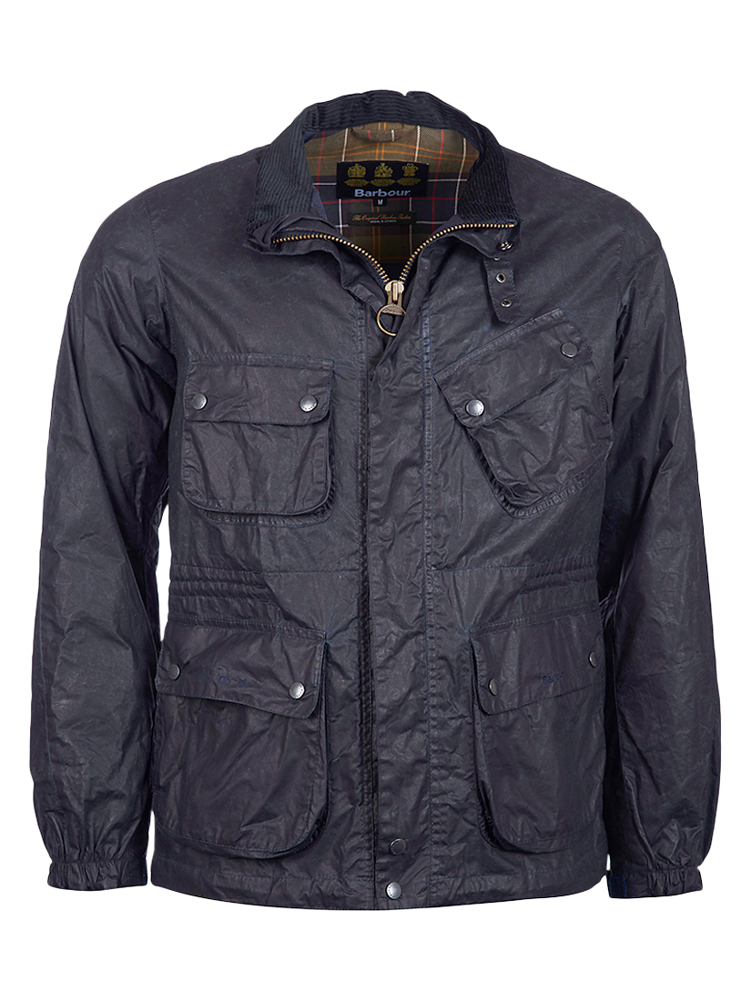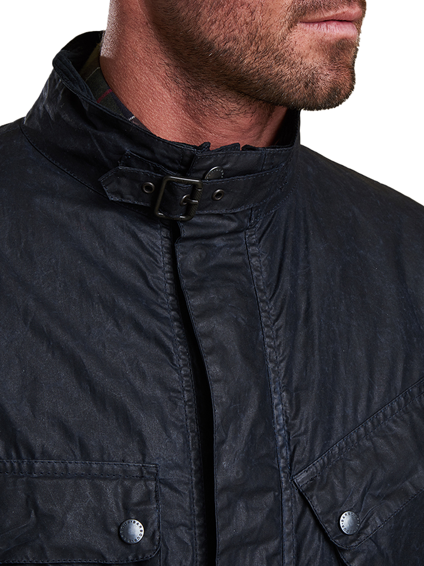 Crafted from the brand's 4oz Drywax waxed cotton, it features a signature tartan cotton lining, dropped back hem, stand collar with roller buckle, four front pockets including an easy-access angled pocket, and zipped vents to the rear and sleeve.