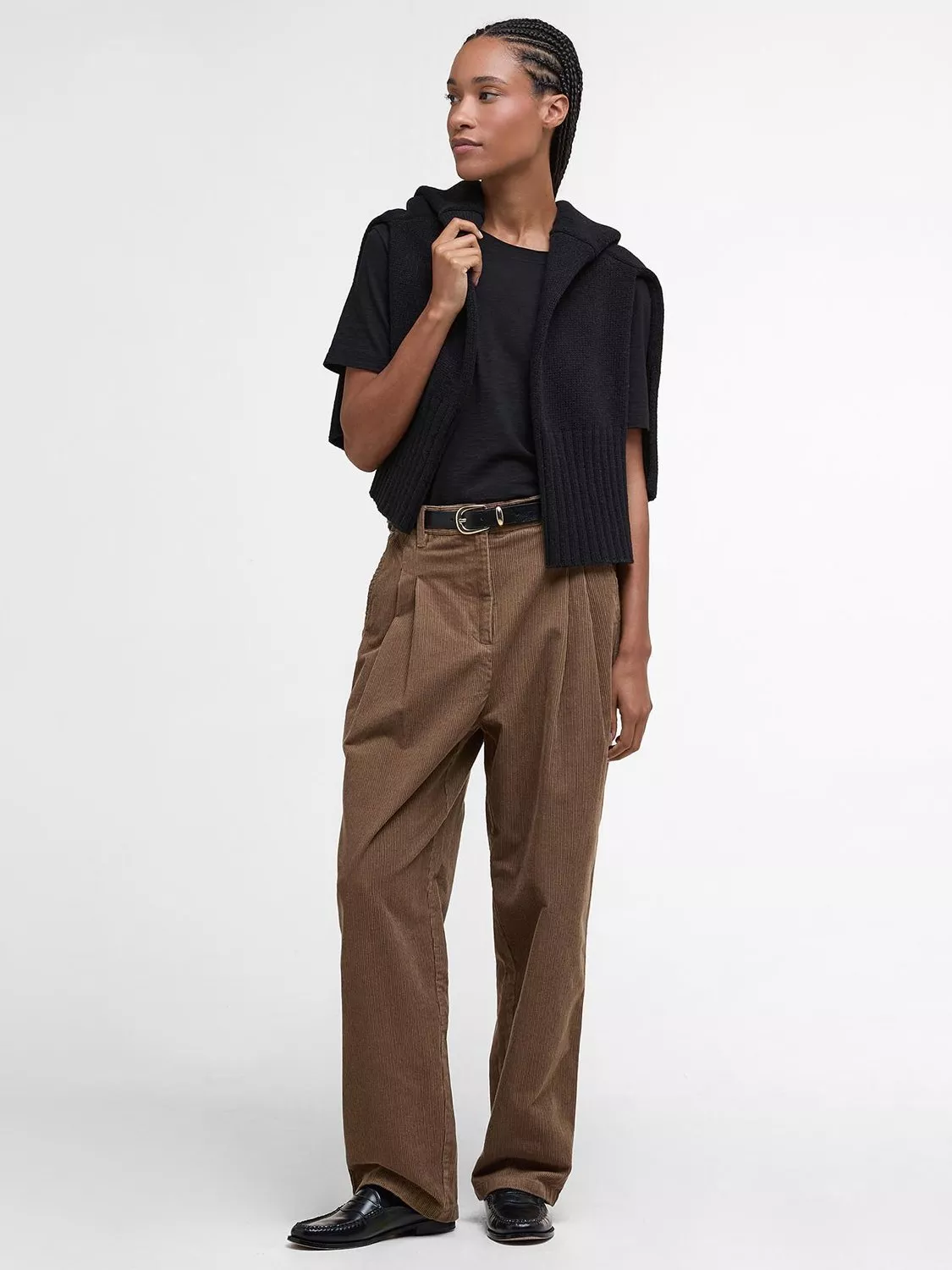 Experience the perfect blend of comfort and style with the Barbour Yasmin Cord Trousers. Crafted from soft cotton cord, these relaxed-fit trousers feature refined details like herringbone tape adjusters and D-rings at the waistband for a tailored touch. Front pleats add a subtle polish, making them as versatile as they are effortless. Everyday comfort meets timeless style—these are the trousers you'll find yourself reaching for time and time again.