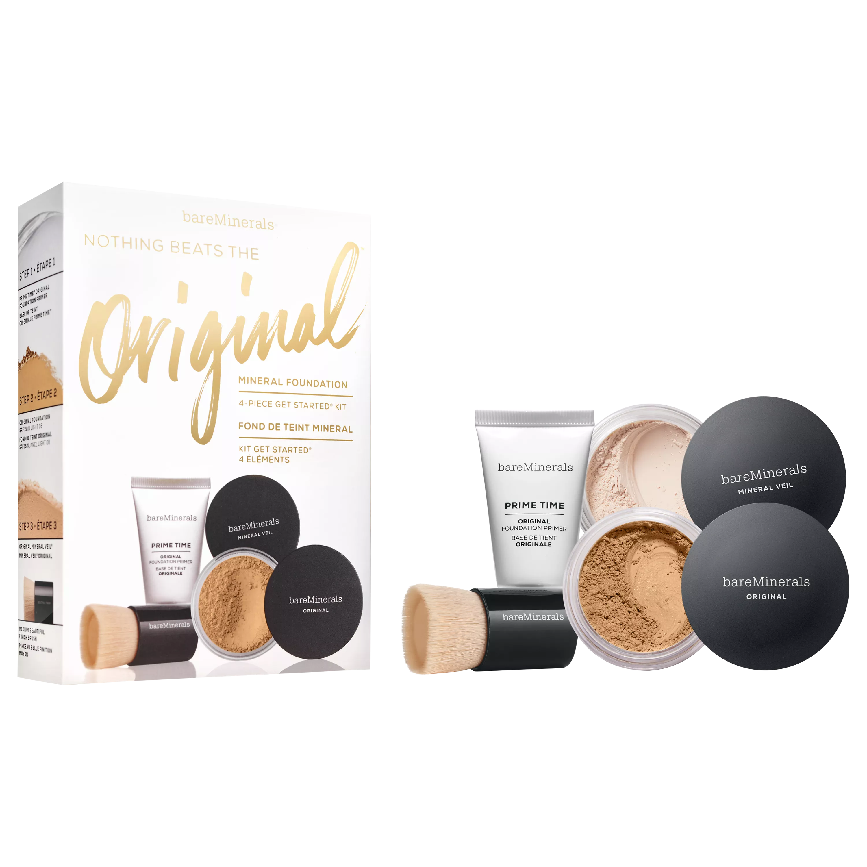 A beautifully bare complexion in one perfect kit. What if a foundation could cover everything, but feel like nothing? Achieve a natural, luminous finish and all-day skin-loving coverage with bareMinerals New Get Started Kit.
