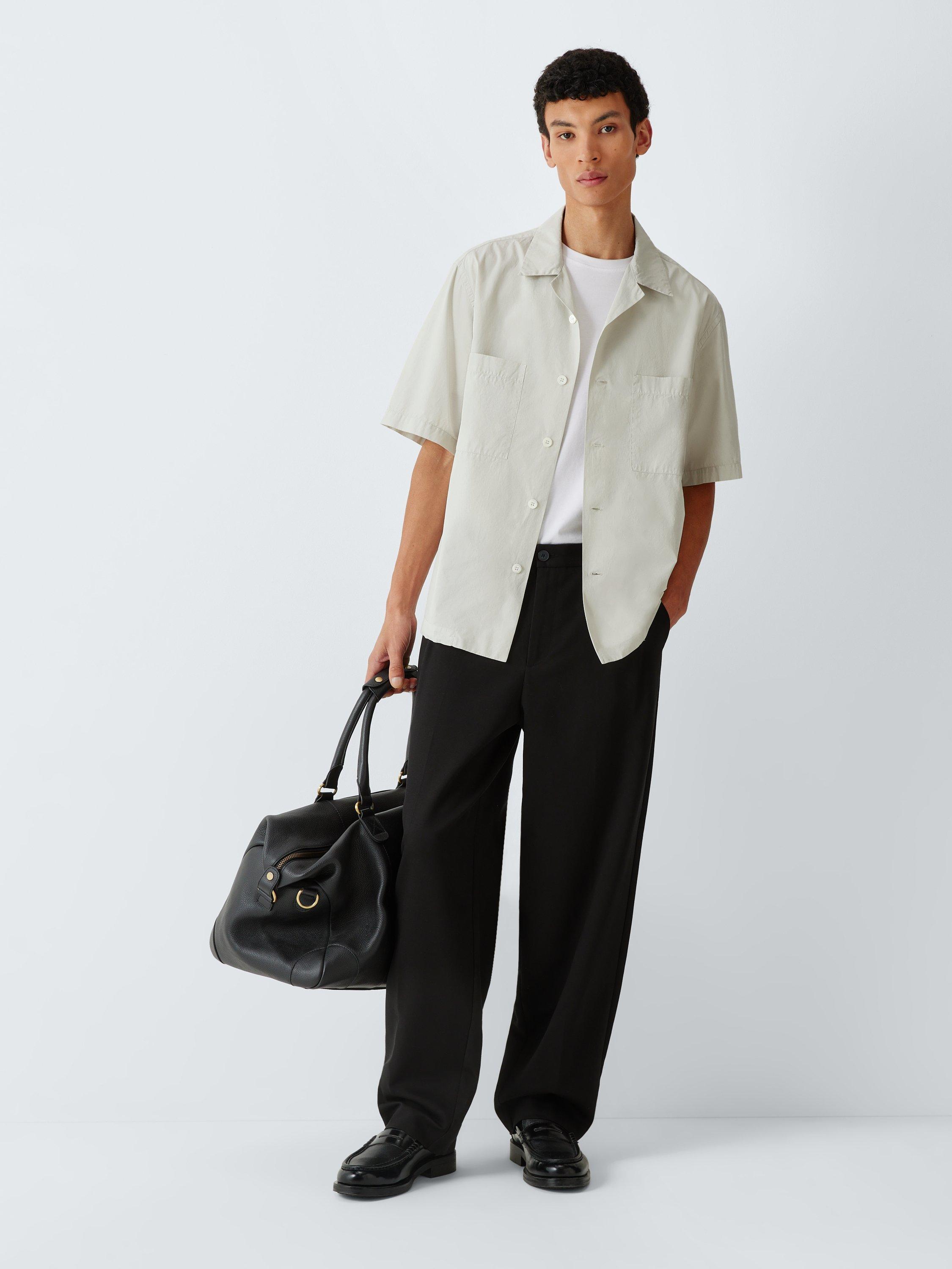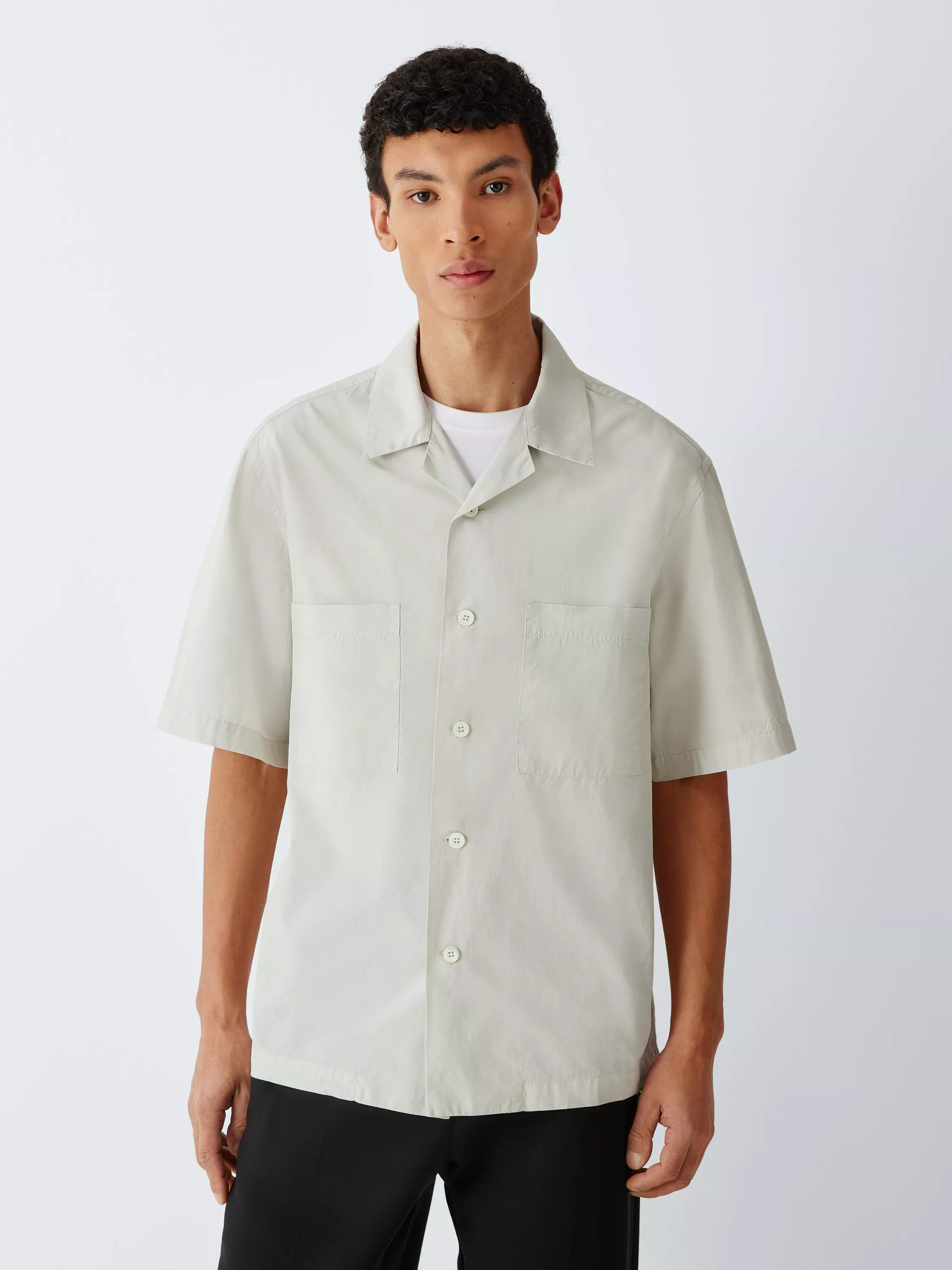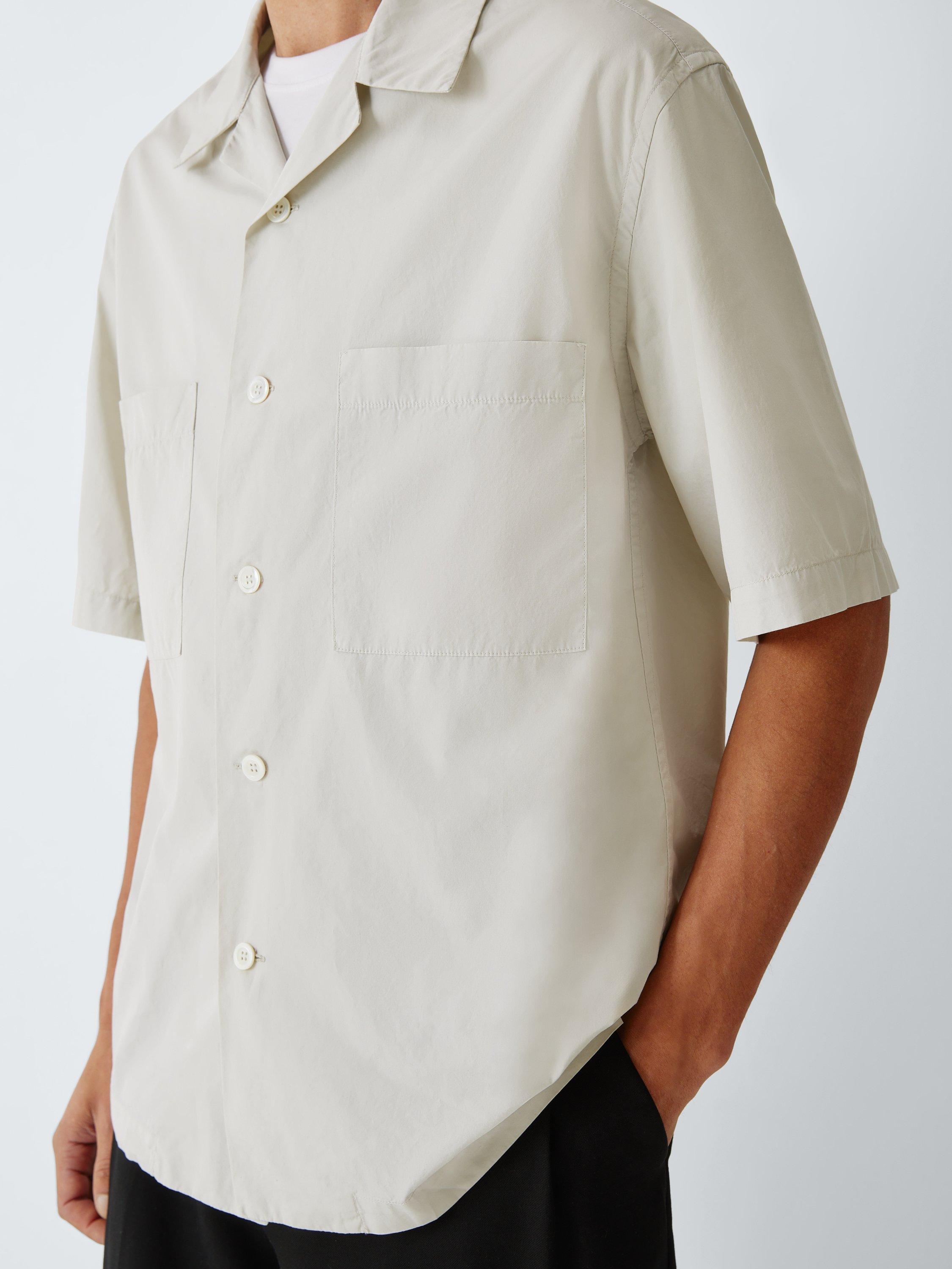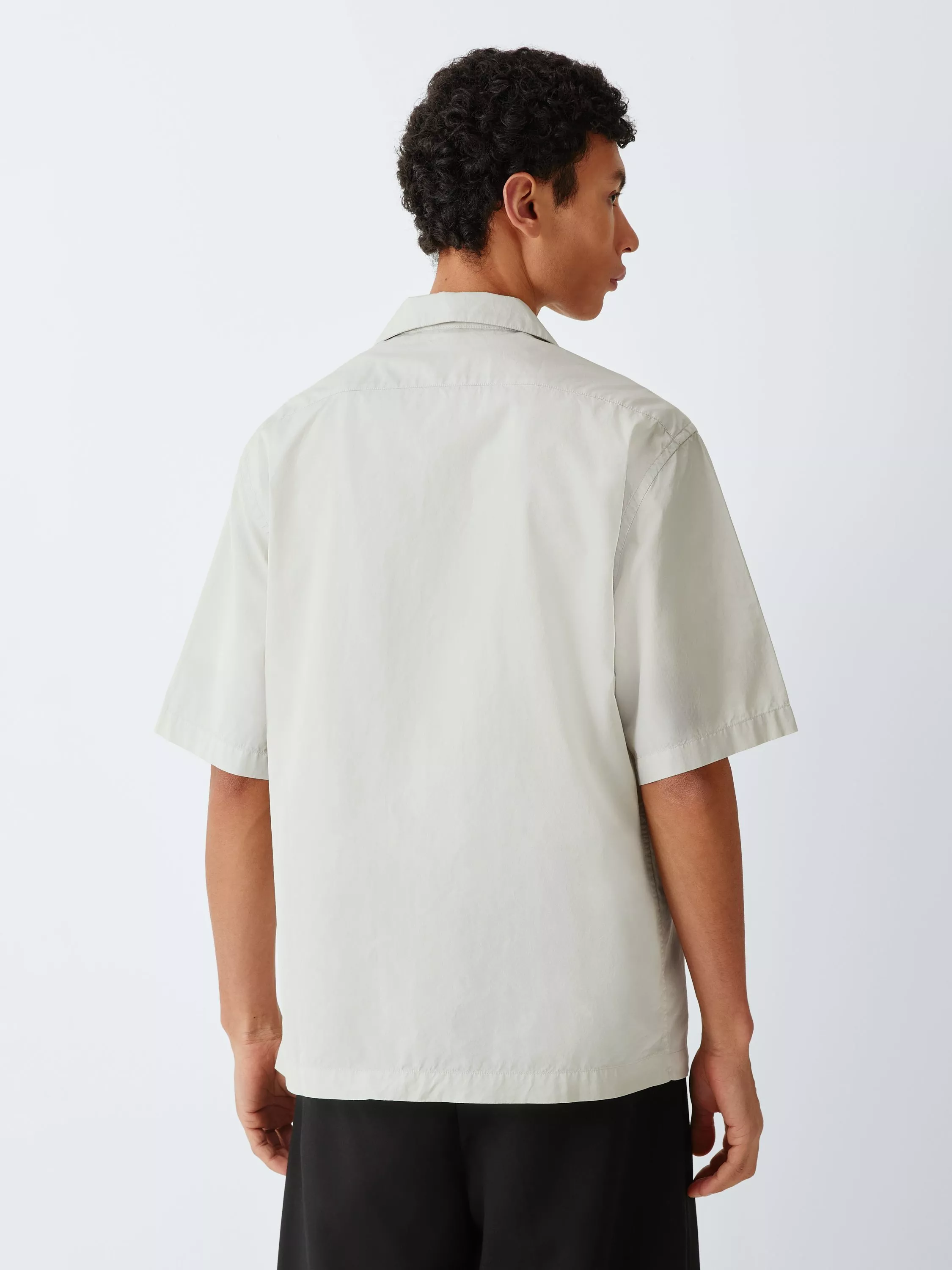 Short sleeves shirt featuring open spread collar, button closure at frontend, dropped shoulders. Made of high-quality double-twist popeline, garment-dyed.