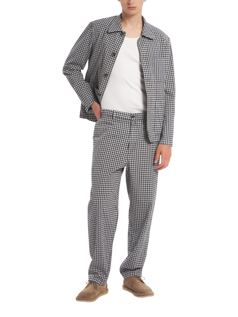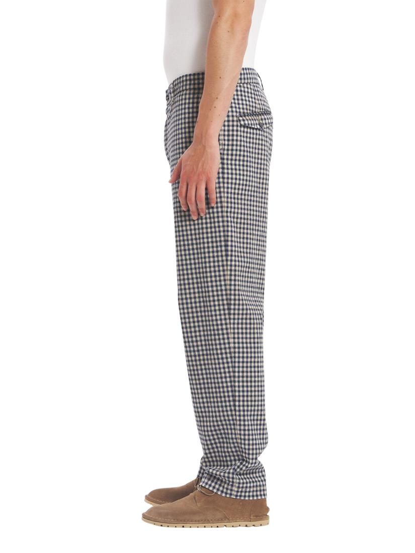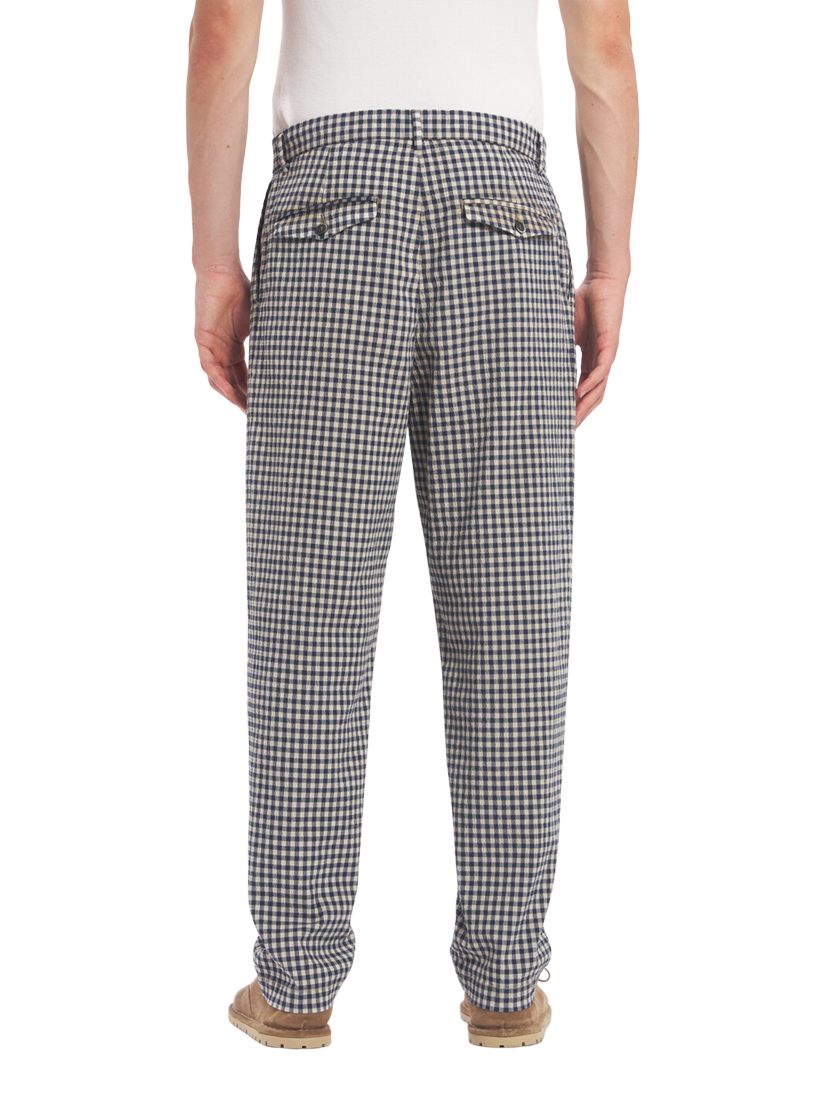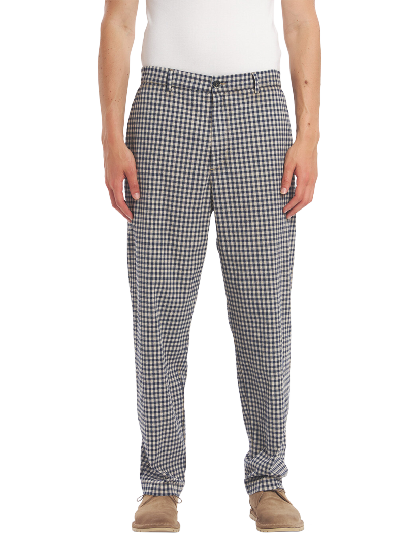 Classic flat front chino trousers made in in a check pattern seersucker, stretch overdyed cotton blend.