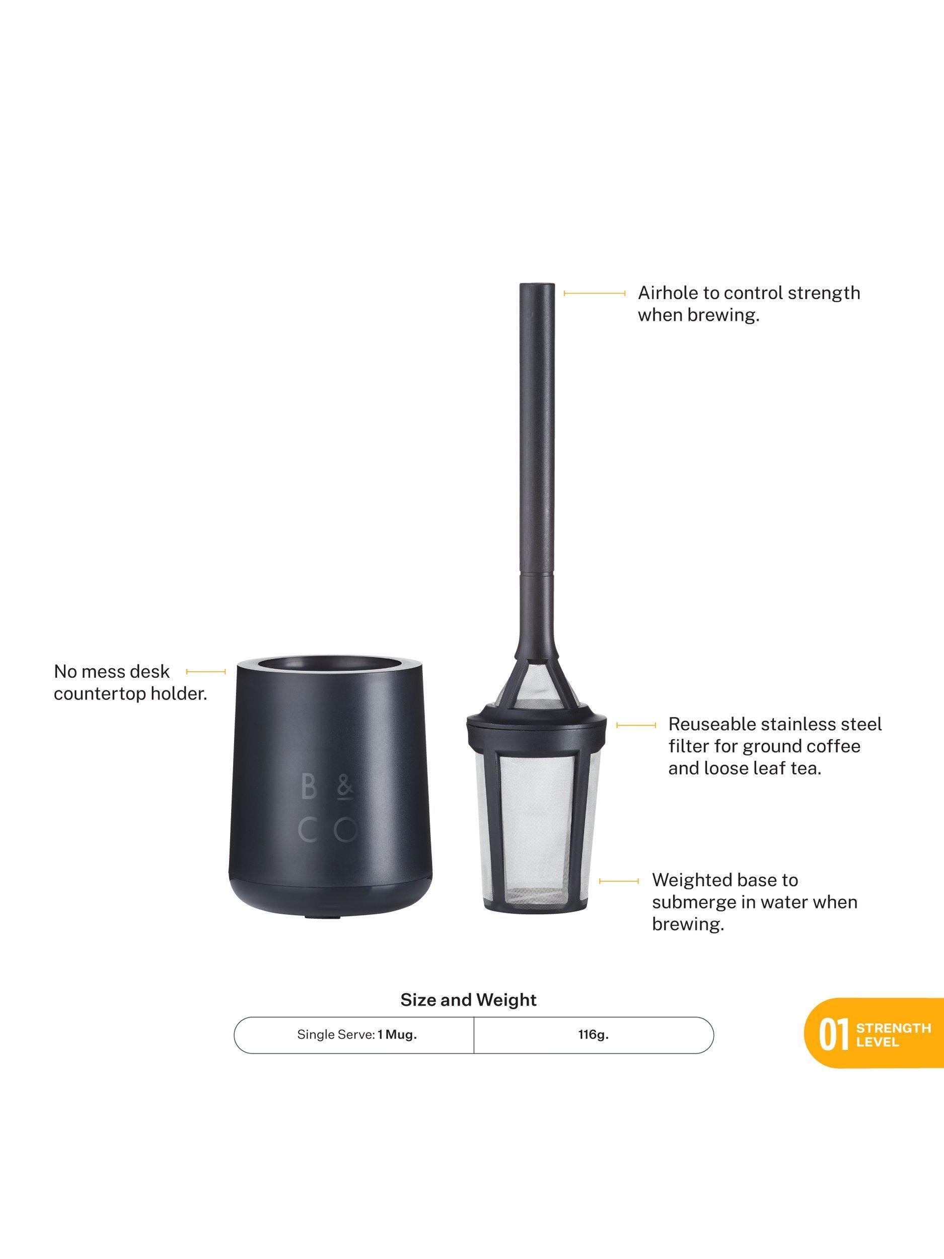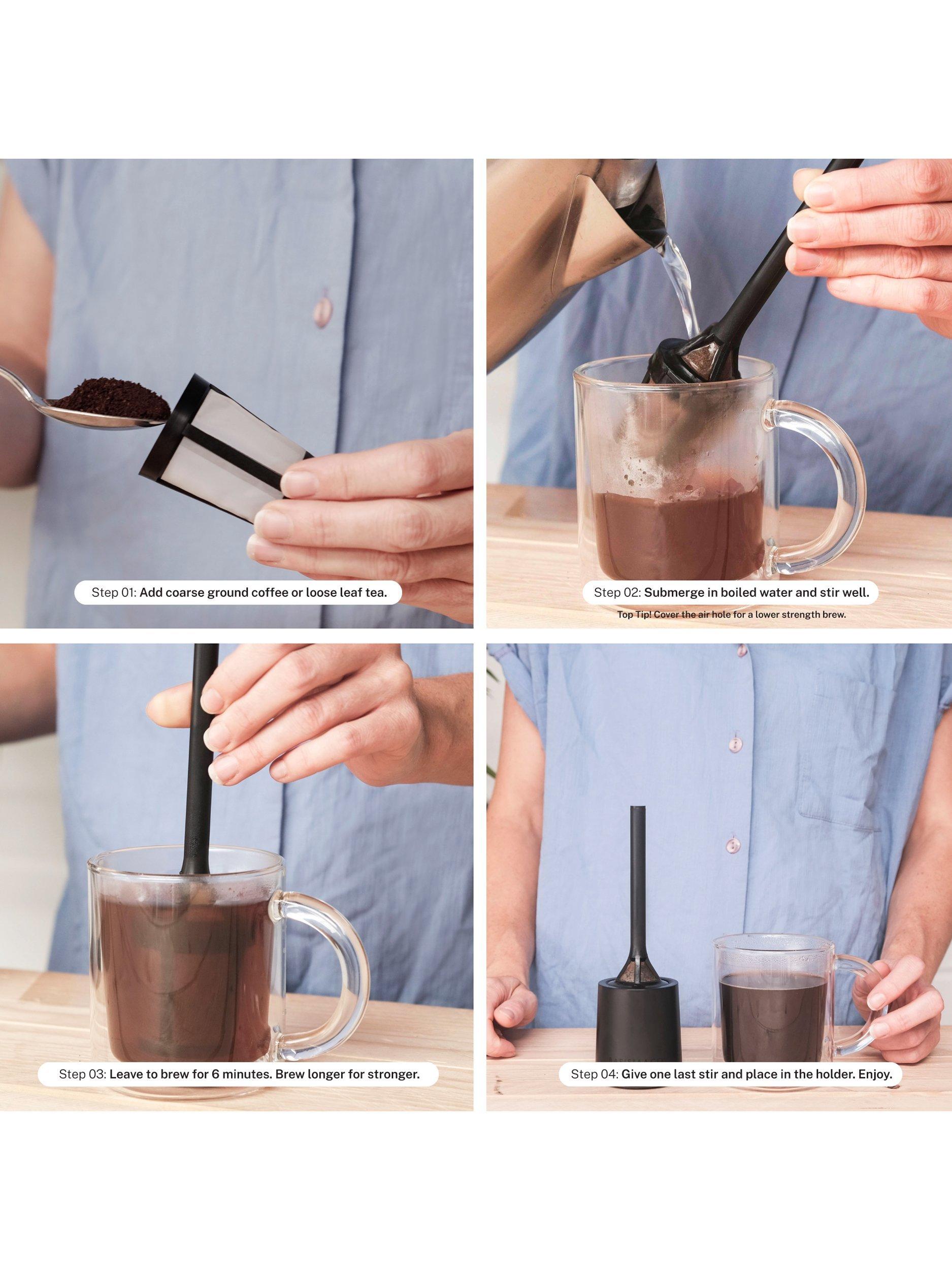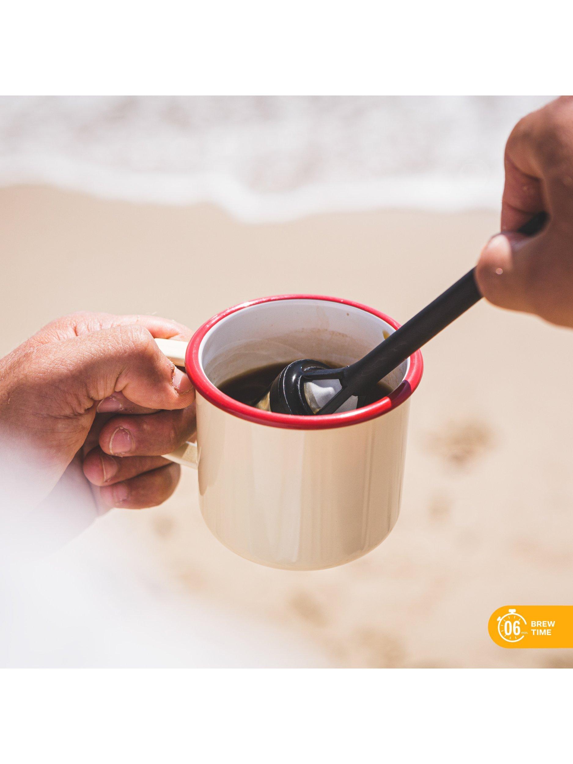 Designed as a lower-strength brewer for those who enjoy lighter coffee. You can control the strength by increasing the brew time and ensuring the air hole at the top of the handle is not covered when stirring. Designed in the UK and made with hard-wearing materials, the Brew It Stick is durable and dishwasher-safe. The stainless steel filter is reusable, reducing waste and saving money.