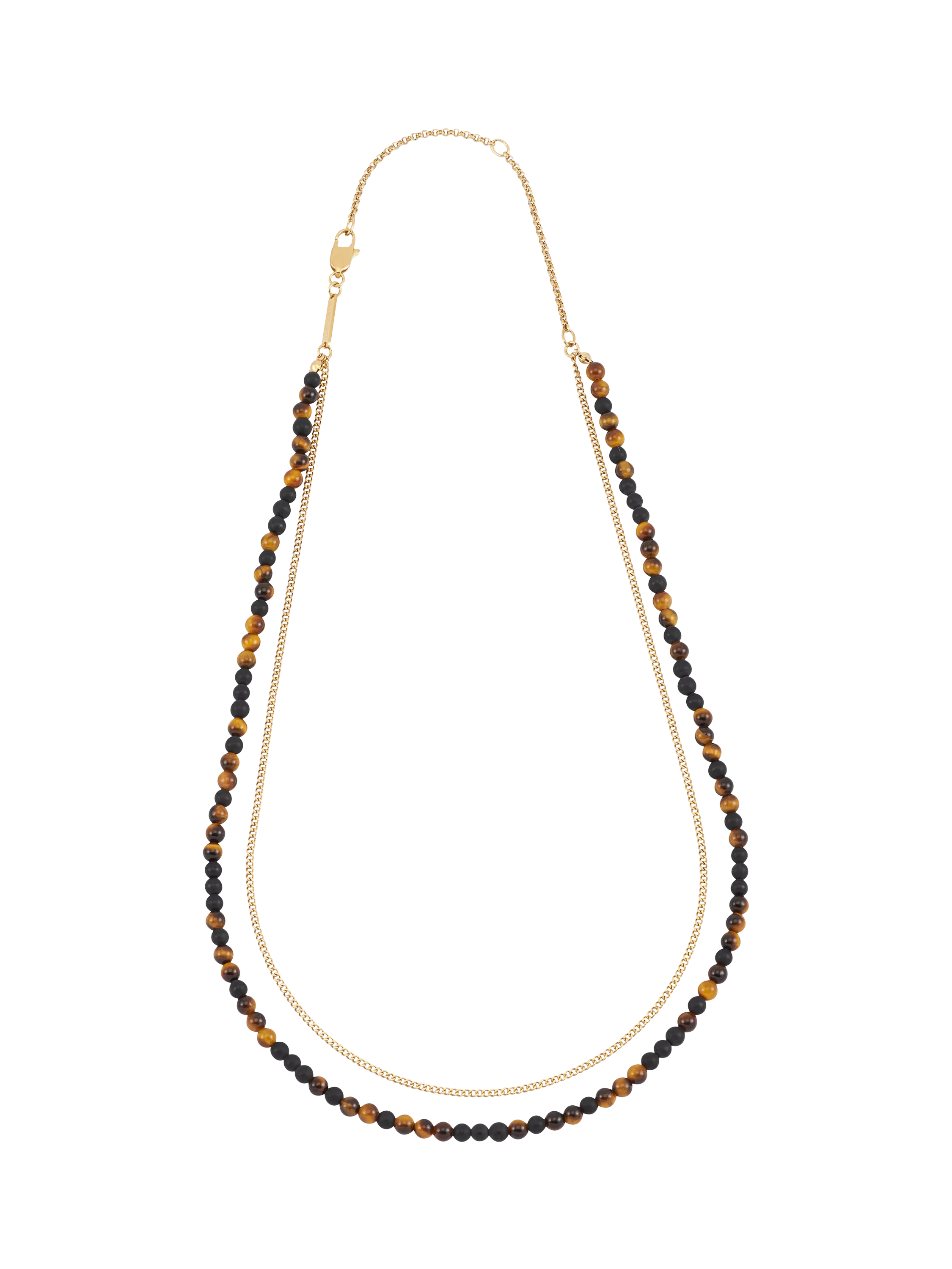 BARTLETT LONDON’s multi-row necklace pairs onyx and tiger’s eye, adding character to any look. Designed for easy fastening and everyday versatility, it’s made to elevate your personal style.