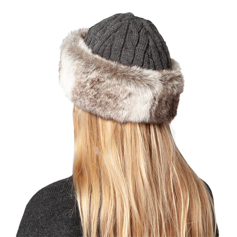 The hat is trimmed with faux fur for a super cosy feel, and features a chunky knit design across the rest of the fabric.